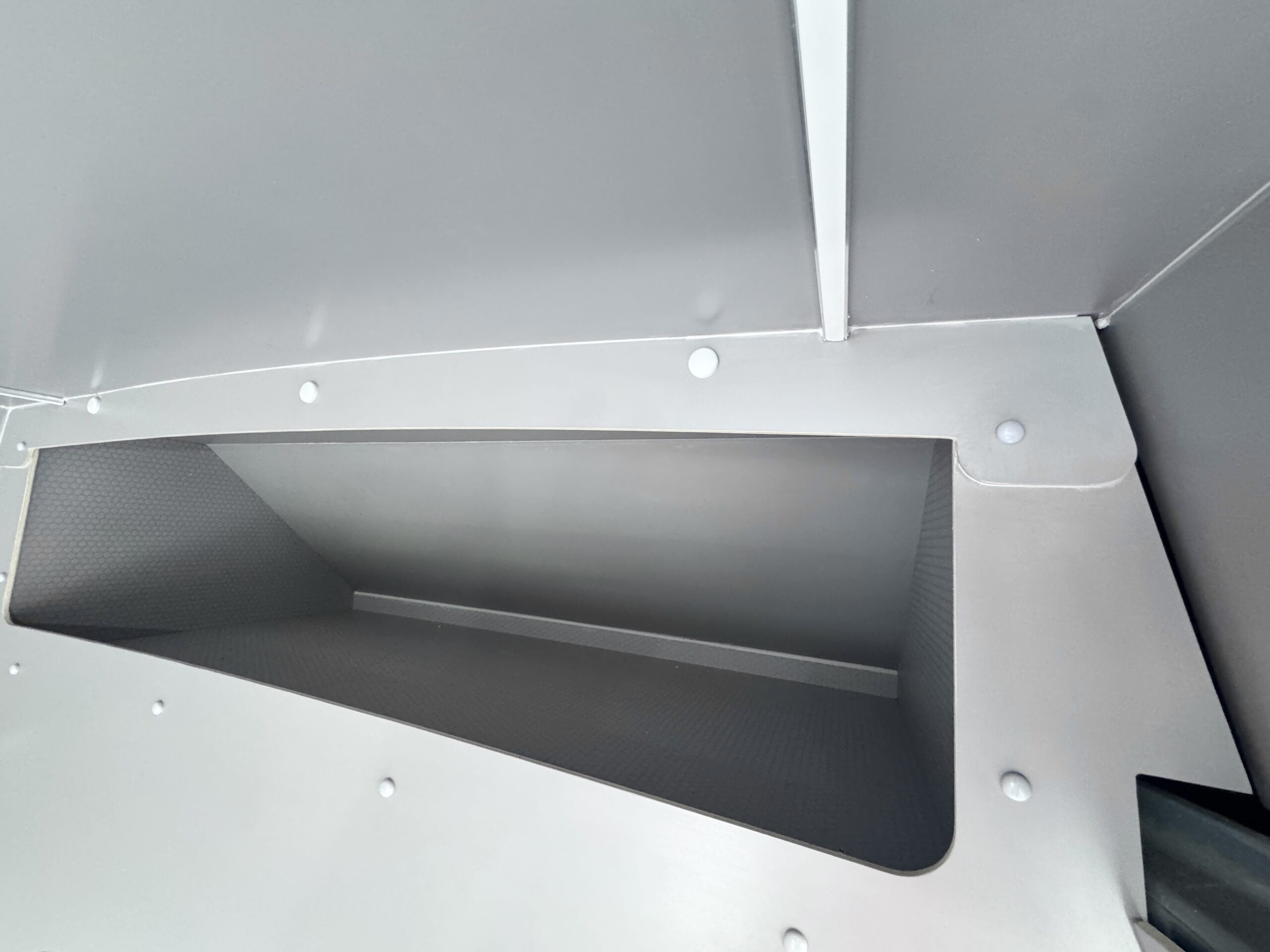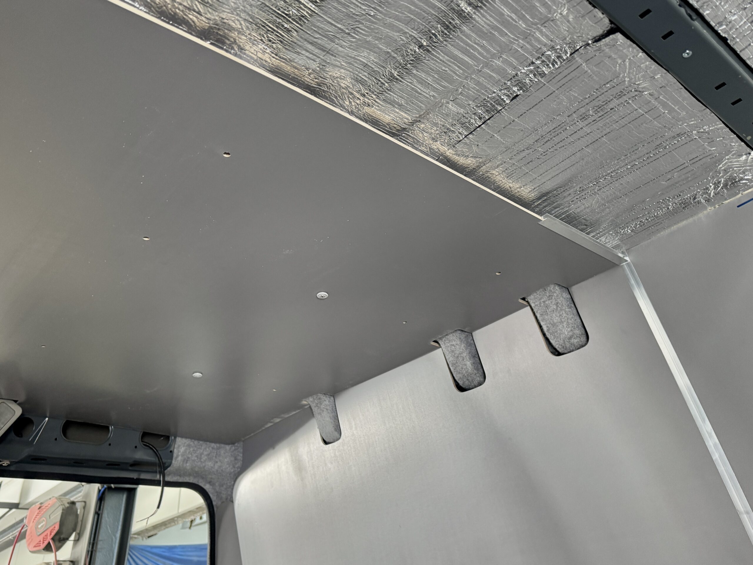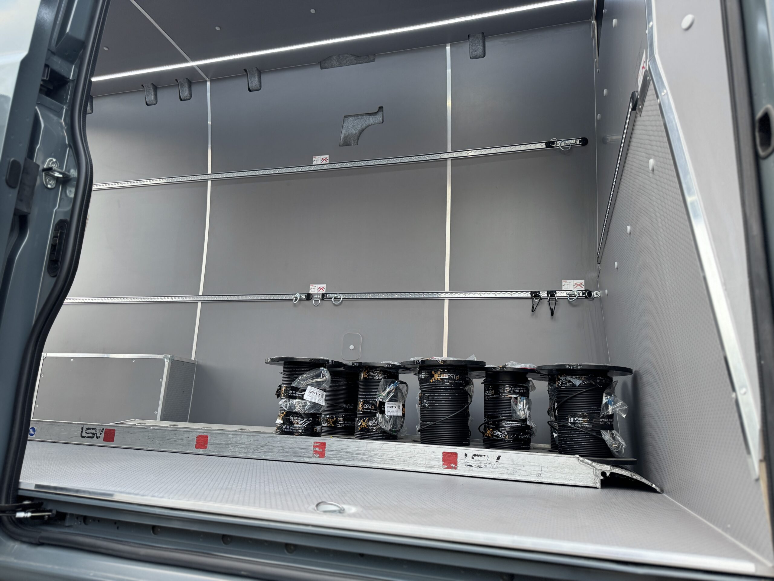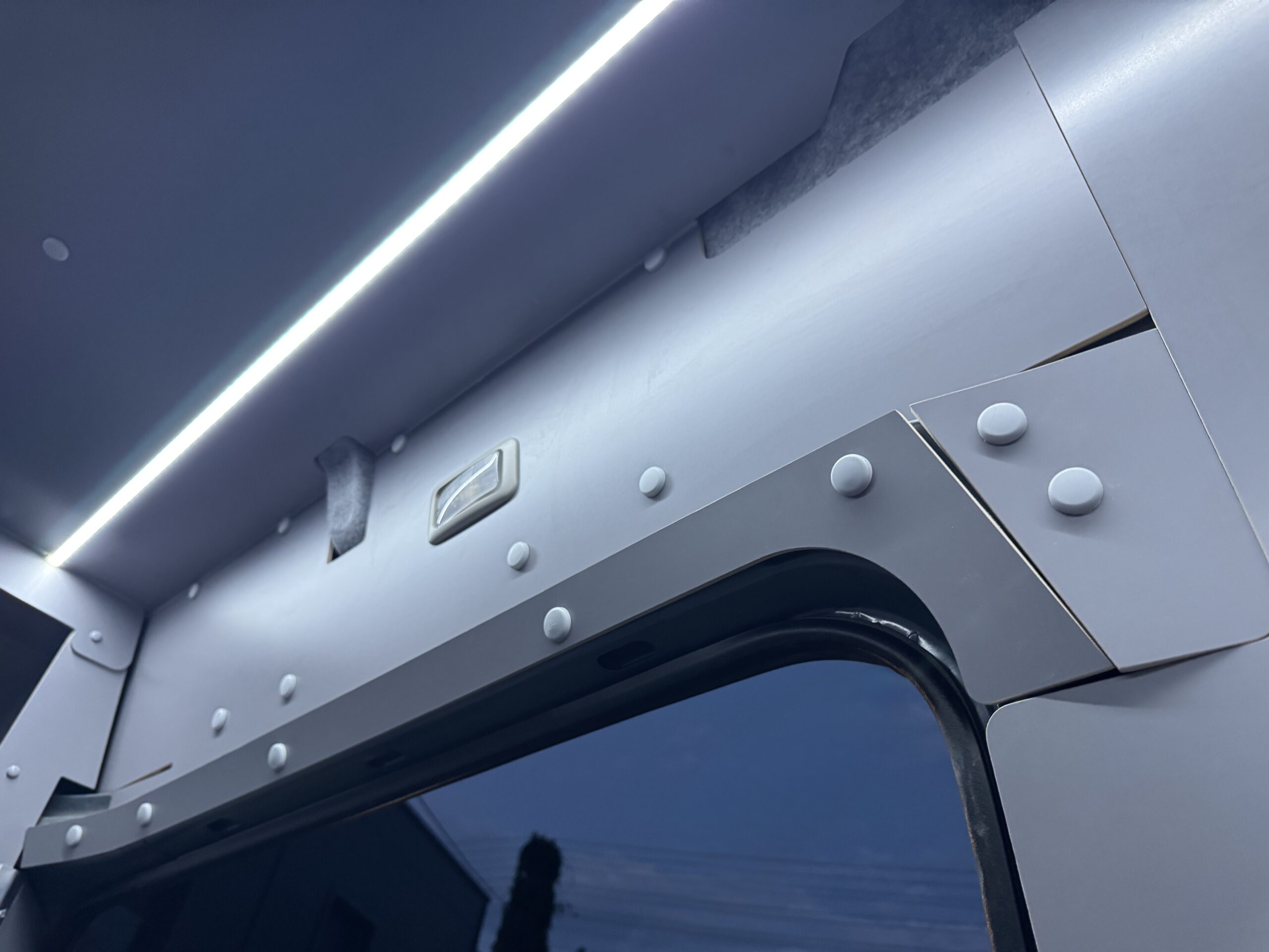 Przestrzeń nad kabiną zabudowaliśmy w taki sposób, aby stworzyć dodatkową półkę. Ścianę grodziową wykończyliśmy materiałami premium w kolorze szarym, co zapewnia spójny i profesjonalny wygląd pojazdu. Dodatkowo całość pokryliśmy matą butylową o grubości 2,3 mm, która redukuje drgania i poprawia wygłuszenie.