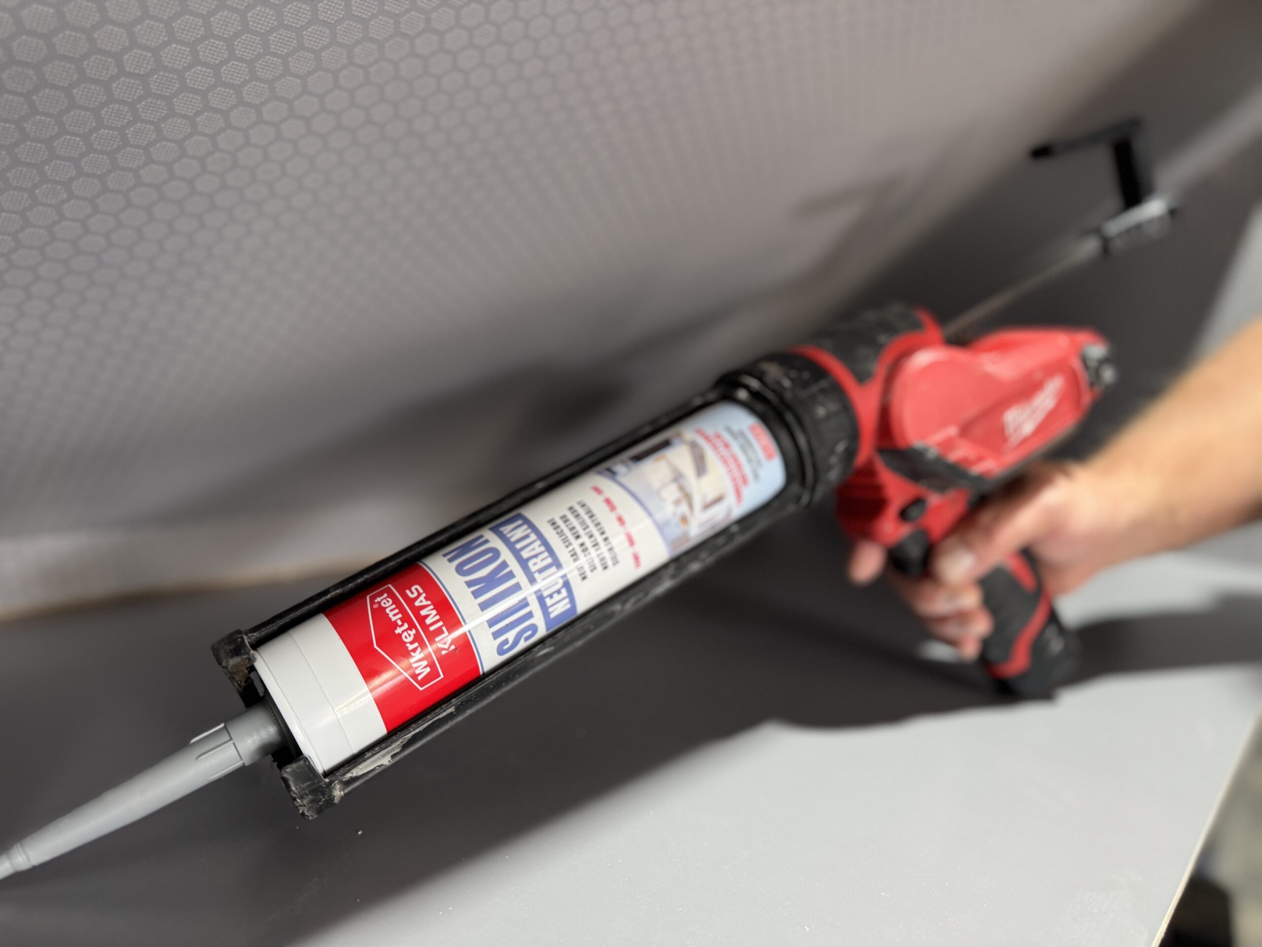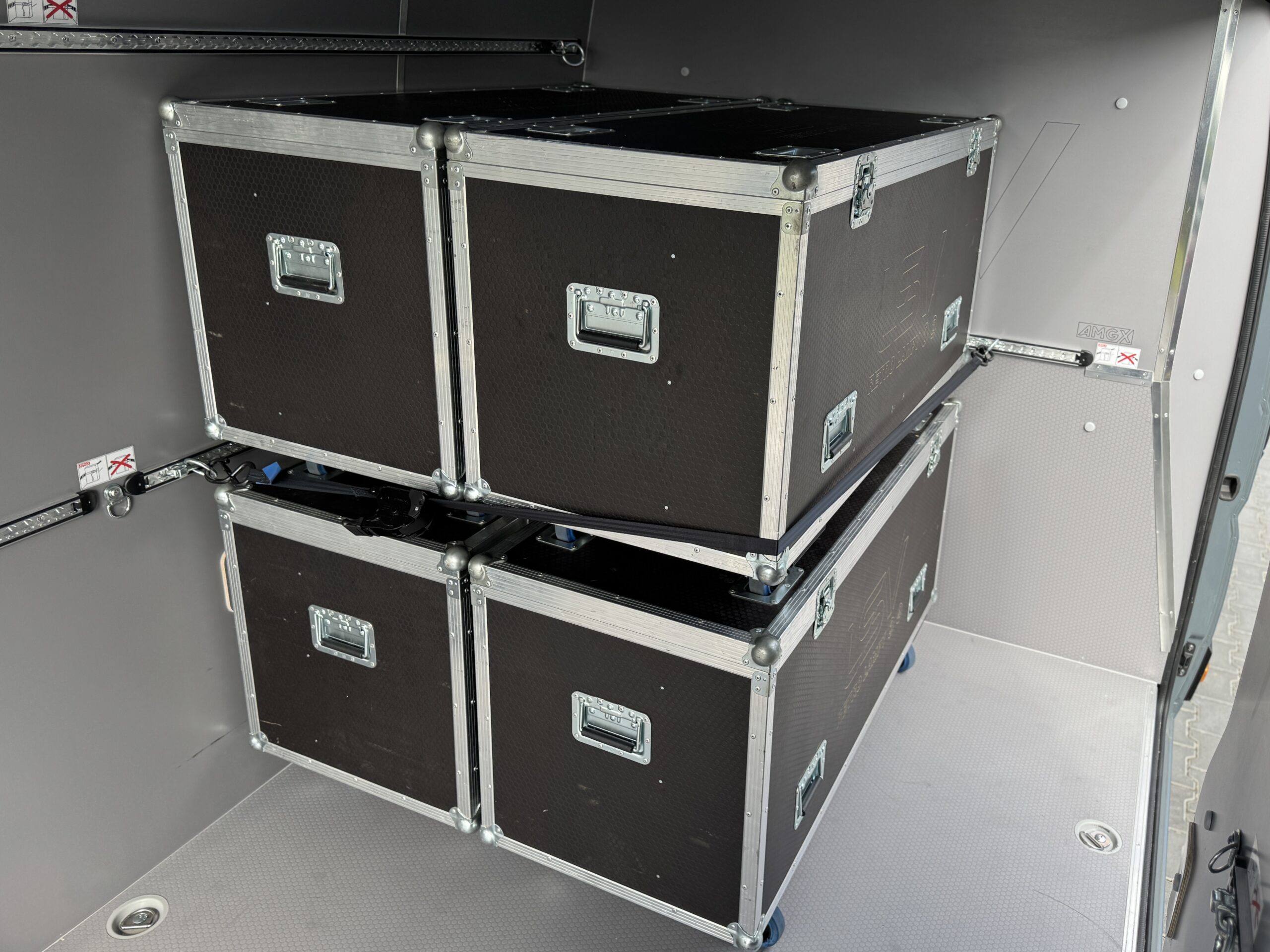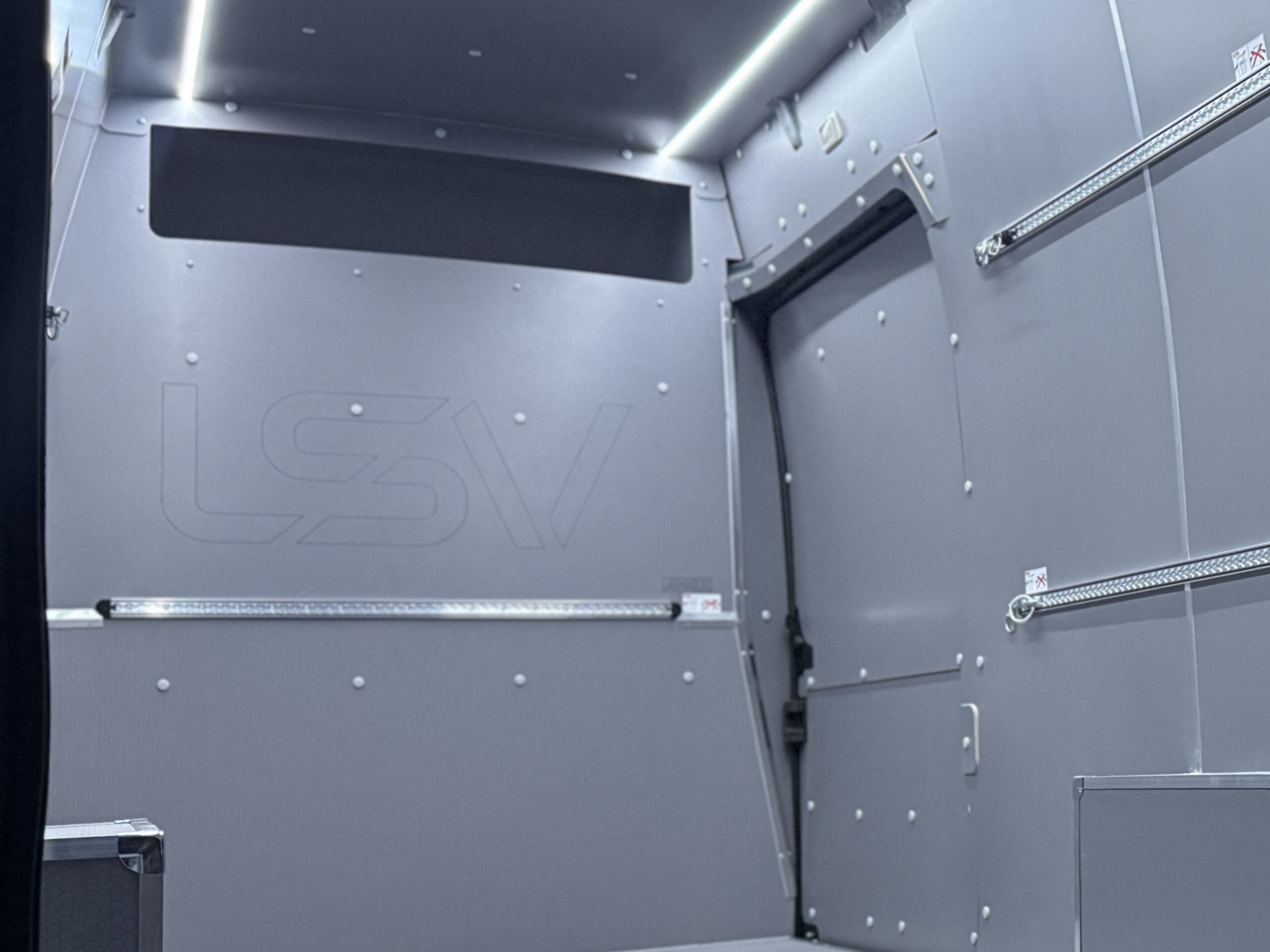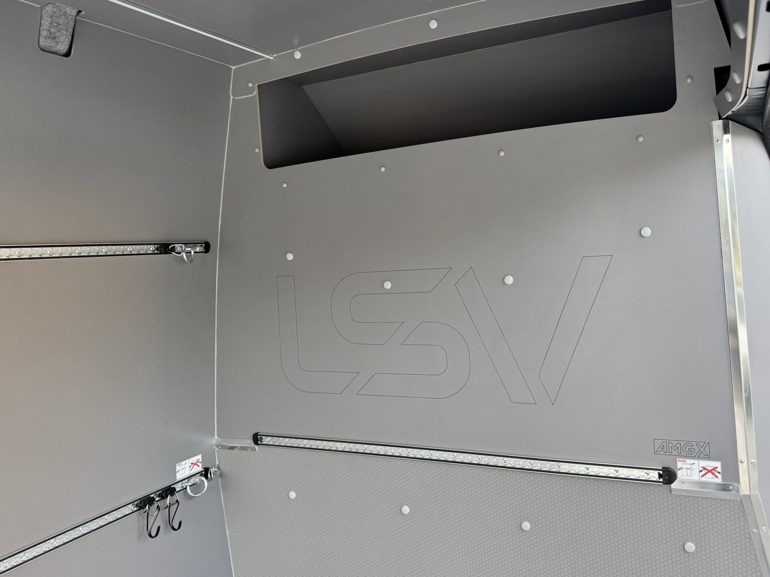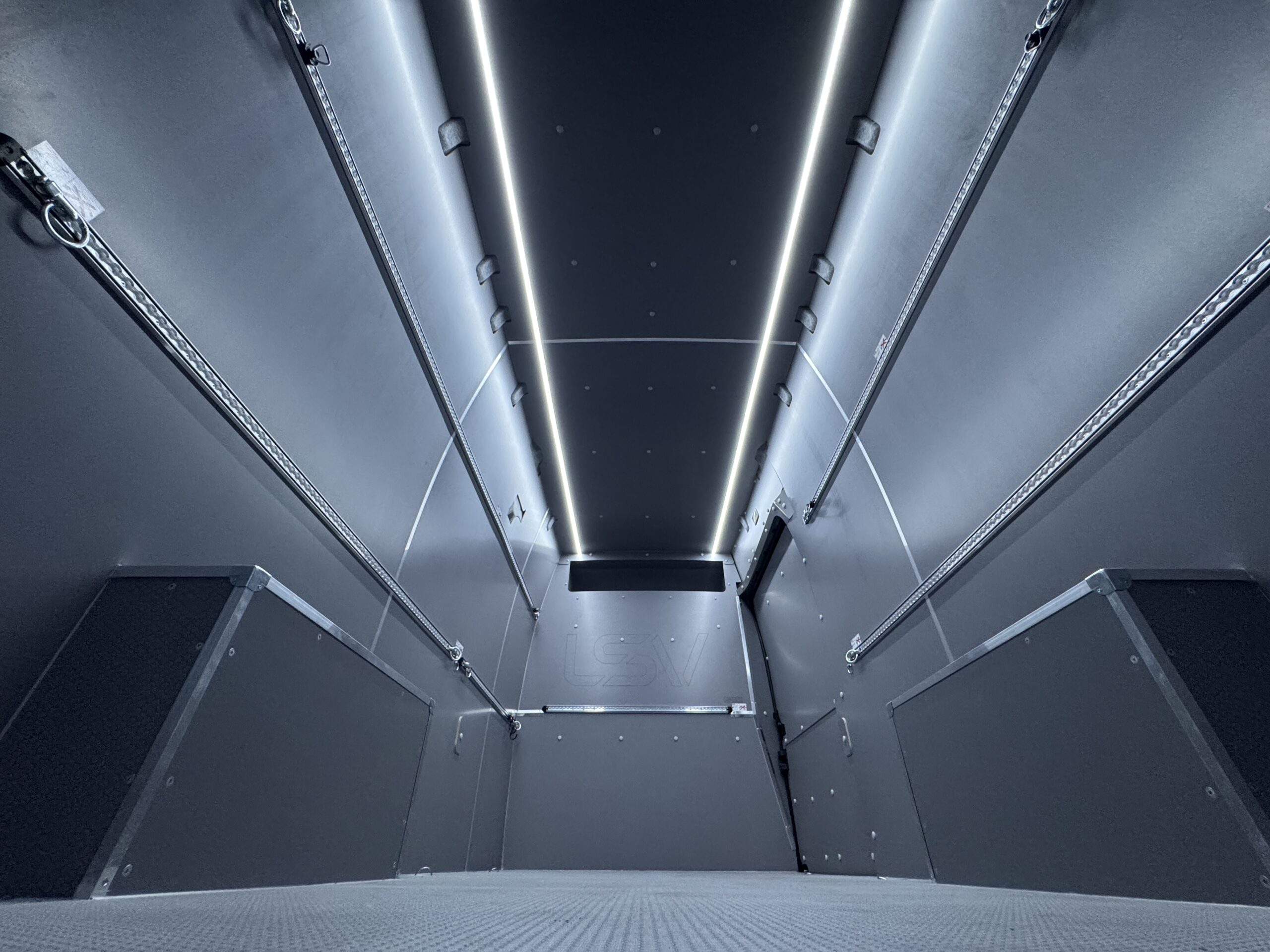Przestrzeń nad kabiną zabudowaliśmy w taki sposób, aby stworzyć dodatkową półkę. Ścianę grodziową wykończyliśmy materiałami premium w kolorze szarym, co zapewnia spójny i profesjonalny wygląd pojazdu. Dodatkowo całość pokryliśmy matą butylową o grubości 2,3 mm, która redukuje drgania i poprawia wygłuszenie.