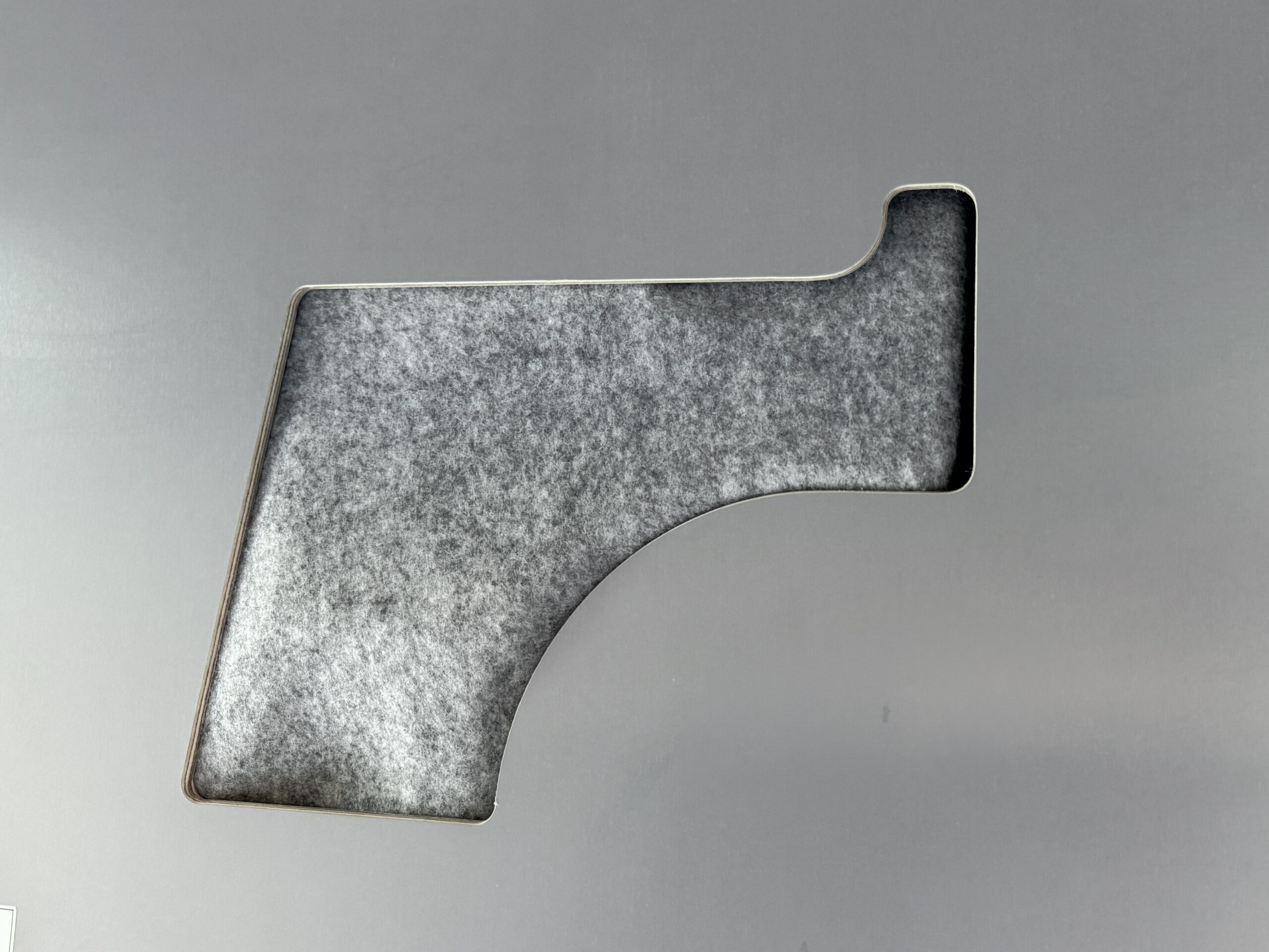 Aby wnętrze prezentowało się estetycznie, zastosowaliśmy filc techniczny. Materiał z delikatnego włókna poliestrowego nie tylko wykańcza powierzchnię, ale również dodaje warstwę tłumienia dźwięków. Filc jest gęsty, przyjemny w dotyku i dobrze przylega do gładkich powierzchni.