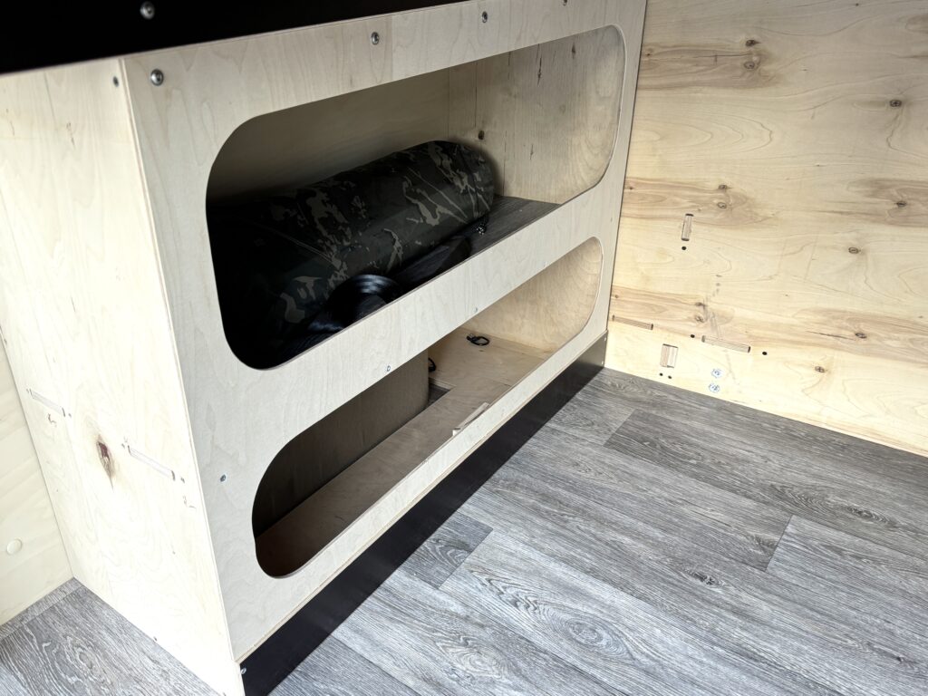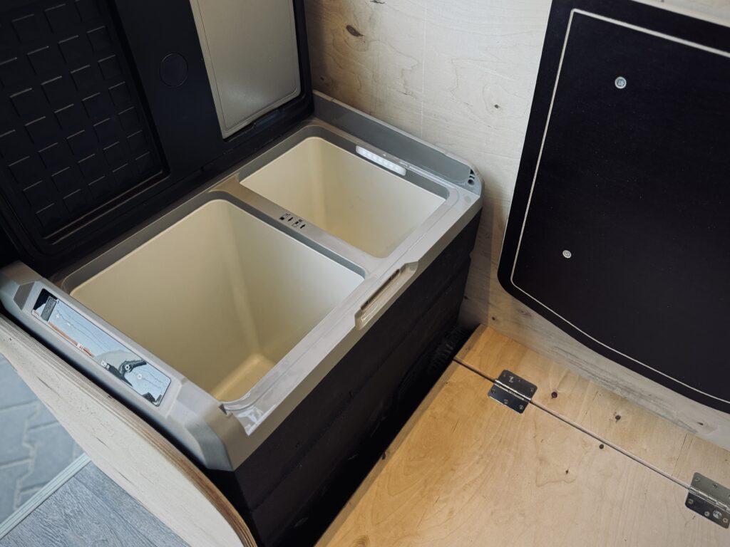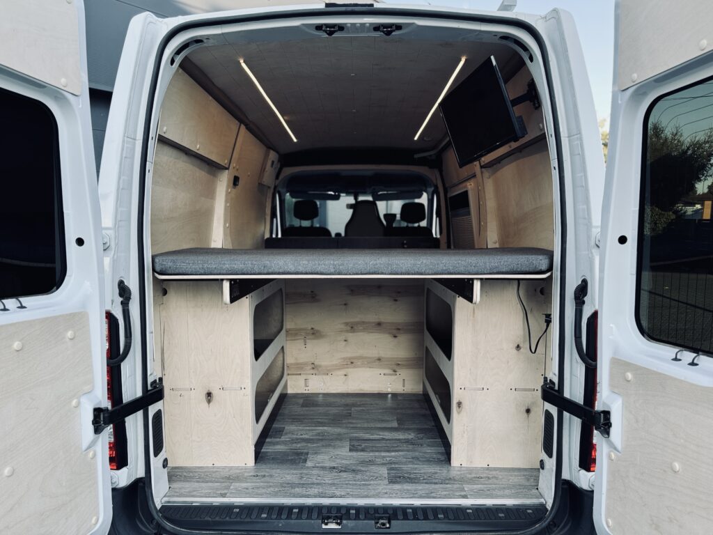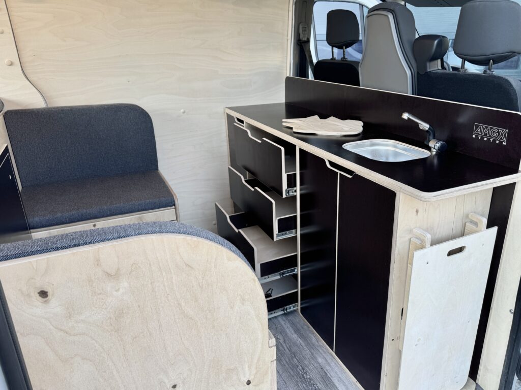 Nasza zabudowa oferuje przestrzeń do spania, która zapewnia wygodny sen podczas długich podróży. Komfortowe łóżko, odpowiednia wentylacja oraz przyjemne materiały wykończeniowe sprawiają, że nocleg w tym kamperze to czysta przyjemność. Dodatkowo zabudowa kuchenna, która pozwala na przygotowanie posiłków w dowolnym miejscu, wyposażona w duży blat roboczy i zlew z pojemnikiem na czystą i brudną wodę. Kamper posiada również mini lodówkę, która znajduje się w schowku i funkcjonalną toaletę, ukrytą w odpowiednio zaprojektowanej przestrzeni, która zapewnia komfort na każdym etapie podróży.