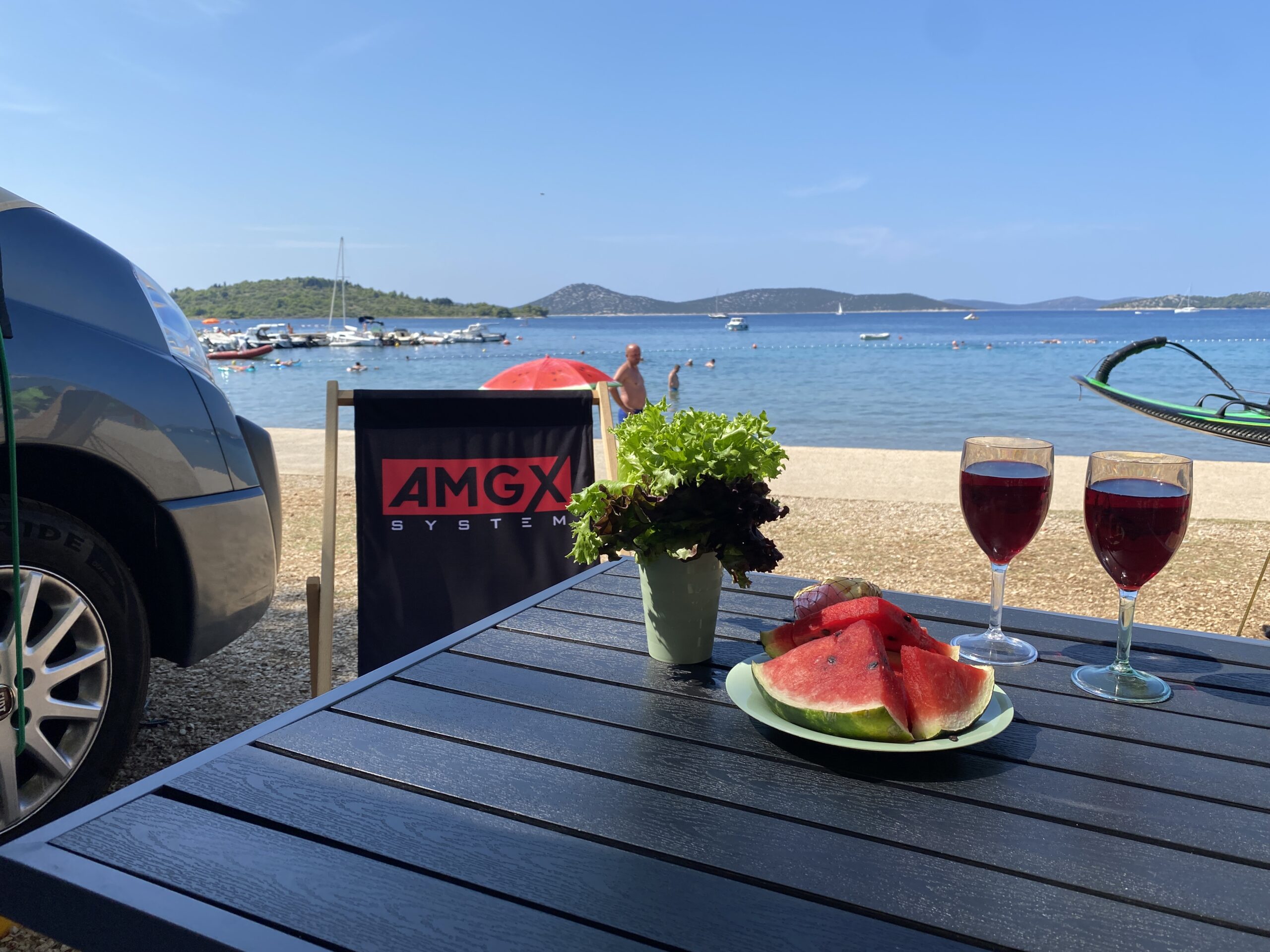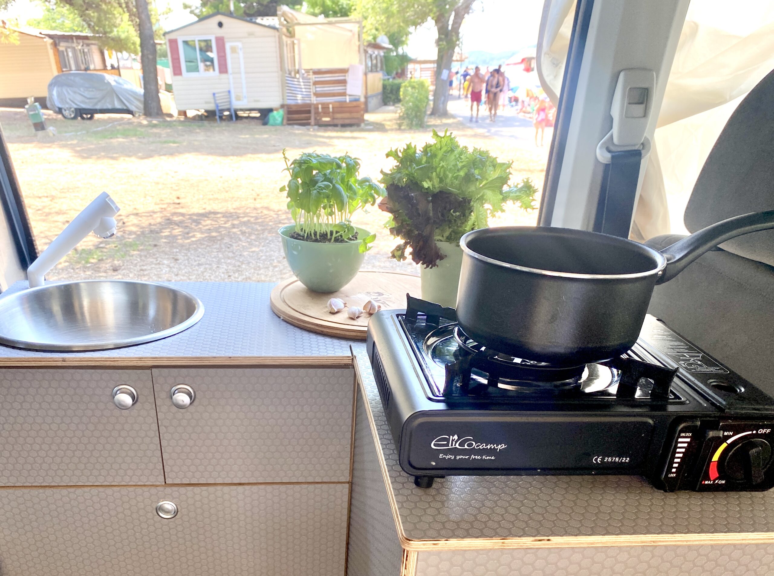 Moduł szafkowy z częścią kuchenną, lodówką i stolikiem, co umożliwia przygotowanie posiłków i relaks podczas podróży,
