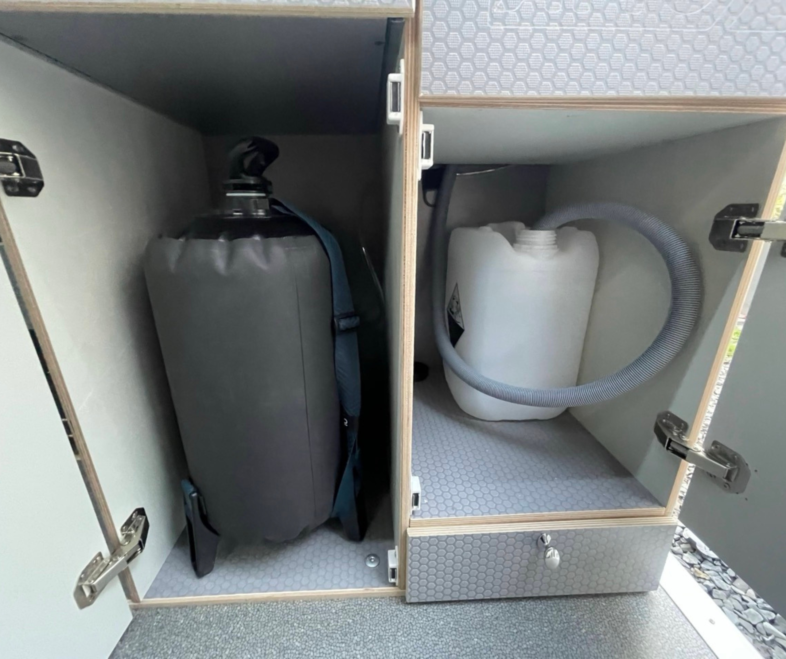 • Szafka kuchenna ze zbiornikami na czystą i szarą wodę,