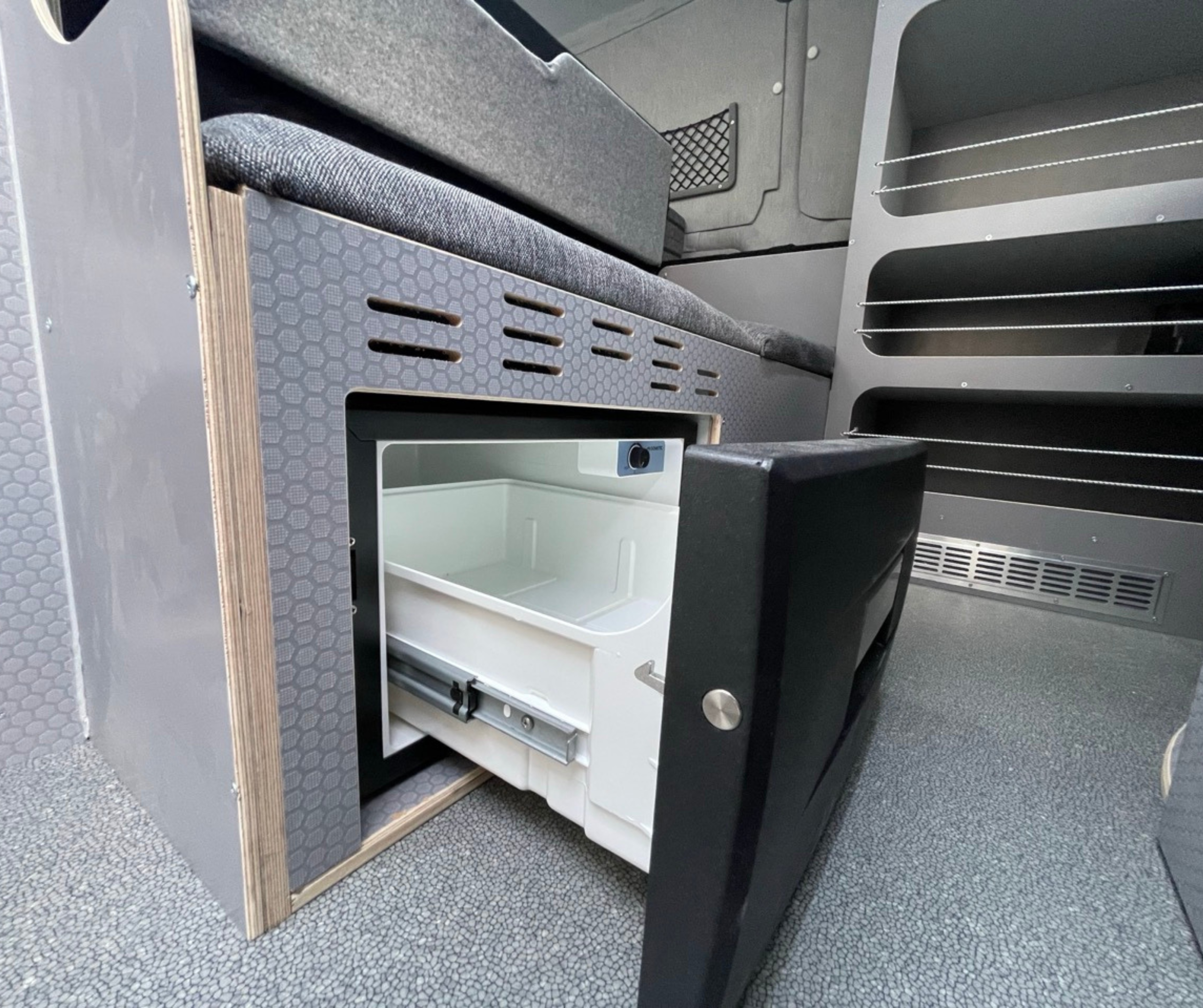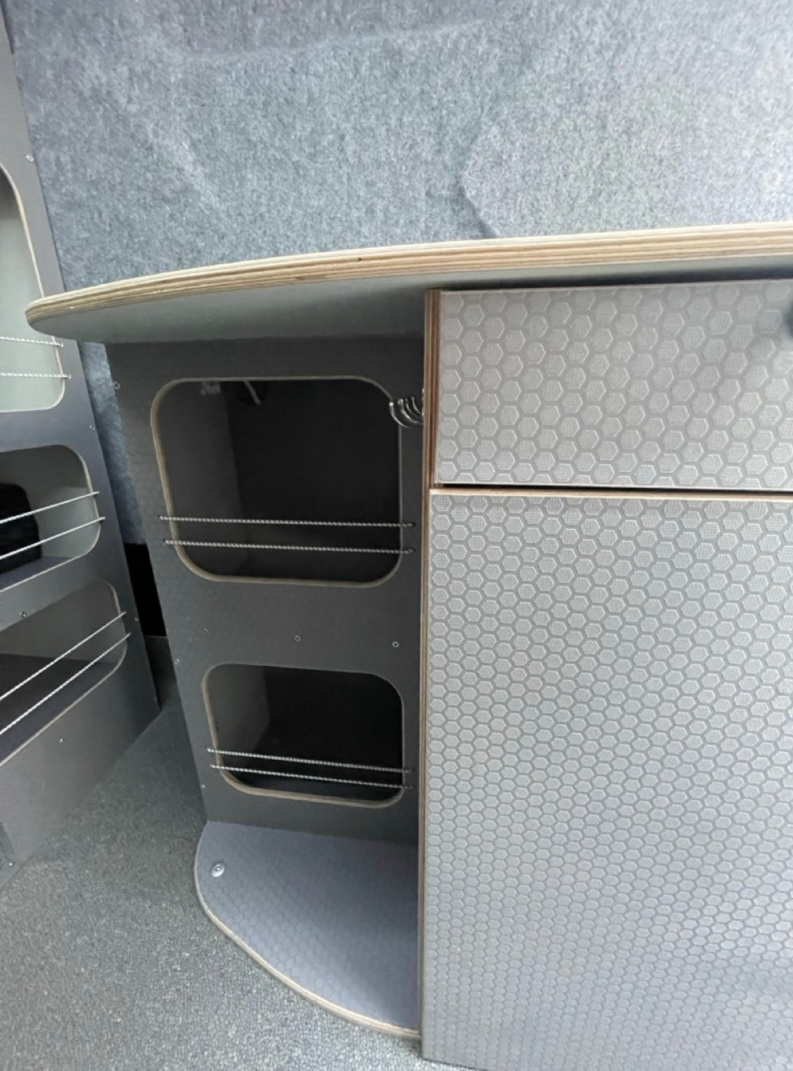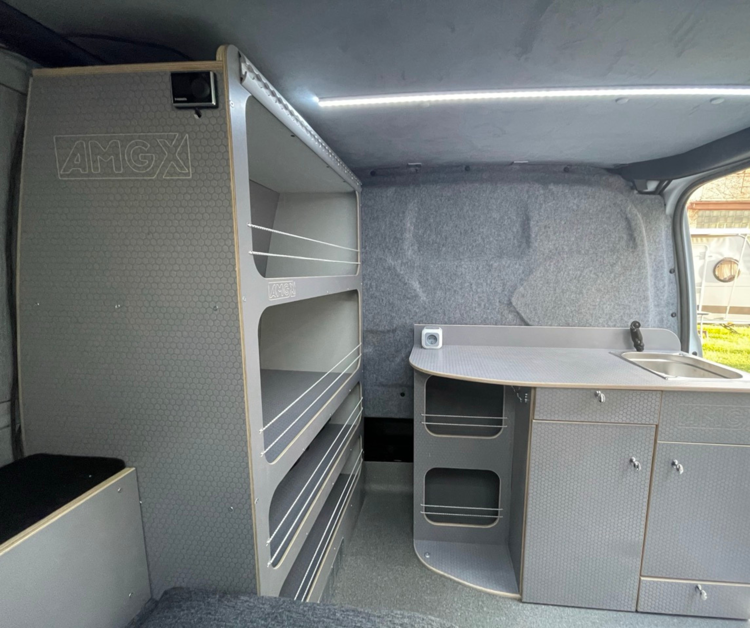Zabudowa modułowa wykonana na indywidualne zamówienie – projekt zrealizowany zdalnie dla klienta z branży spadochronowej z Florydy. Klient chciał, aby samochód wyglądał profesjonalnie, a nie jak kamper, bo często podróżował po Europie, prowadząc szkolenia spadochronowe.