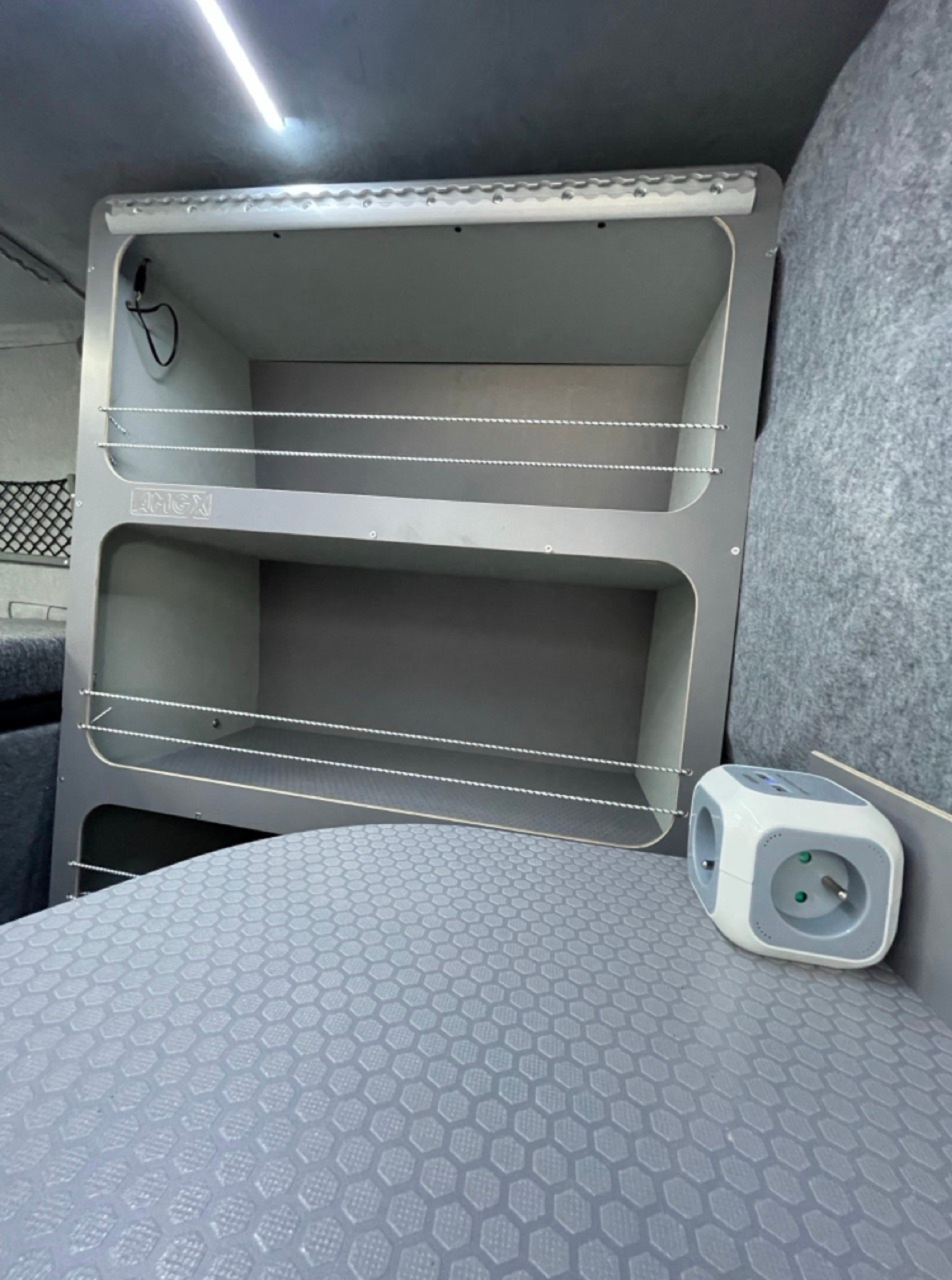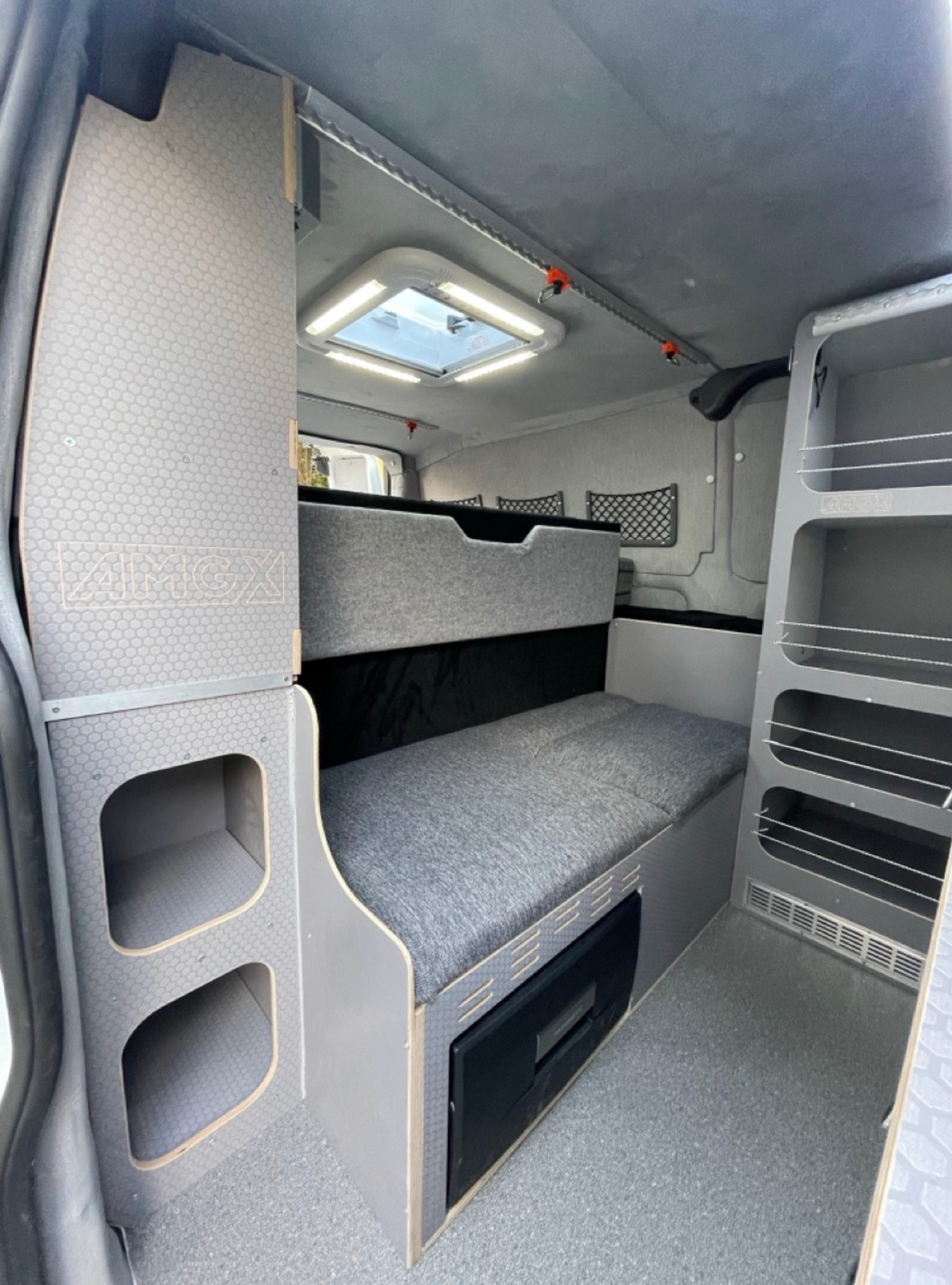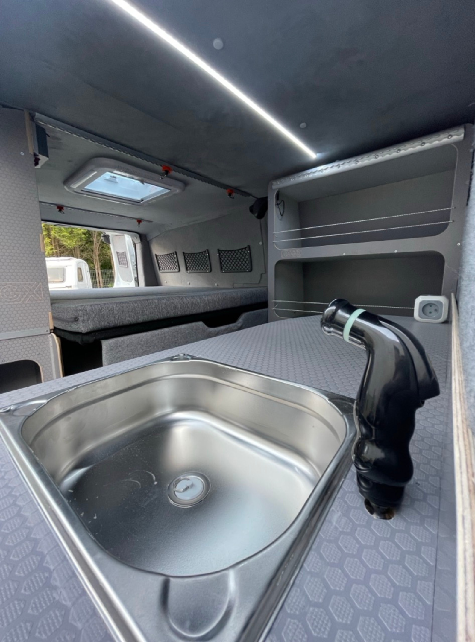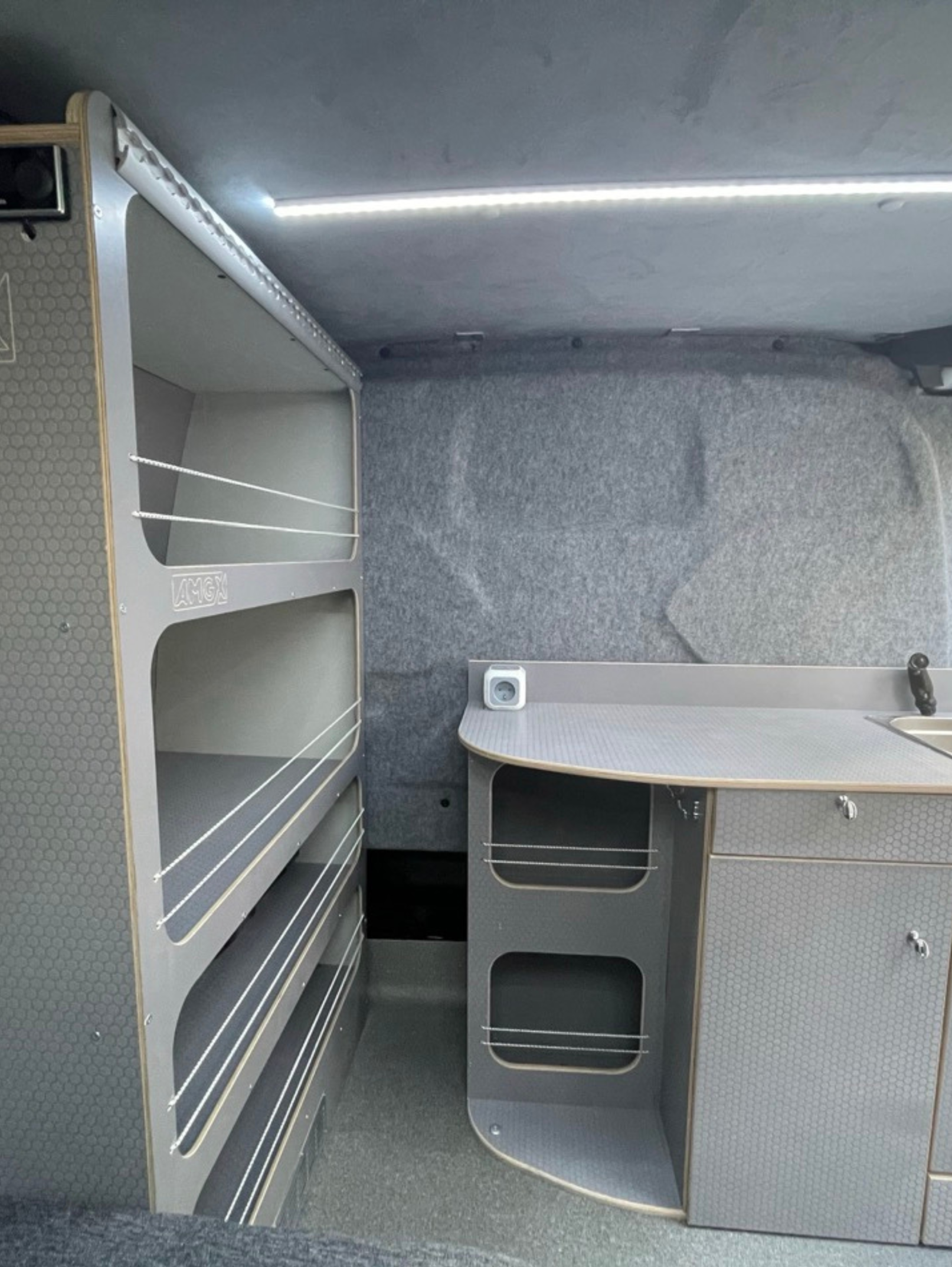 Cały samochód został  zaizolowany matą bitumiczną z folią aluminiową. Użyliśmy materiałów premium: sklejka hexa 12 mm oraz sklejka obustronnie laminowana o grubości 6,5 mm. Wszystkie płyty są wodoodporne, trwałe, odporne na uszkodzenia i łatwe w utrzymaniu czystości. Zabudowa została zaprojektowana tak, żeby pod łóżkiem mieściły się spadochrony – idealnie dopasowane wymiary zapewniają wygodny dostęp i bezpieczne przechowywanie sprzętu.
