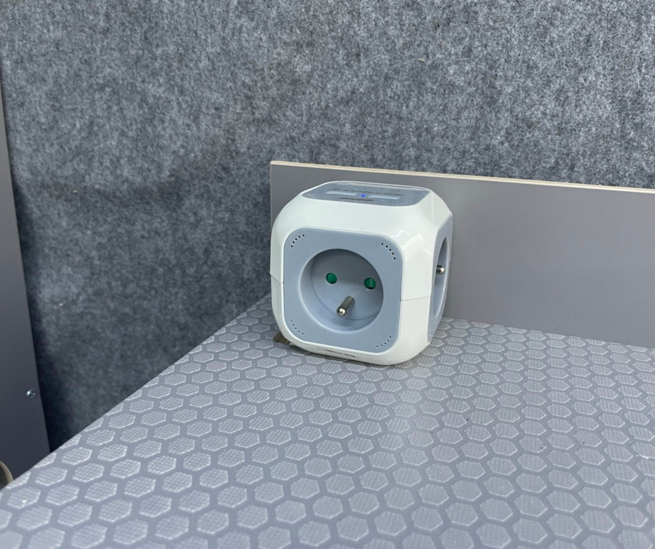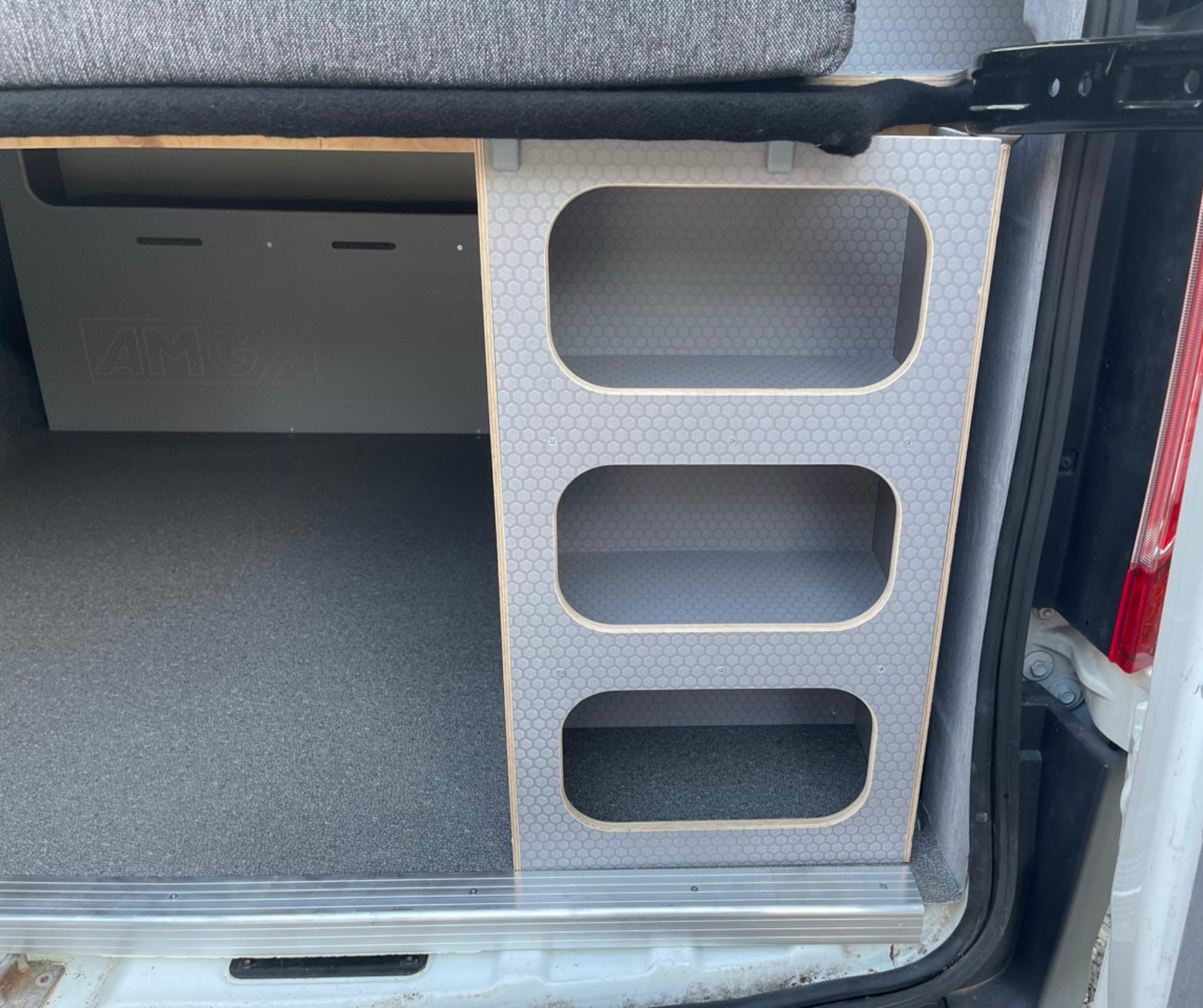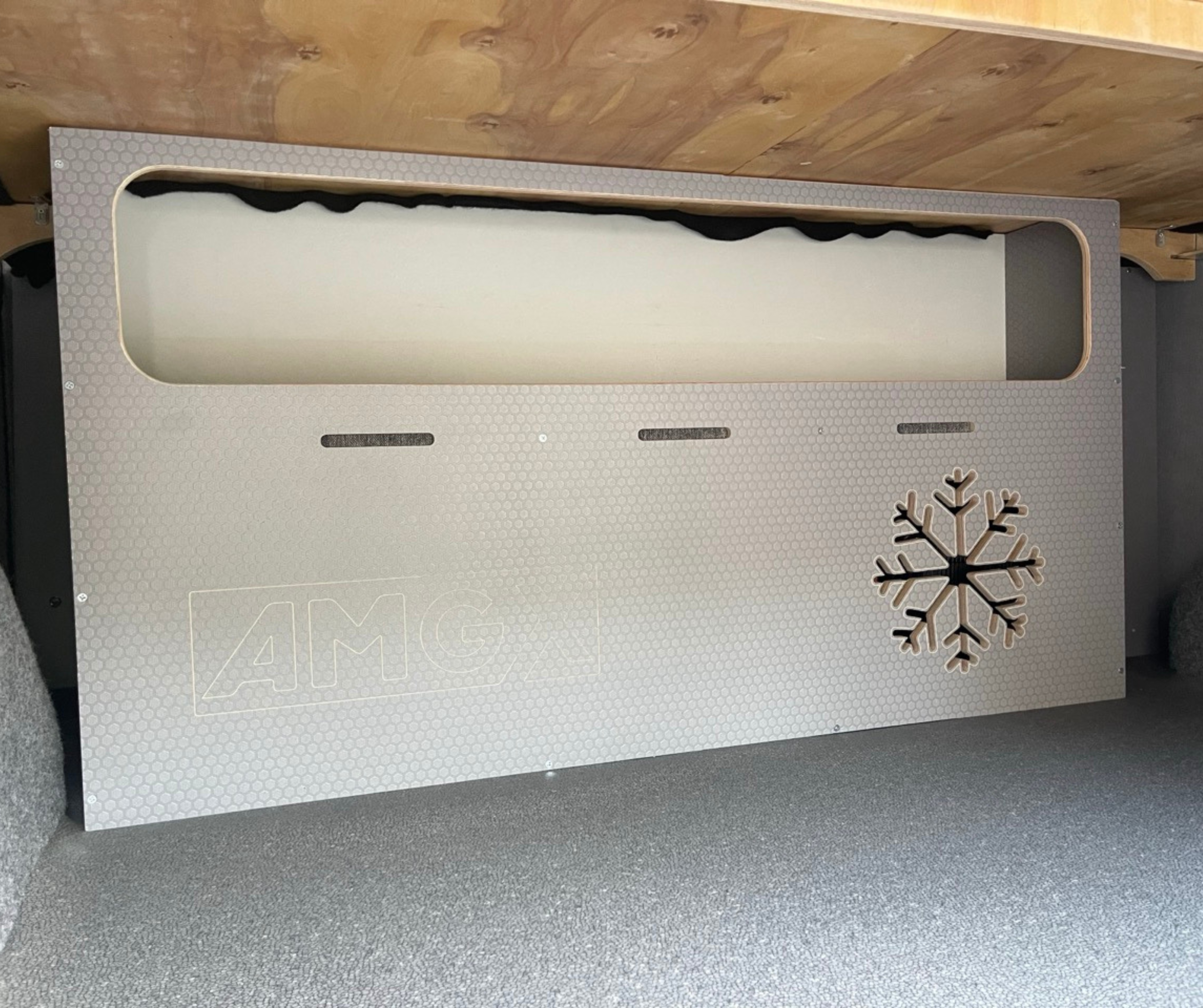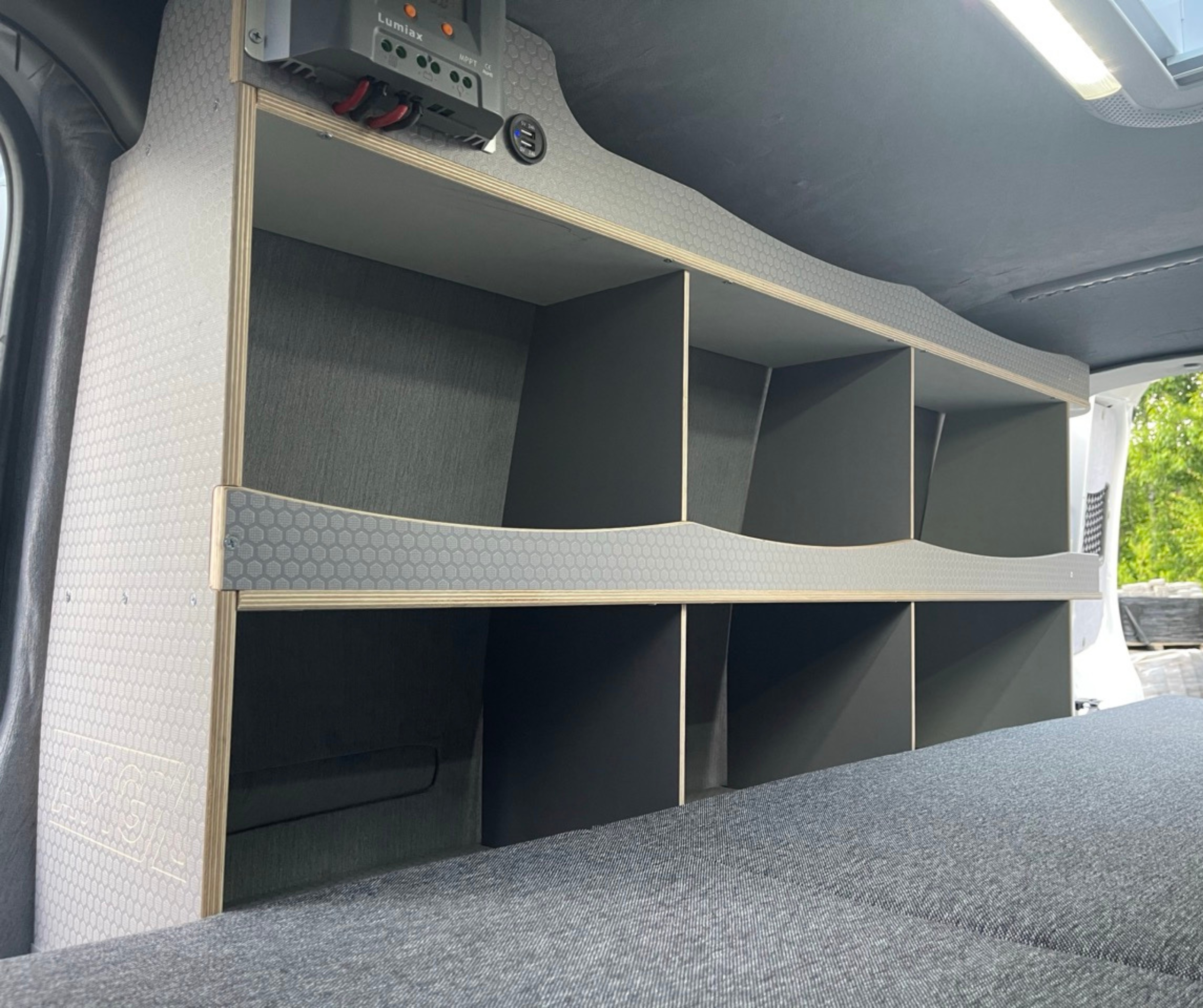 Cały samochód został  zaizolowany matą bitumiczną z folią aluminiową. Użyliśmy materiałów premium: sklejka hexa 12 mm oraz sklejka obustronnie laminowana o grubości 6,5 mm. Wszystkie płyty są wodoodporne, trwałe, odporne na uszkodzenia i łatwe w utrzymaniu czystości. Zabudowa została zaprojektowana tak, żeby pod łóżkiem mieściły się spadochrony – idealnie dopasowane wymiary zapewniają wygodny dostęp i bezpieczne przechowywanie sprzętu.