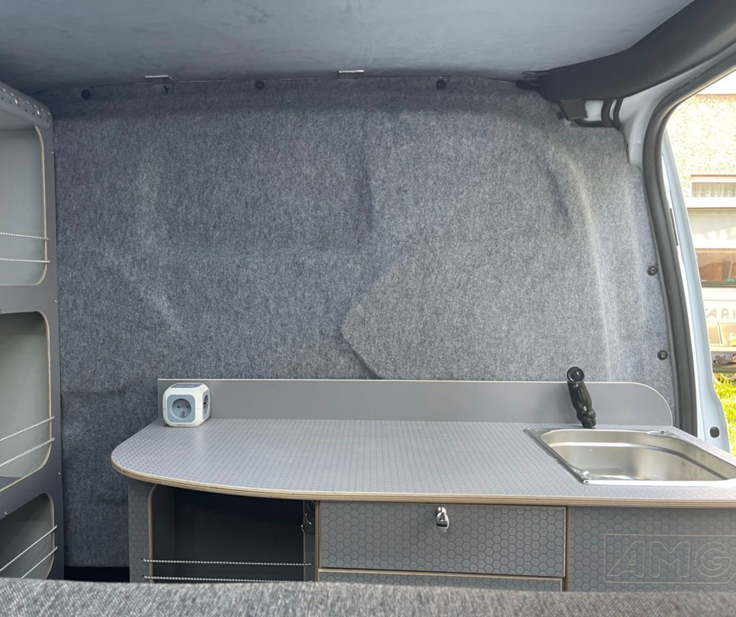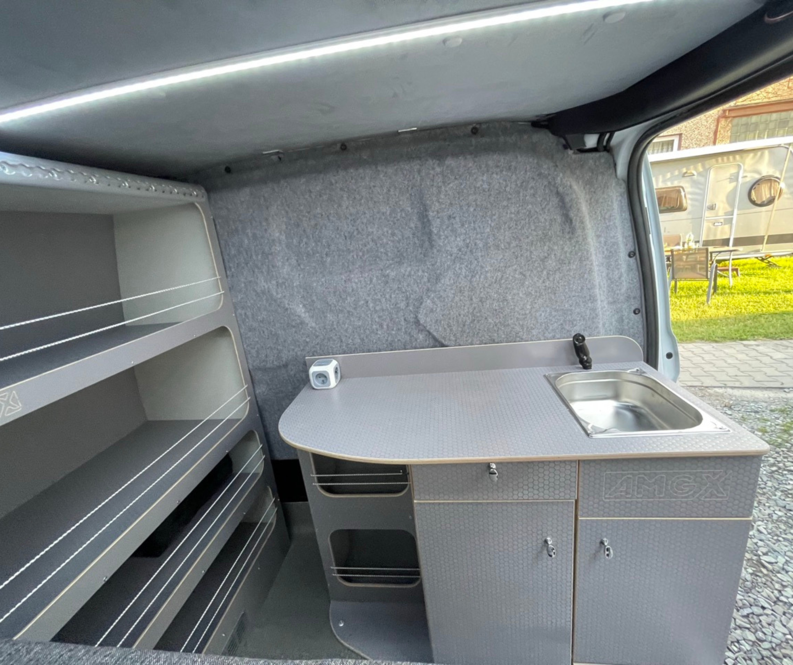 Panel kuchenny zintegrowany jest z prysznicem i zawiera zbiorniki na czystą oraz brudną wodę. Na tylnych drzwiach znajduje się rozkładany stolik, a pod siedzeniem zamontowano lodówkę Dometic. Zabudowa została wyposażona w rozkładane łóżko ze schowkiem oraz rozbudowaną przestrzeń ładunkową: półki, szafki i schowki wykonane ze sklejki. Dodatkowo zastosowano siatki transportowe przy łóżku i tylnych drzwiach.