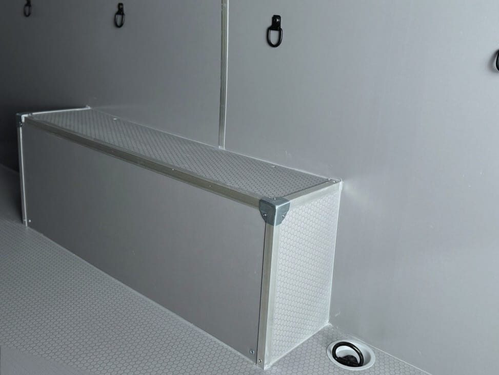 • Wytrzymała podłoga – płyta hexa o grubości 12 mm, zakończona aluminiowymi listwami progowymi.