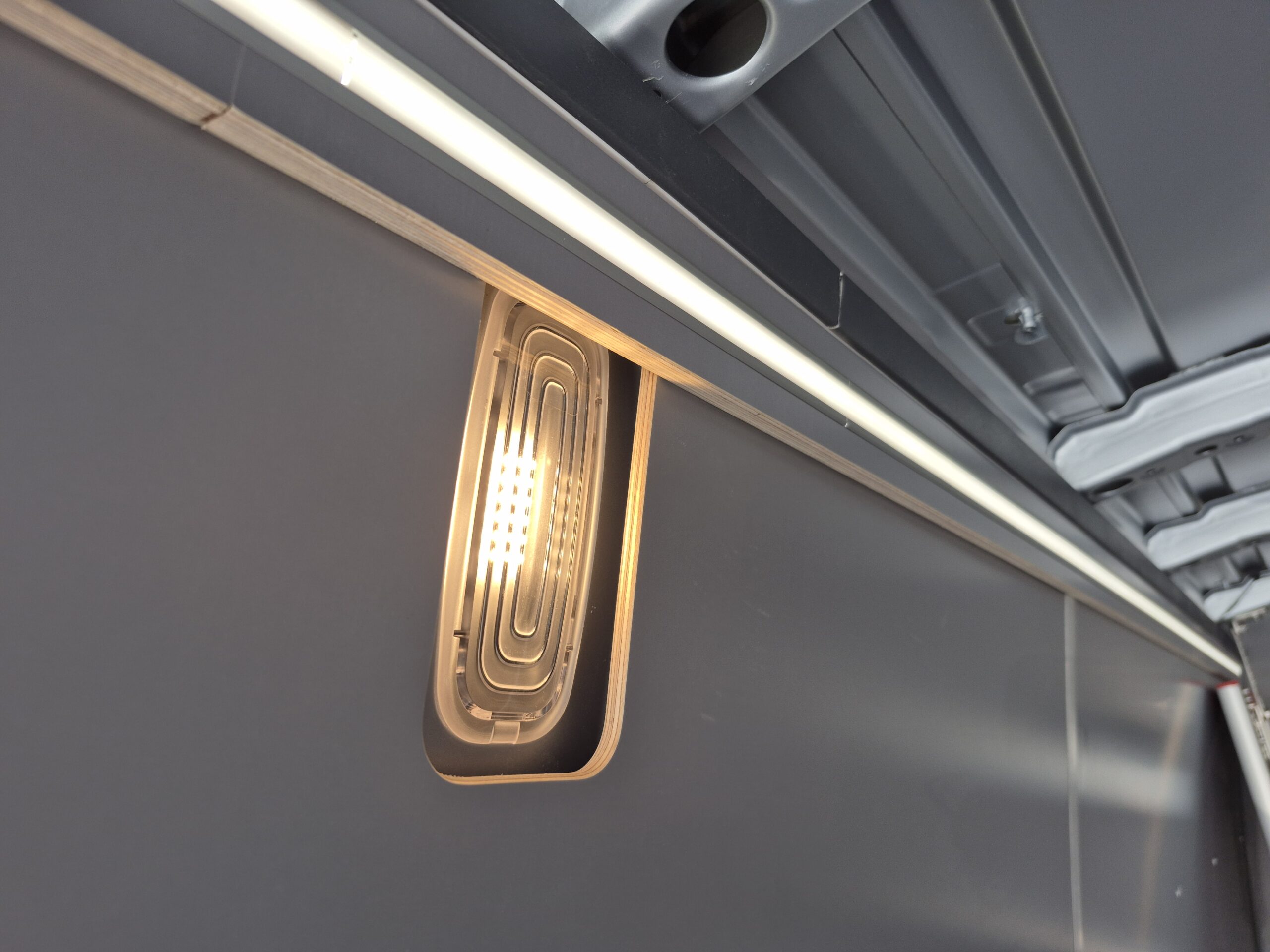 • Oświetlenie LED – po obu stronach pod sufitem zamontowano oświetlenie LED, które zintegrowaliśmy z fabrycznym oświetleniem.