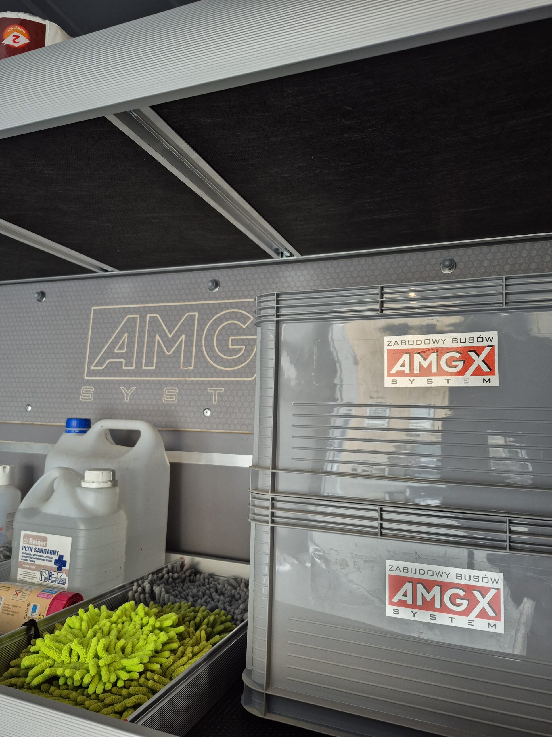Dodatkowym elementem zabudowy jest lekki, aluminiowy regał włoskiej marki GEMA. Przeznaczony do przechowywania środków czystości i organizerów, stanowi praktyczne i funkcjonalne rozwiązanie. Dla zwiększenia stabilności został wzmocniony panelem ze sklejki HEXA, co zapewnia solidność konstrukcji.
