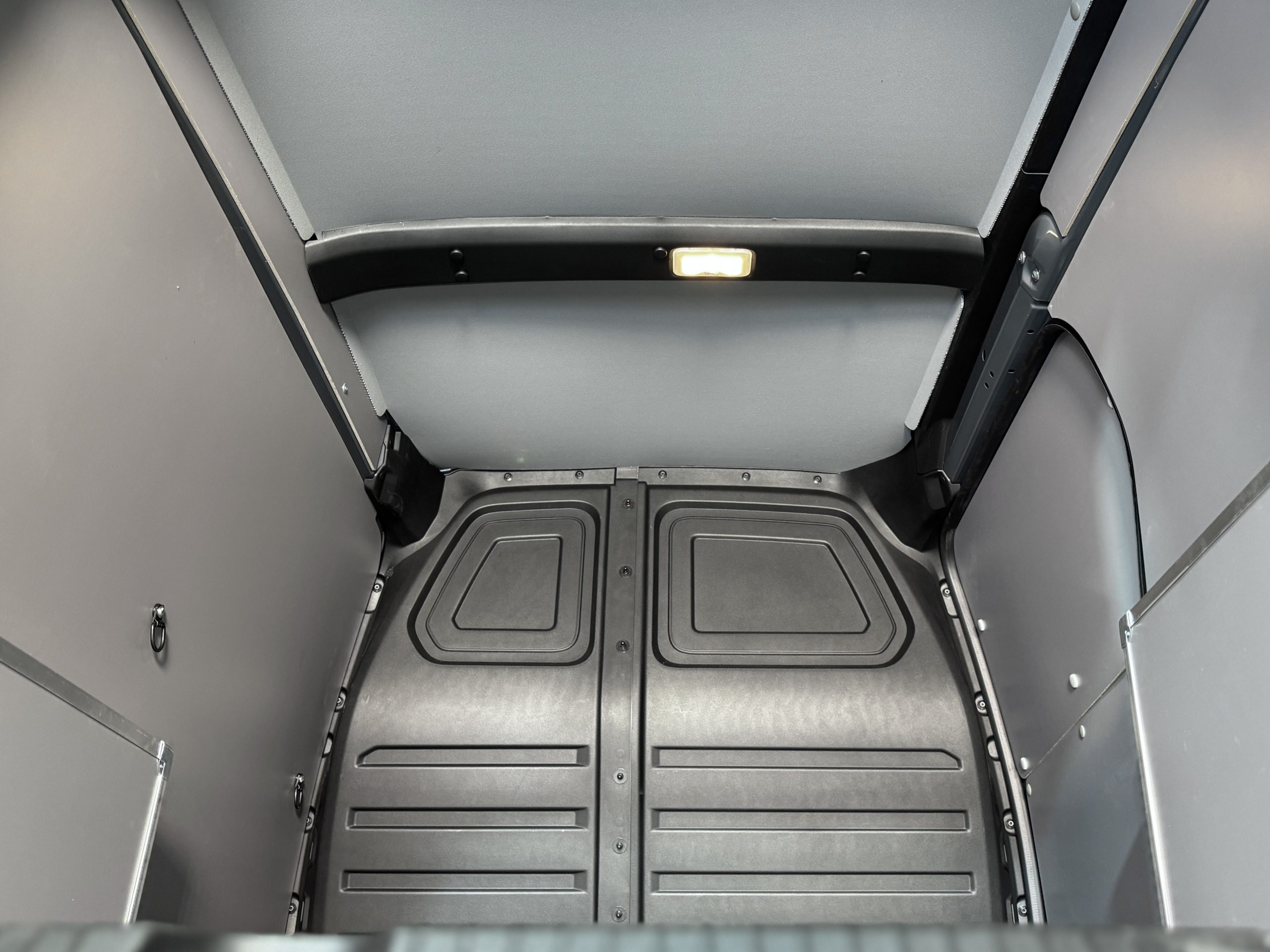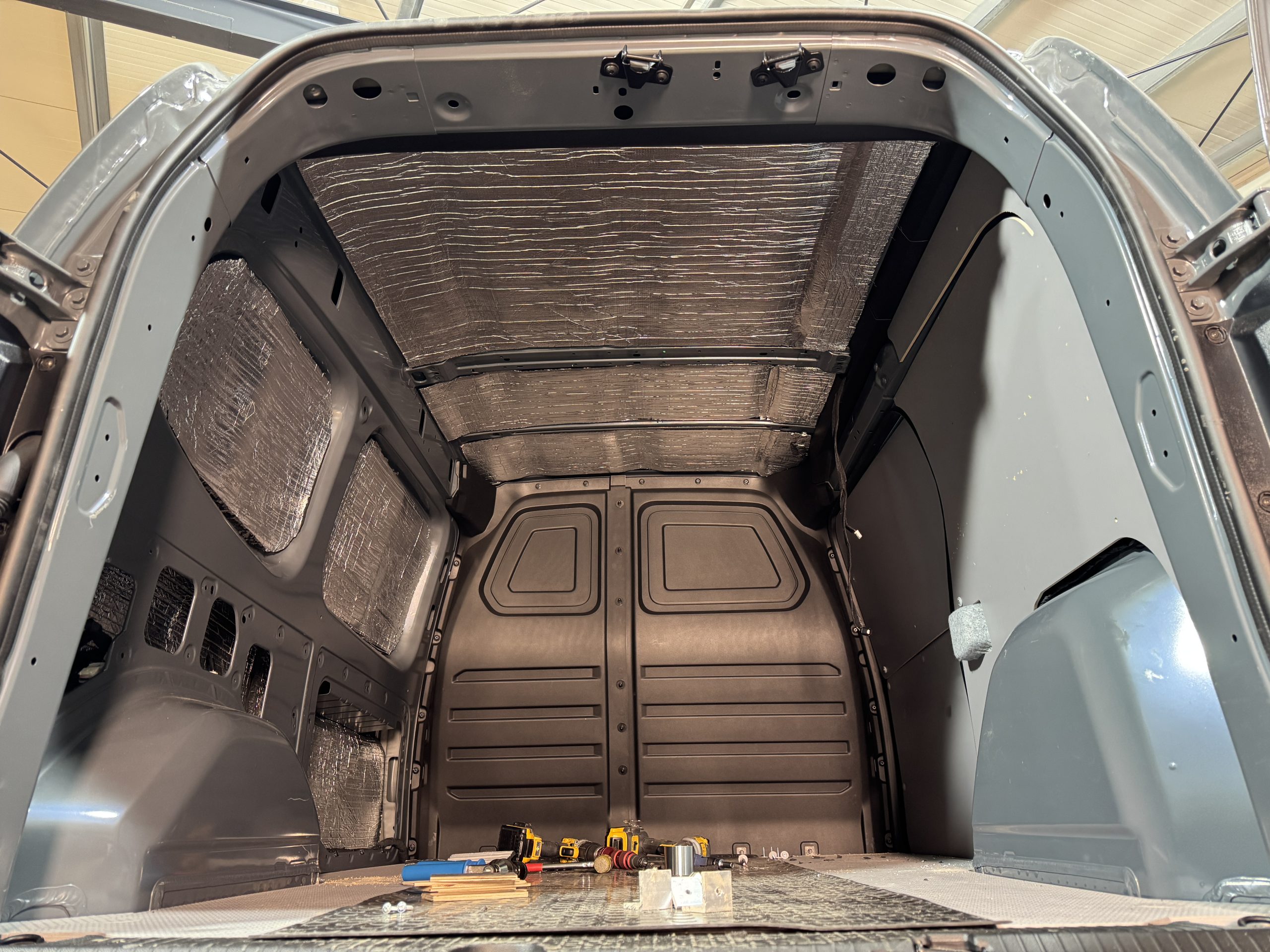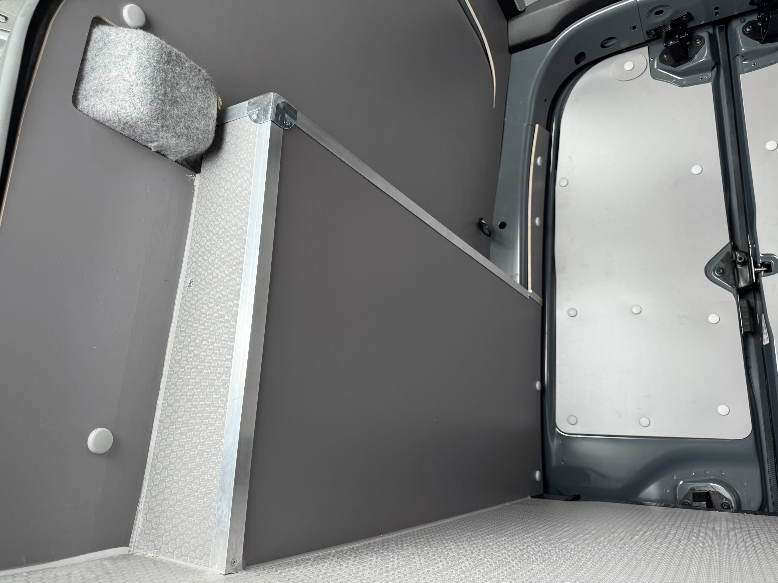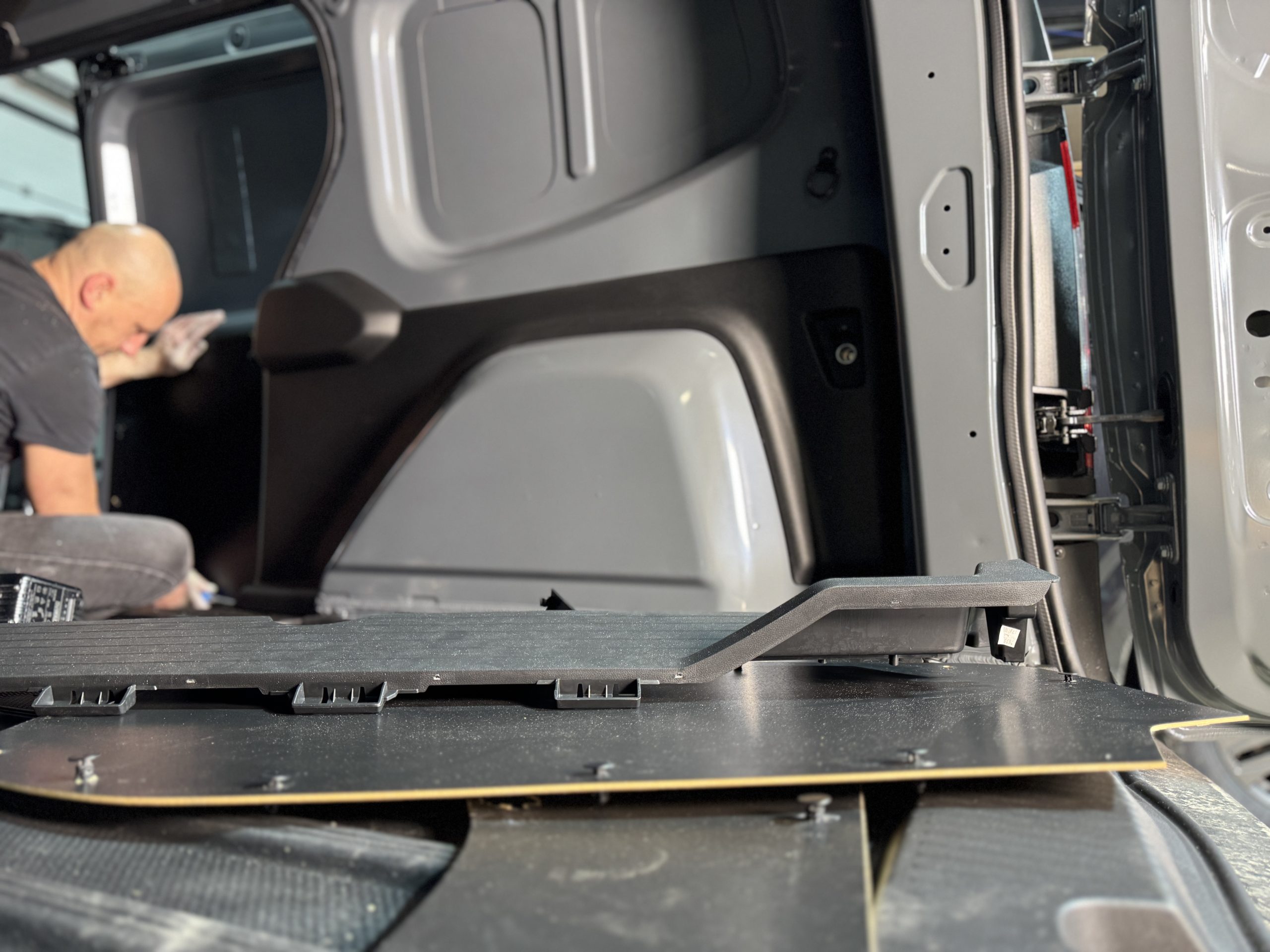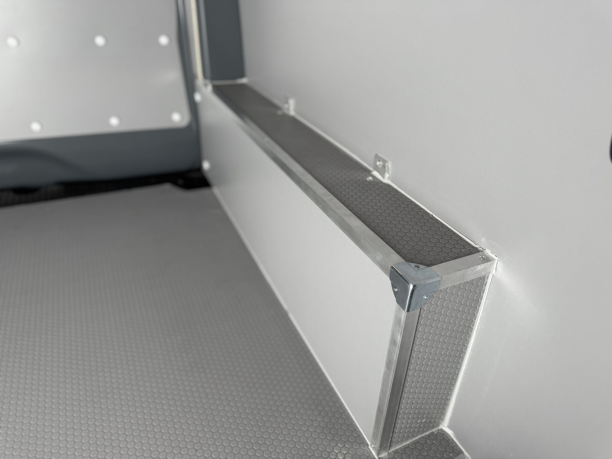 Podłoga została wykonana ze sklejki hexa o grubości 12 mm, która posiada powierzchnię antypoślizgową, jest odporna na ścieranie oraz bardzo łatwa w utrzymaniu czystości. Dodatkowo zabudowaliśmy stopień przy drzwiach bocznych. Między nadkolami uzyskaliśmy 123 cm szerokości, co pozwala na swobodne rozmieszczenie koszy piekarniczych.