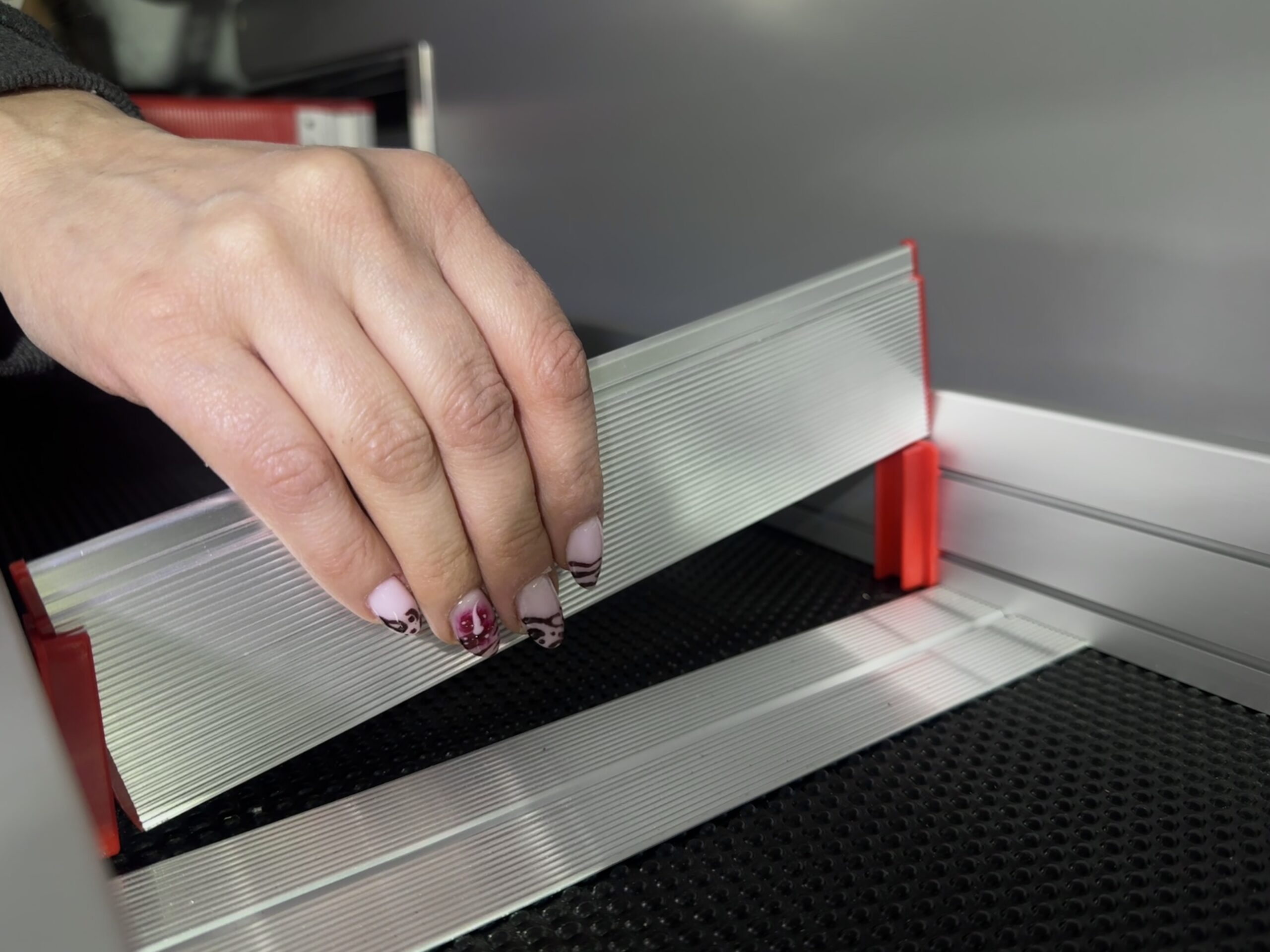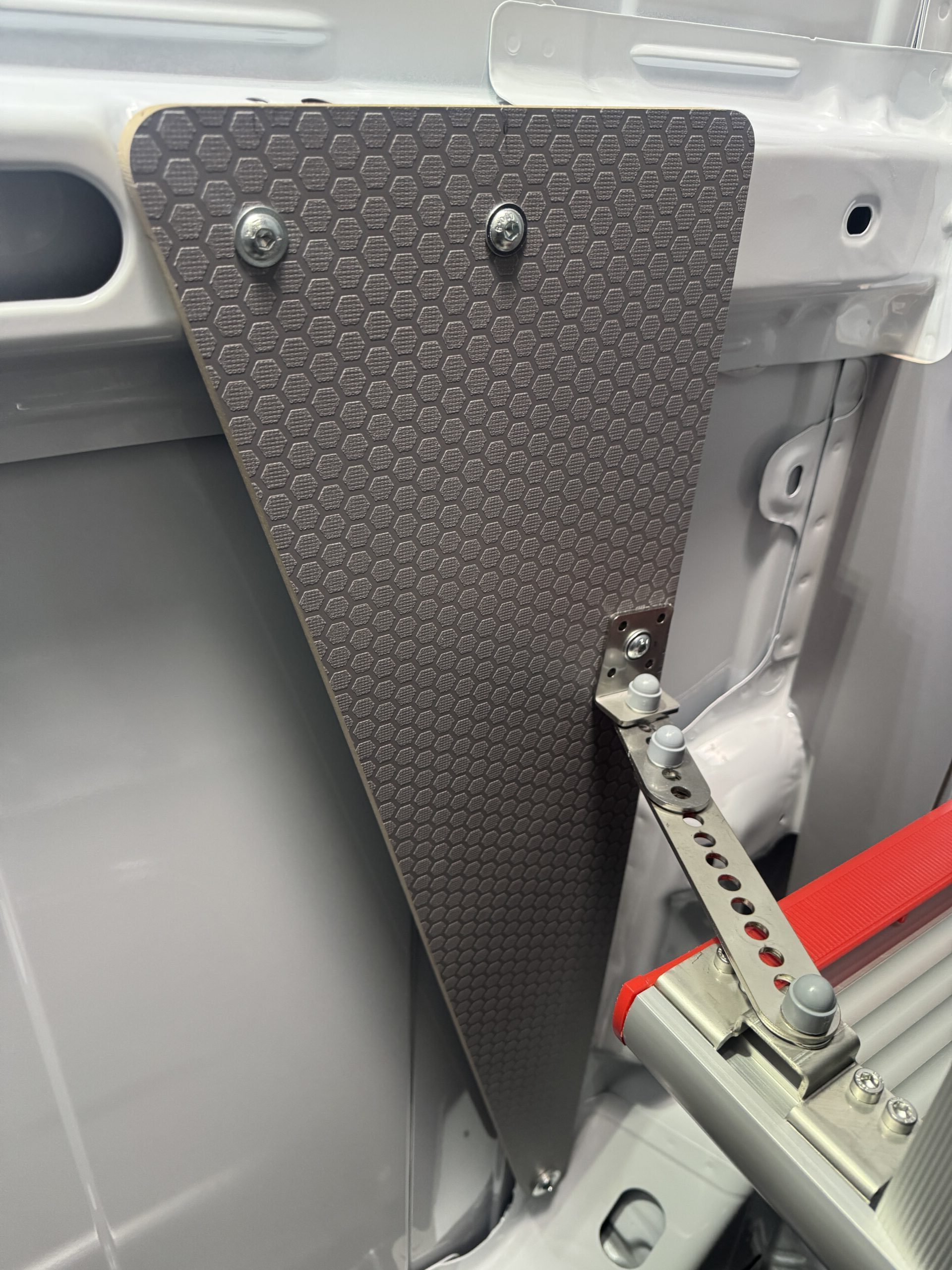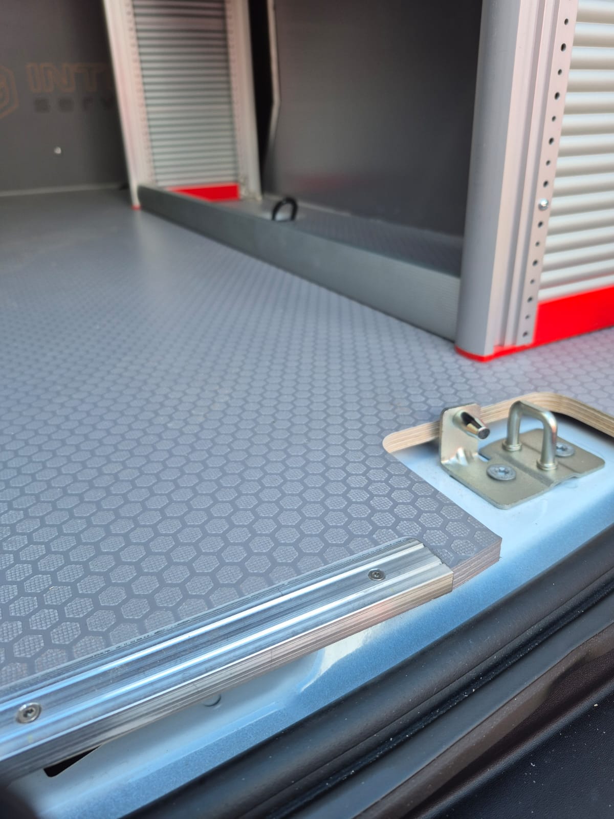 Podłoga została wykonana ze sklejki HEXA o grubości 12 mm w szarym kolorze. Oprócz wodoodporności, jej struktura ułatwia utrzymanie czystości, co jest kluczowe w codziennej eksploatacji pojazdu serwisowego. Całkowicie zabudowaliśmy nadkola, aby stworzyć jednolitą przestrzeń. Dodatkowo, odpowiednio docięty kawałek sklejki HEXA został zastosowany na suficie jako wzmocnienie regału GEMA.