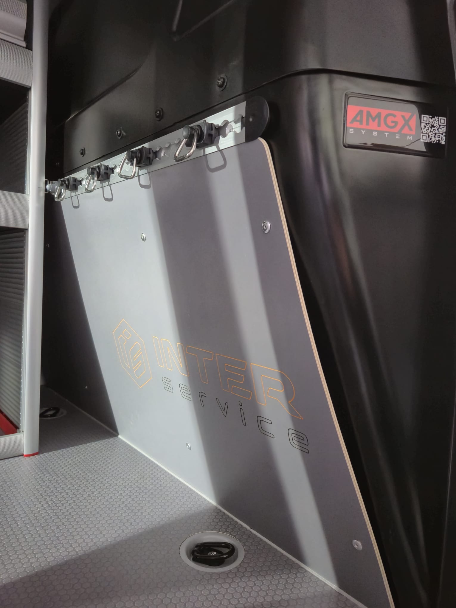 Ściana grodziowa została zabudowana do połowy wysokości i wyposażona w listwę mocowania ładunku AIRLINE. Ten nowoczesny i niezawodny system umożliwia pełne zabezpieczenie przewożonych przedmiotów, zapewniając ich stabilność podczas transportu.