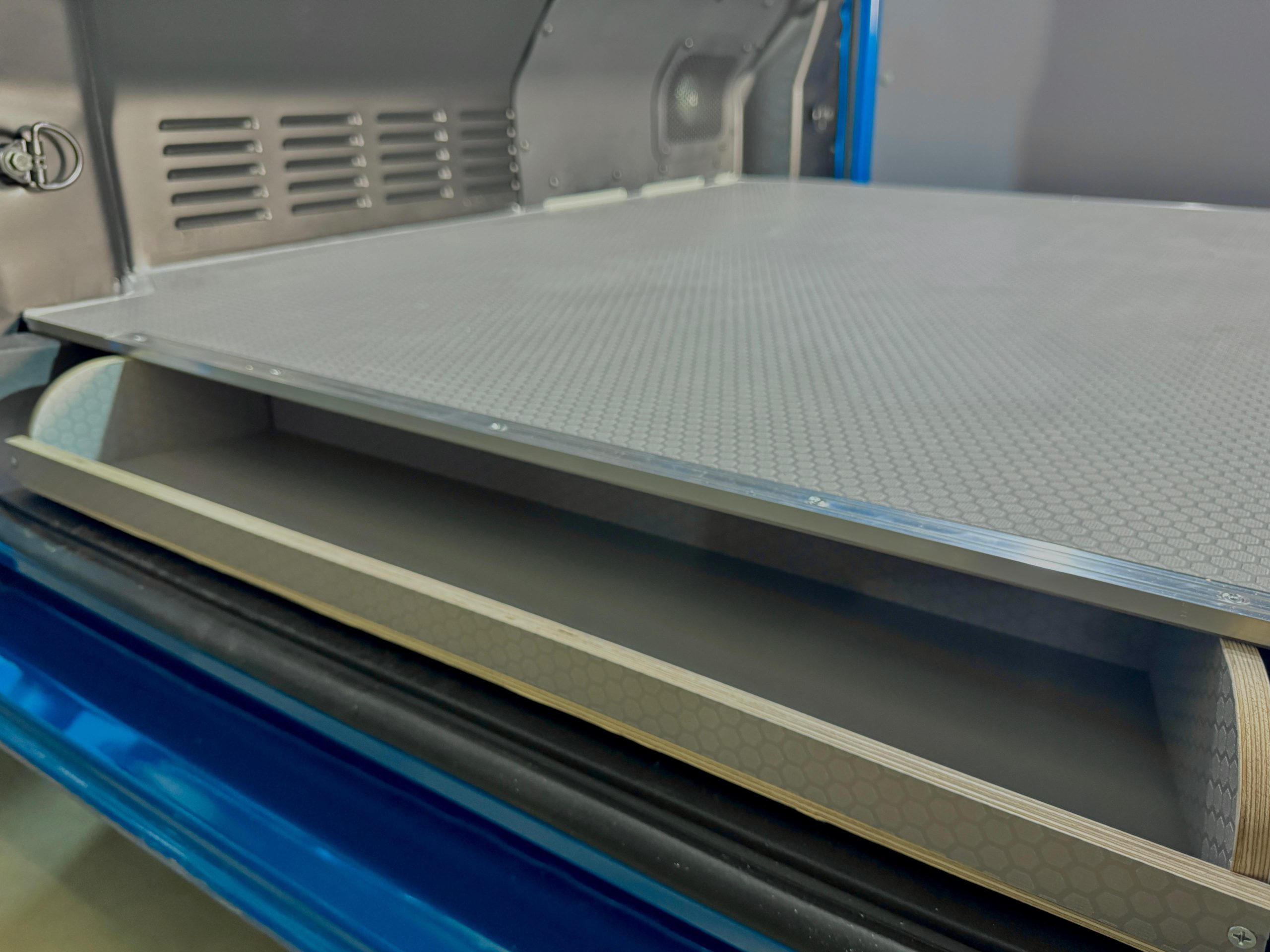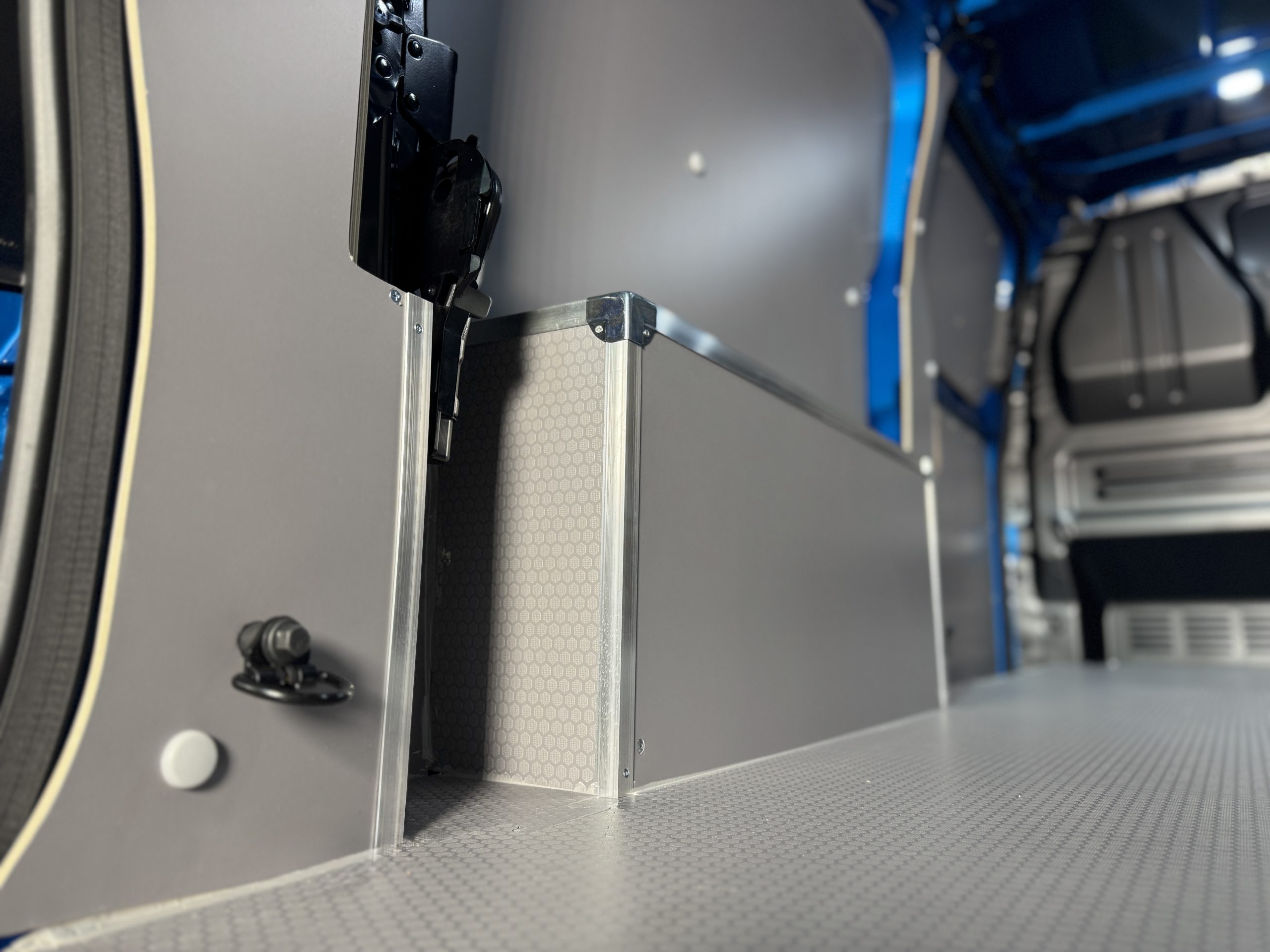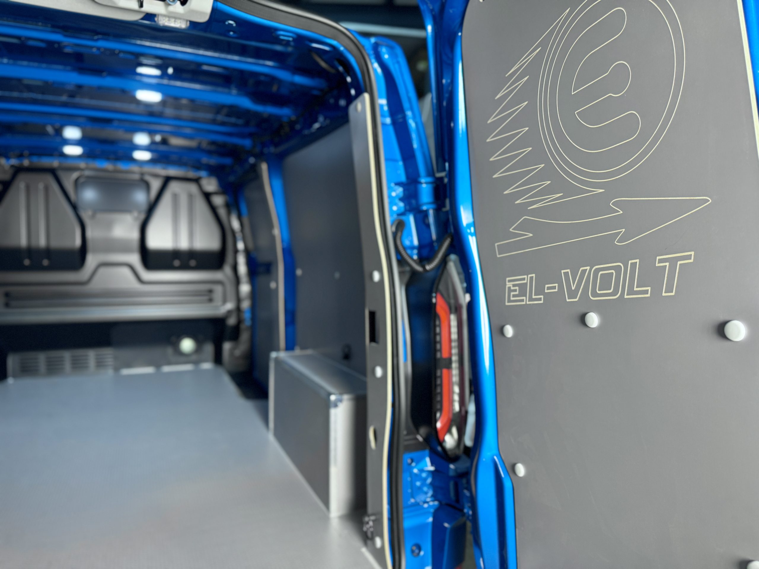 Boczne panele oraz panele drzwi wykonaliśmy z obustronnie laminowanej sklejki o grubości 6,5 mm. Na drzwiach dodatkowo wygrawerowaliśmy logo firmy EL-VOLT, co podkreśla profesjonalny charakter pojazdu.