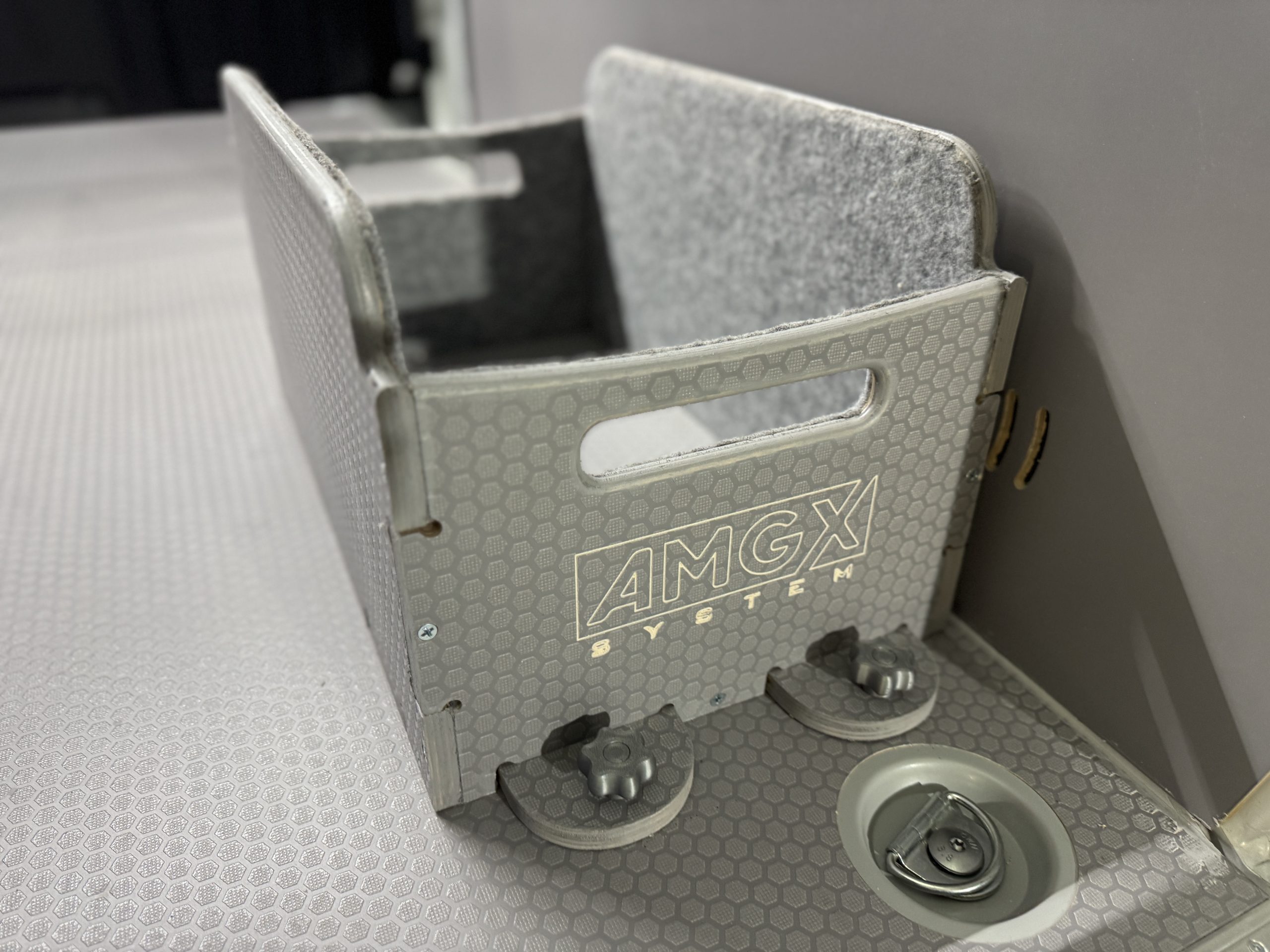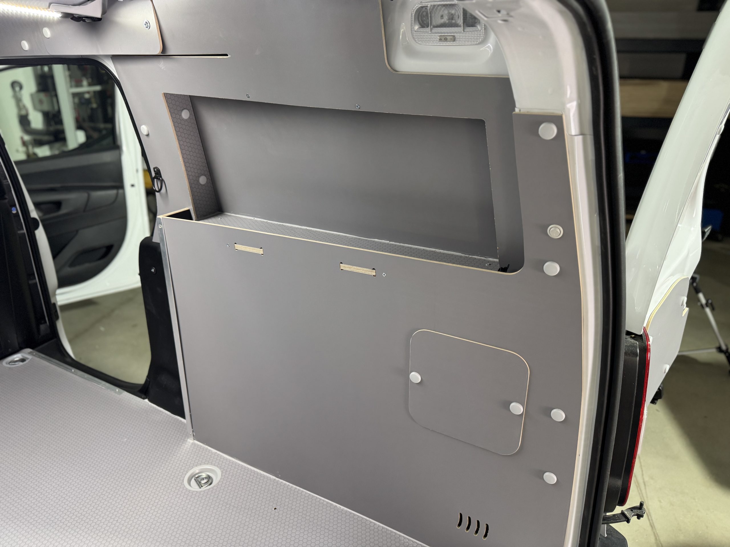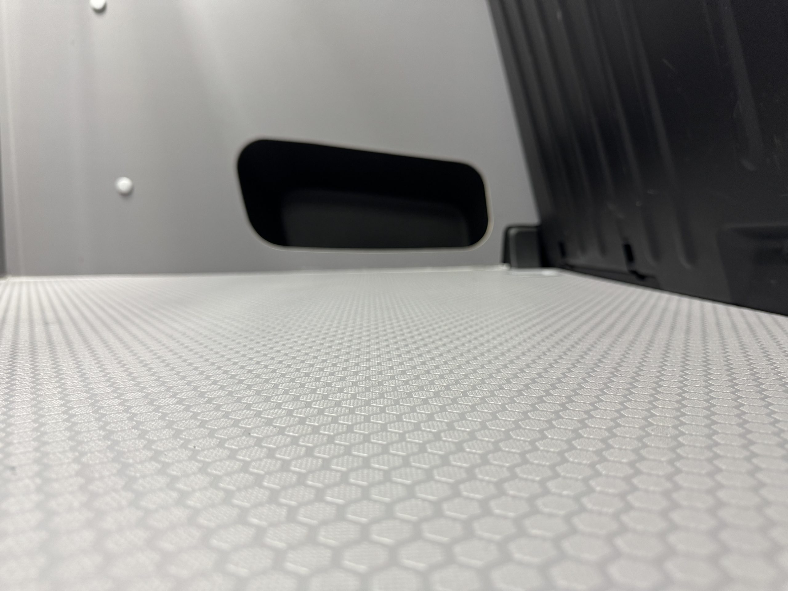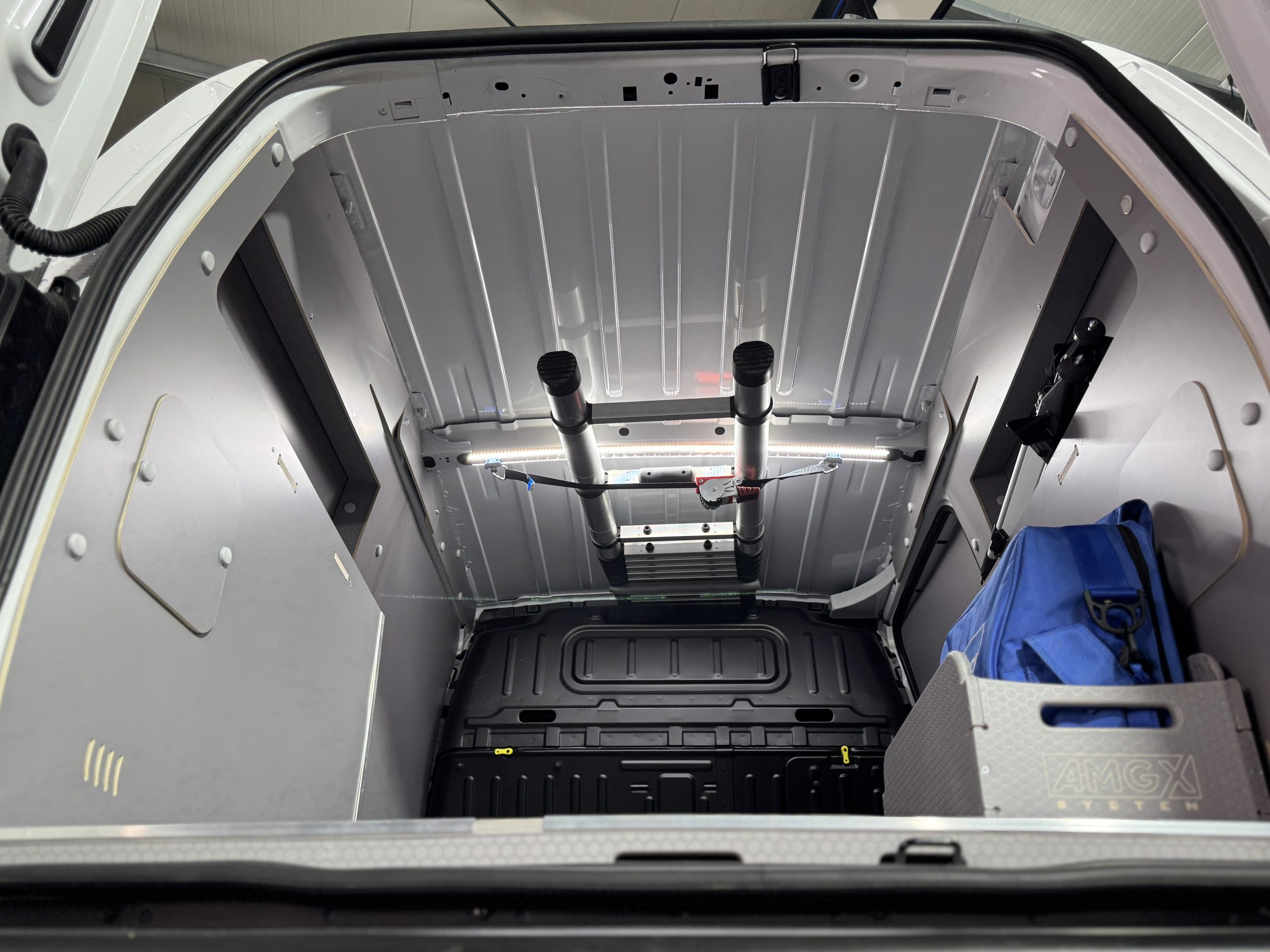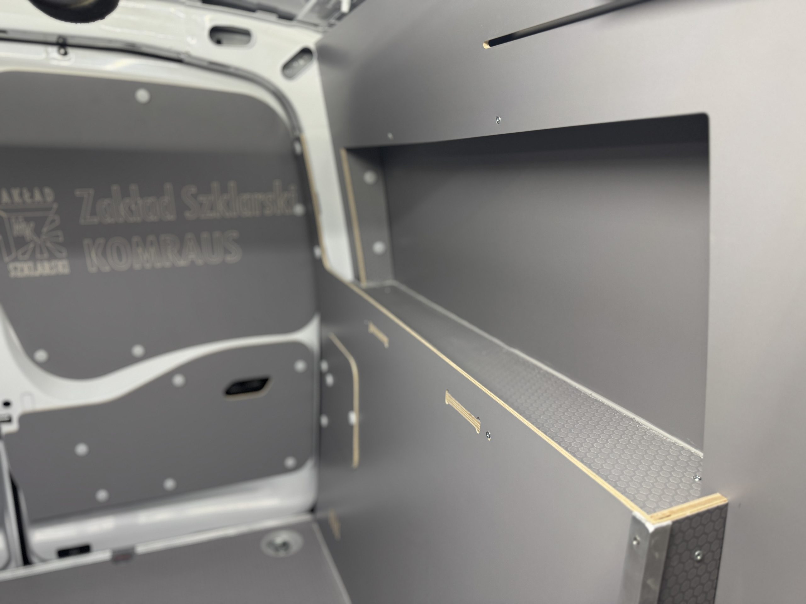 Wykonaliśmy precyzyjny pomiar 3D przestrzeni ładunkowej urządzeniem Proliner. Dzięki temu udało nam się wykonać zabudowę wnęki okna, tworząc półkę nad nadkolem, która zapewnia dodatkową przestrzeń do przechowywania. Użyliśmy sklejki o grubości 6,5 mm jako ścianki boczne oraz 12 mm na podłodze. Wszystkie elementy są wodoodporne i łatwe w czyszczeniu.