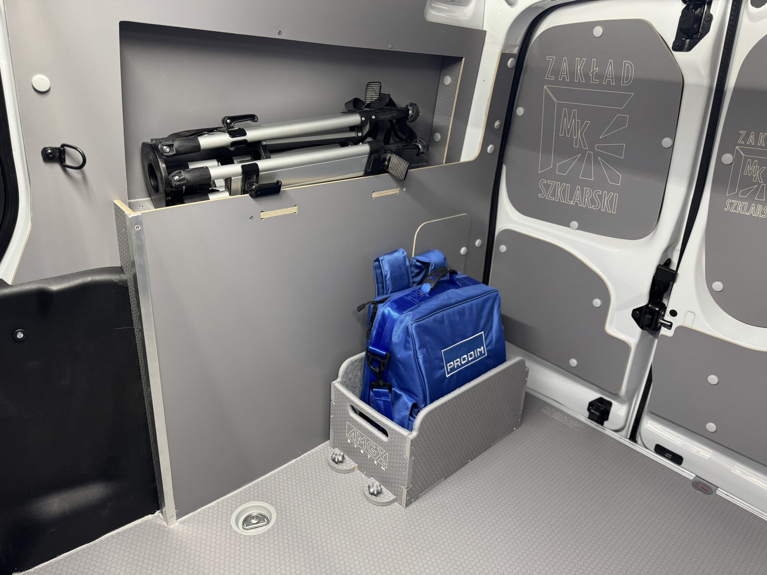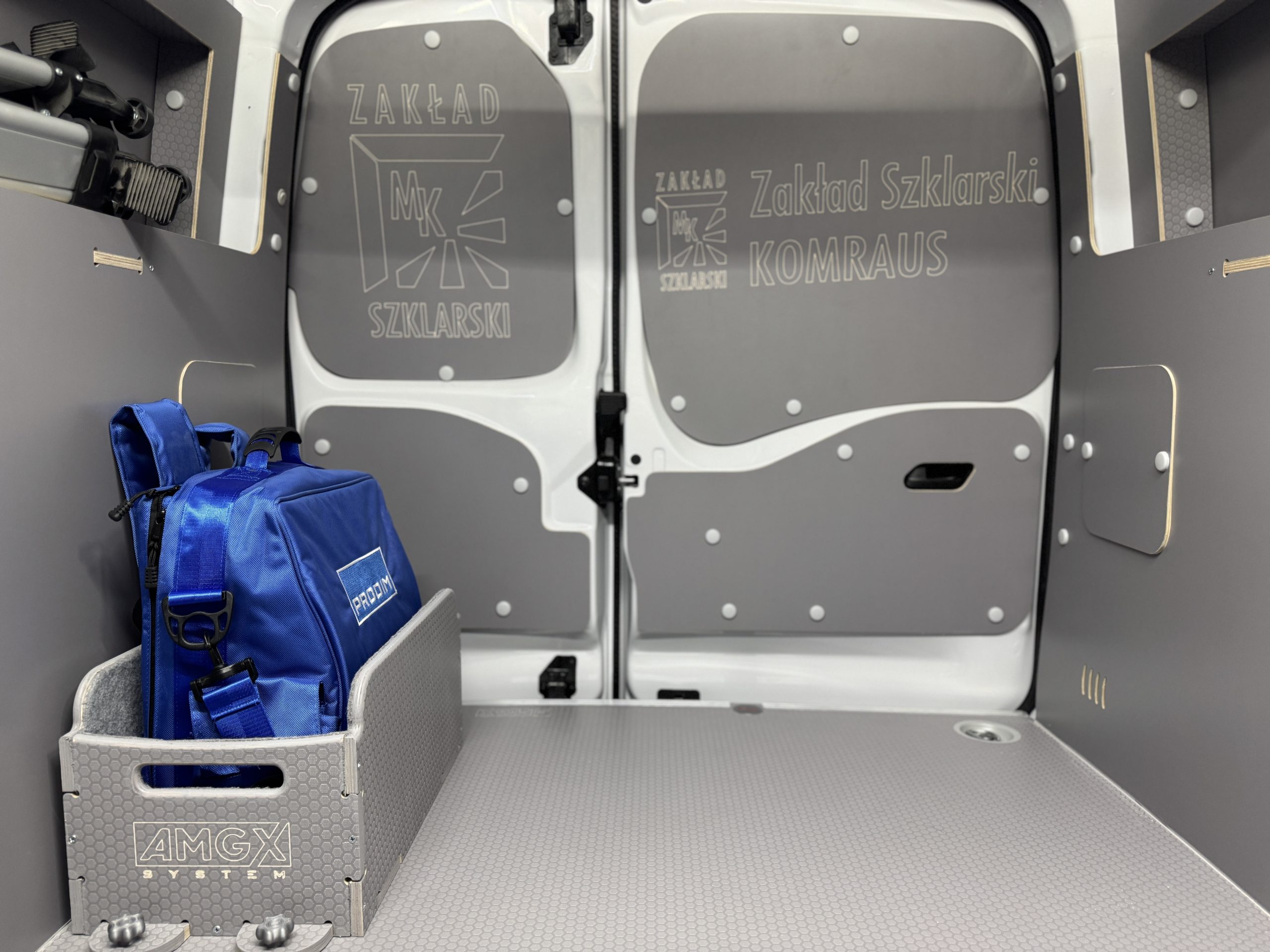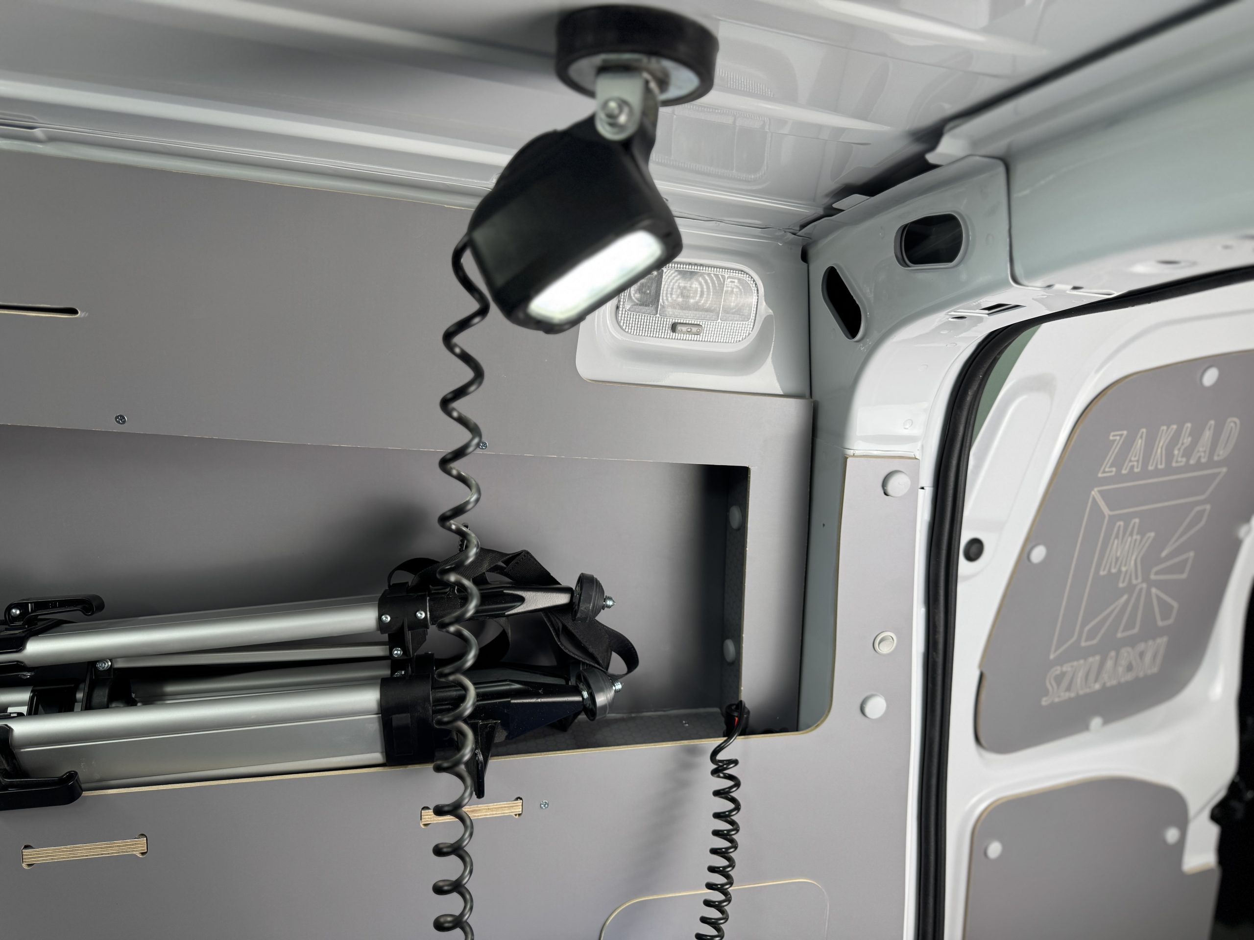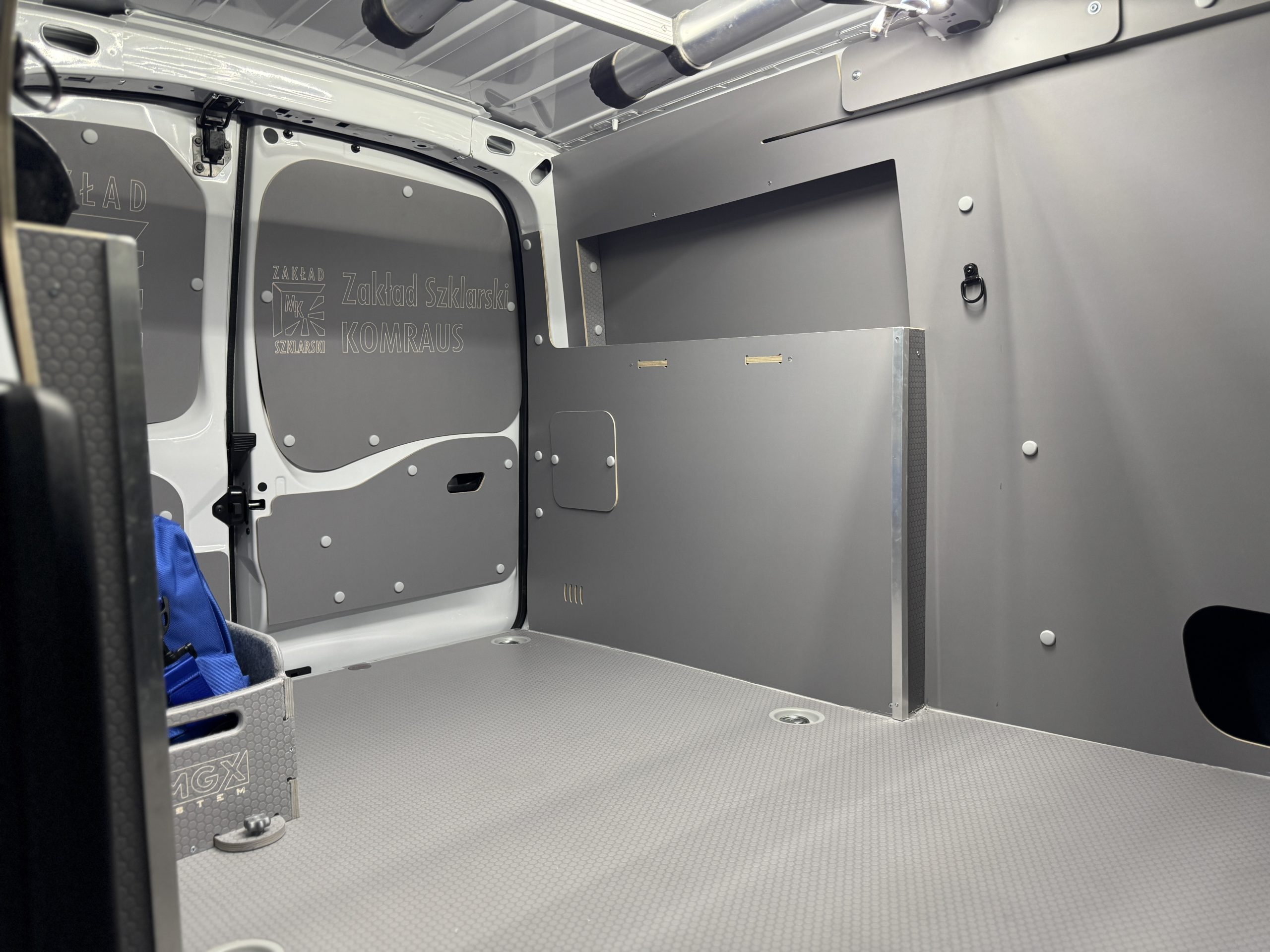 W zabudowie zamontowaliśmy listwę Airline z LED na suficie, która oświetla wnętrza pojazdu. Dodaliśmy pas automatyczny do listwy oraz uchwyty oczkowe, które zapewniają bezpieczny przewóz stojaka transportowego ze szkłem. Zabudowę wykonaliśmy w taki sposób, aby był dostęp do schowka w bocznej ścianie.