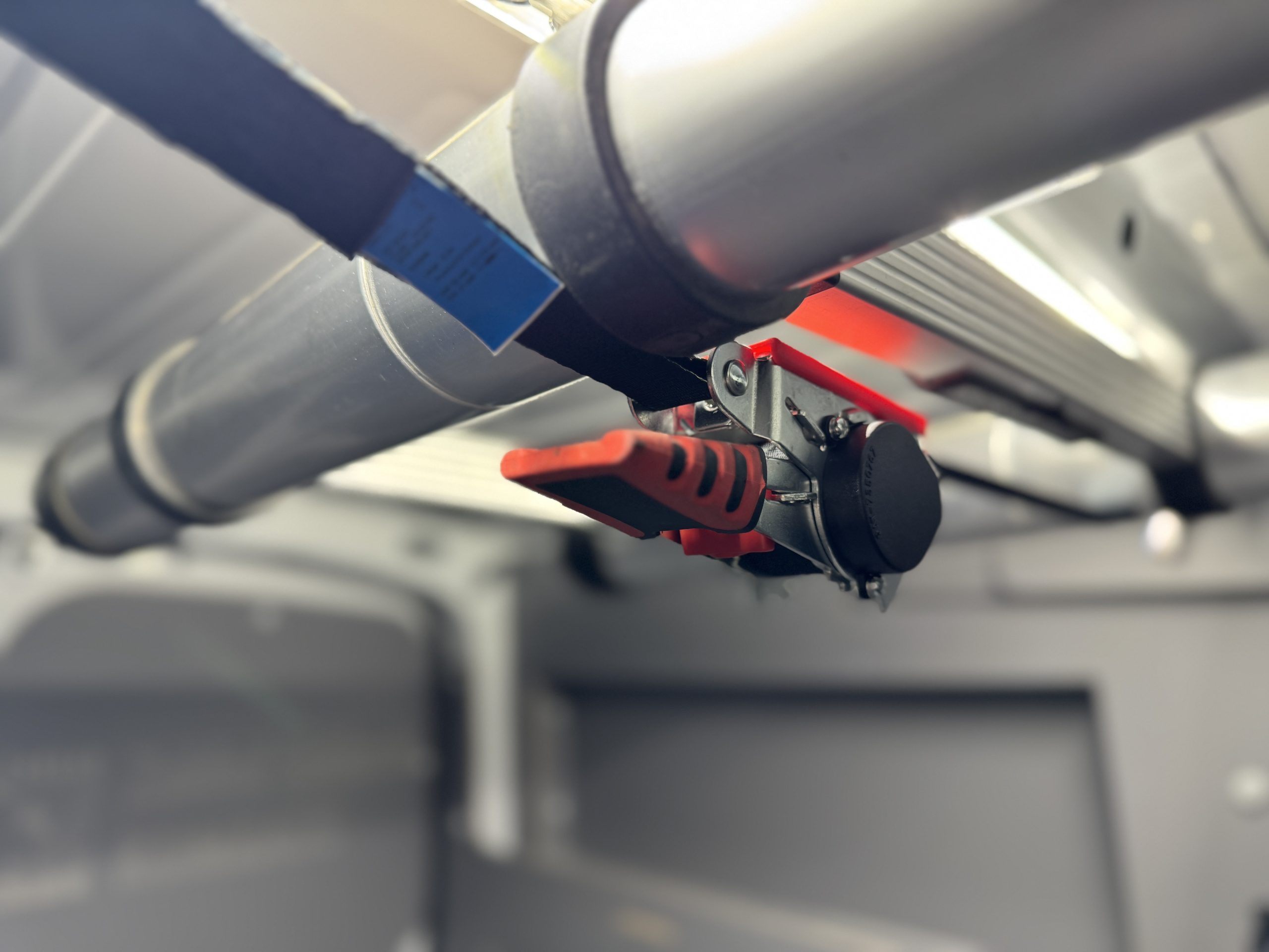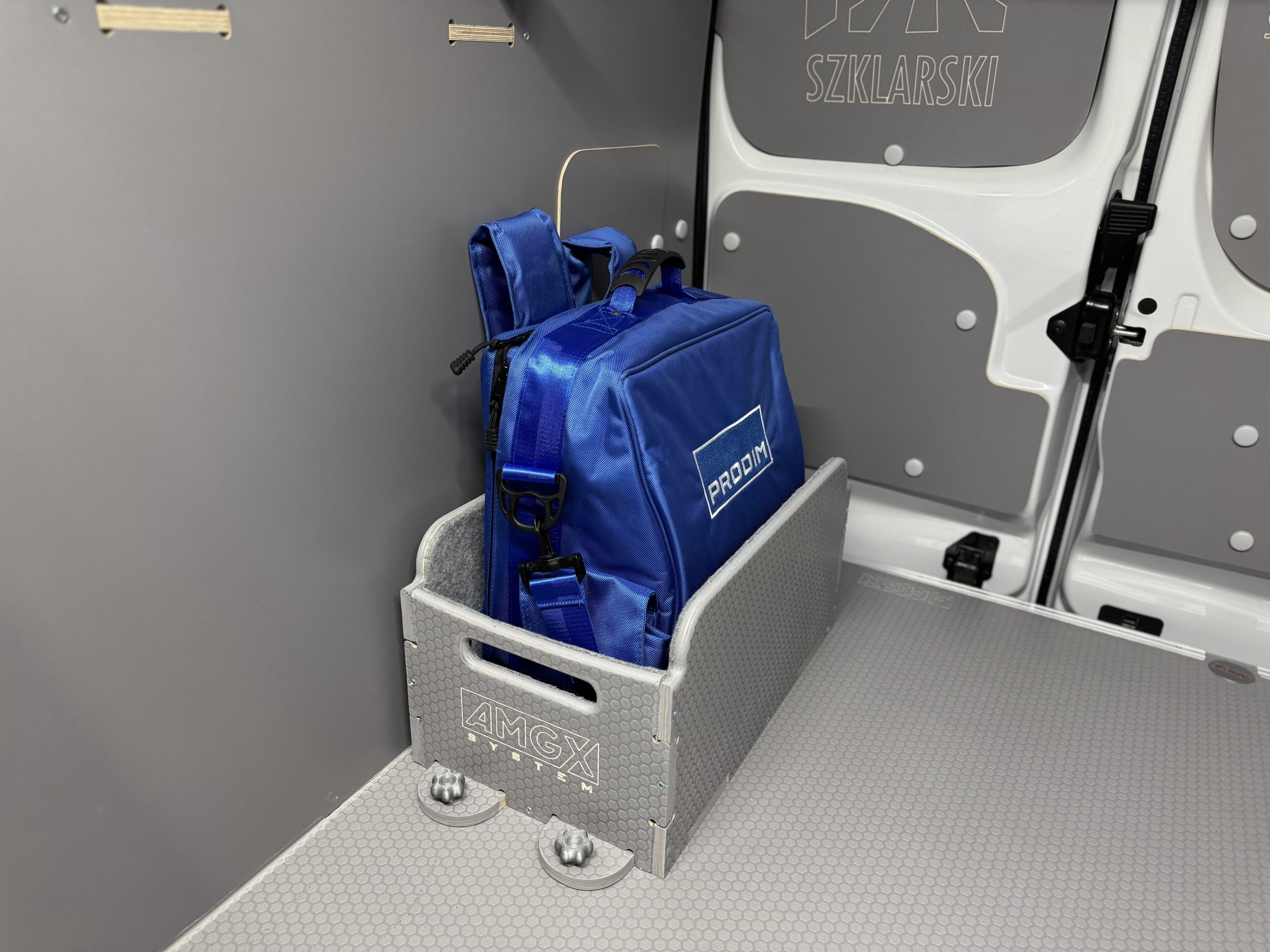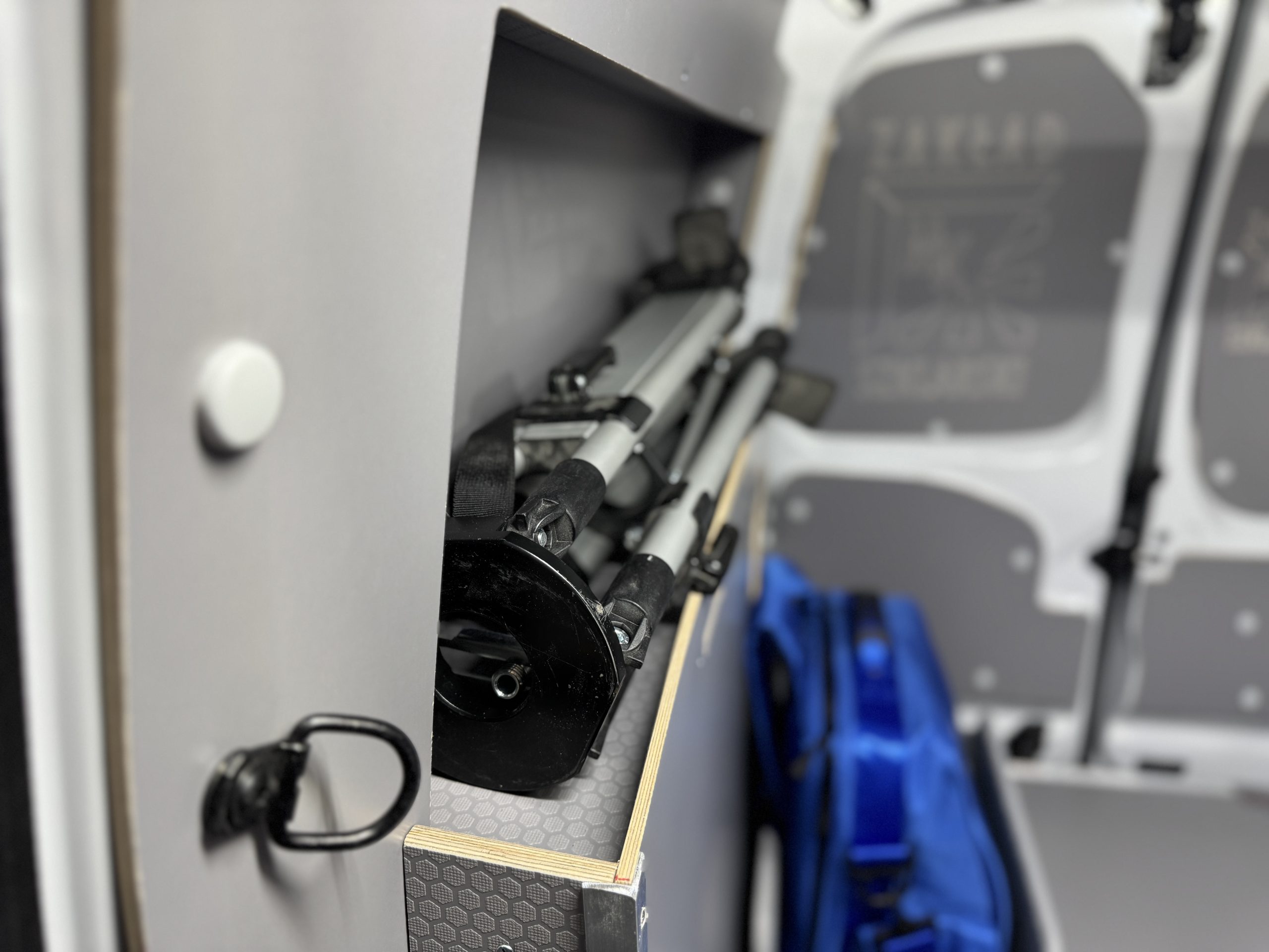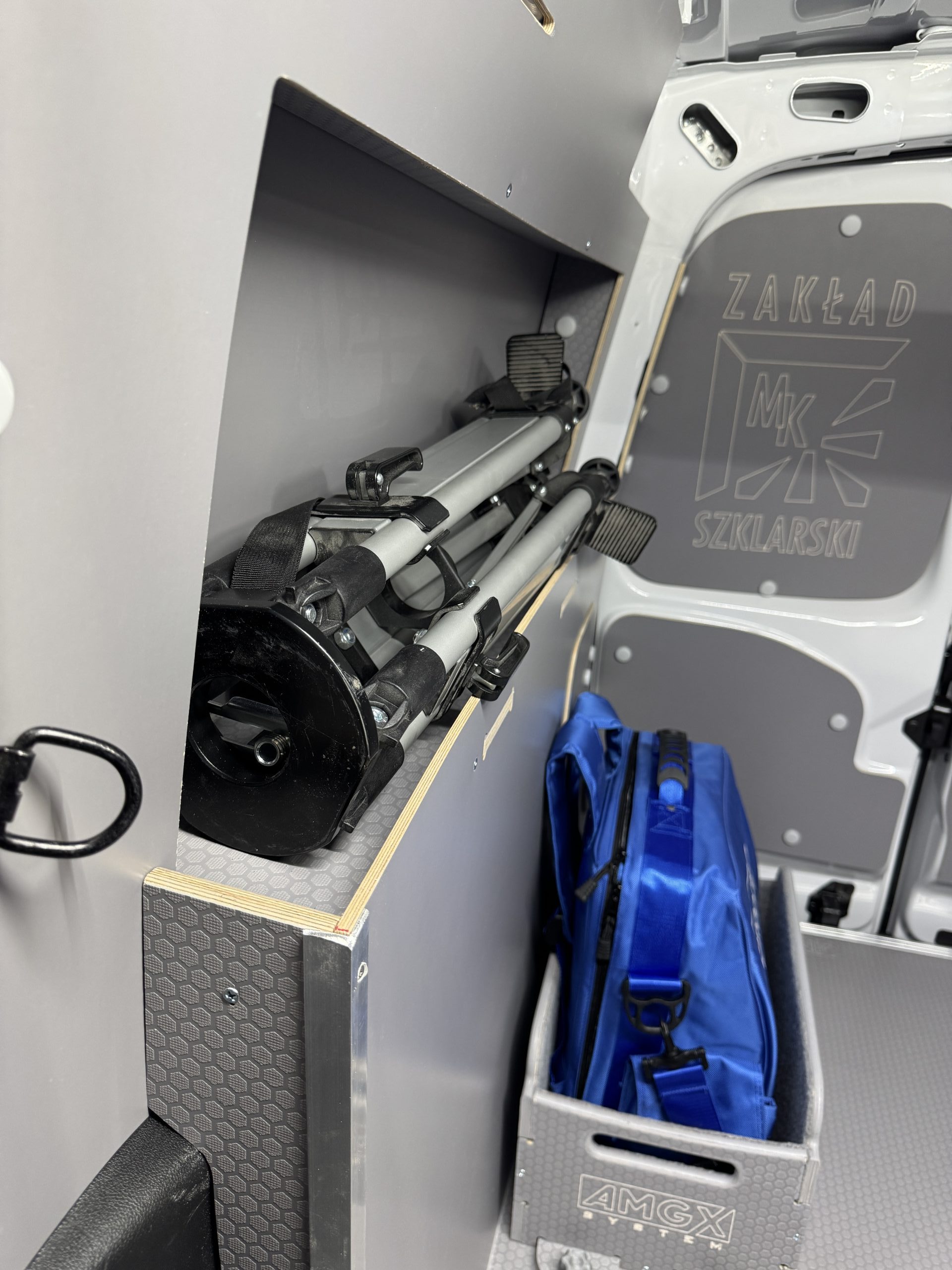 W zabudowie zamontowaliśmy listwę Airline z LED na suficie, która oświetla wnętrza pojazdu. Dodaliśmy pas automatyczny do listwy oraz uchwyty oczkowe, które zapewniają bezpieczny przewóz stojaka transportowego ze szkłem. Zabudowę wykonaliśmy w taki sposób, aby był dostęp do schowka w bocznej ścianie.