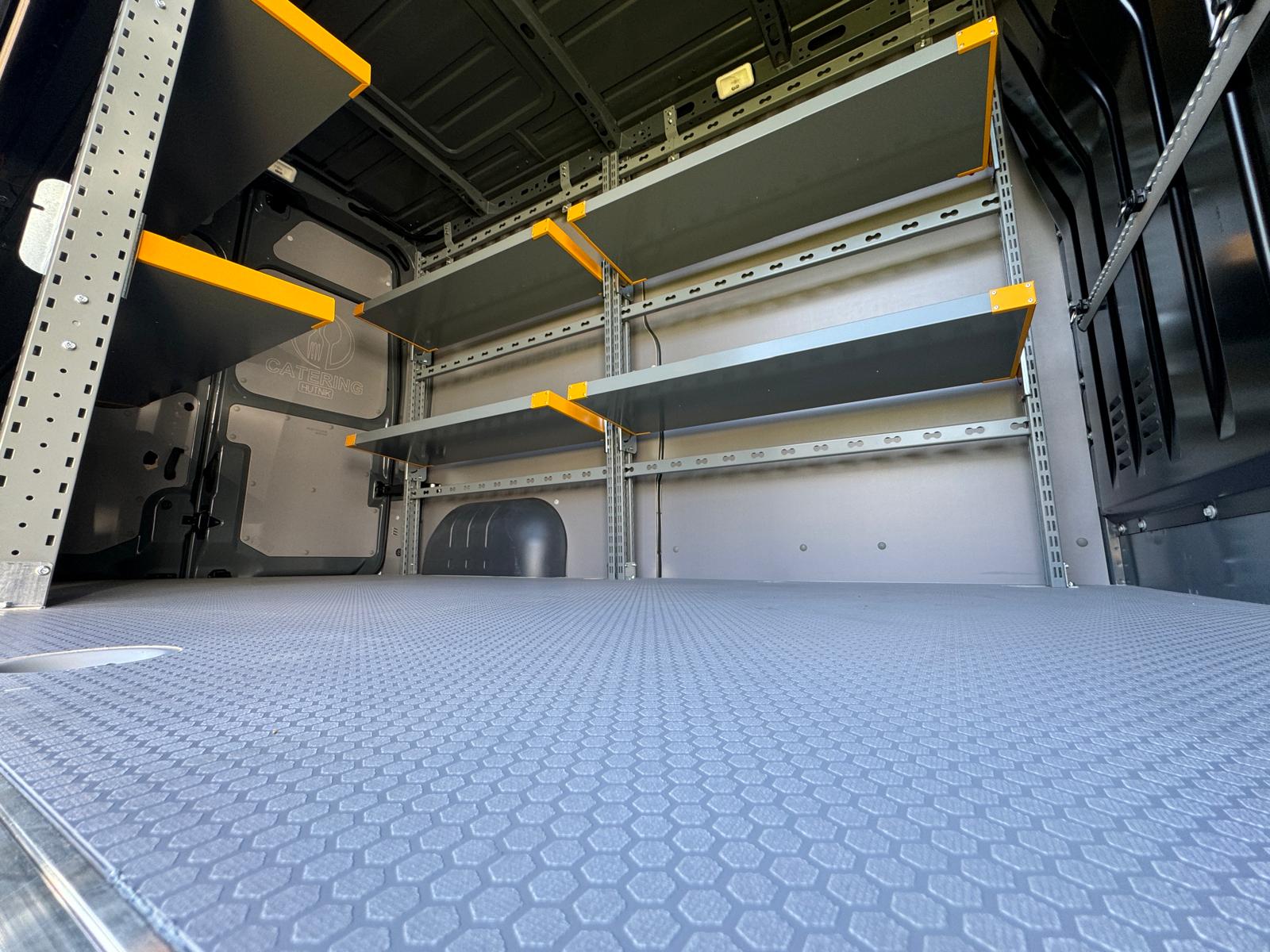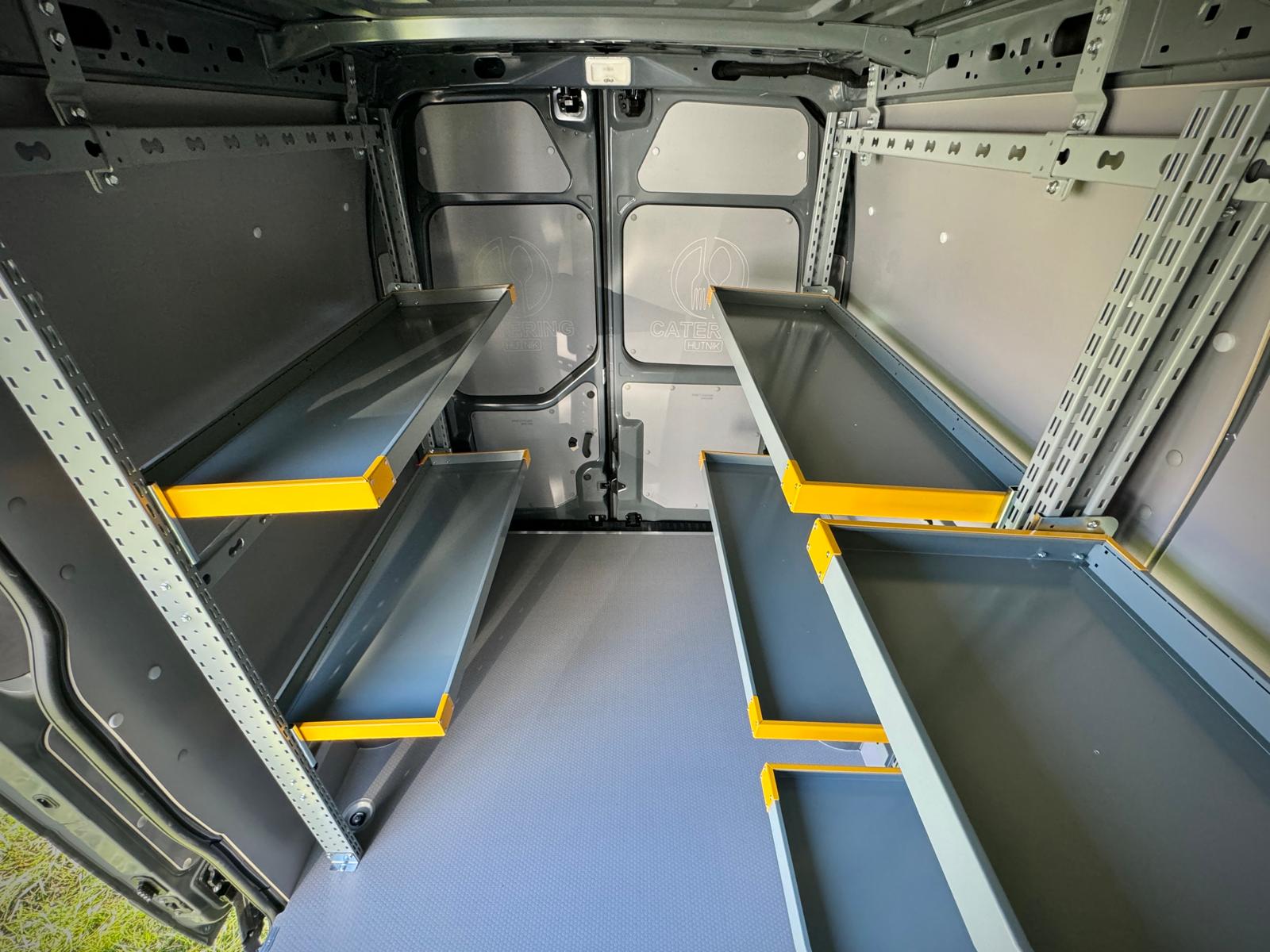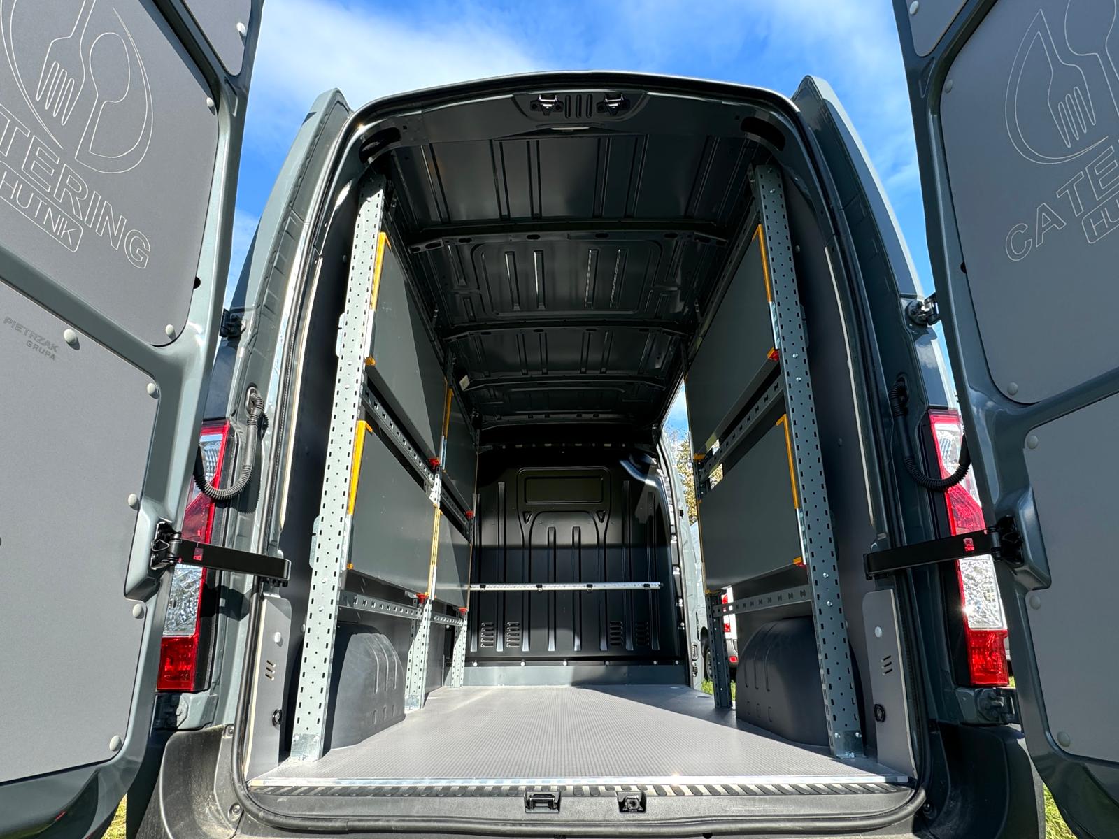 Zabudowa wewnętrzna przygotowana z myślą o transporcie jedzenia, półproduktów, napojów i sprzętu gastronomicznego – idealna dla firm cateringowych, food trucków czy dostawców.