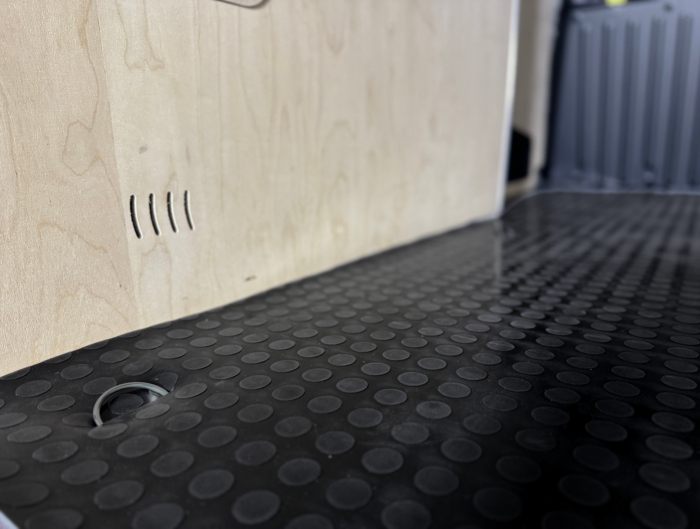 Podłogę wyłożyliśmy dopasowaną matą gumową, która skutecznie zapobiega przesuwaniu się przewożonych skrzynek. Dodatkowo w nadkolu zamontowaliśmy demontowane zabezpieczenie otworu rewizyjnego.