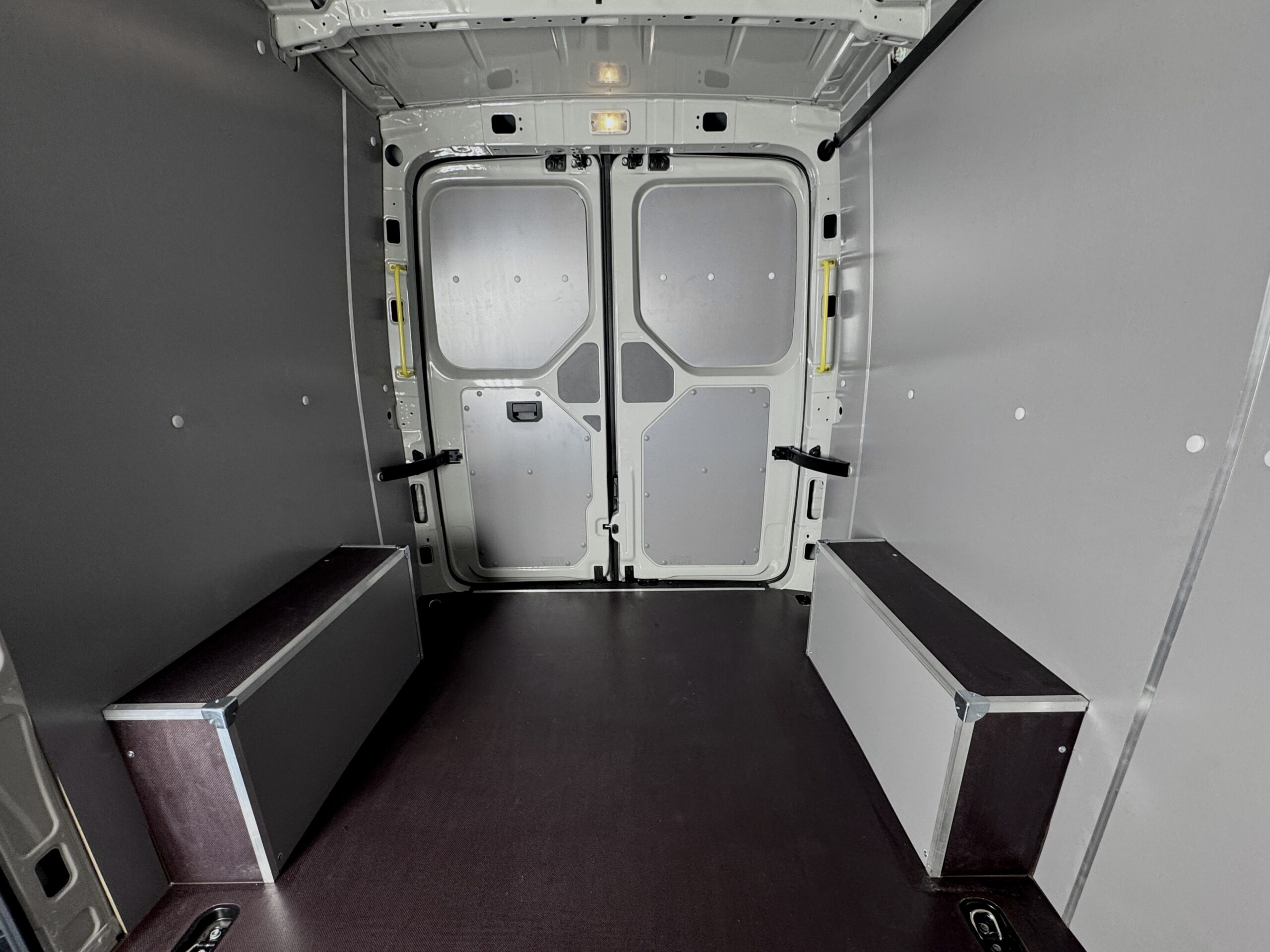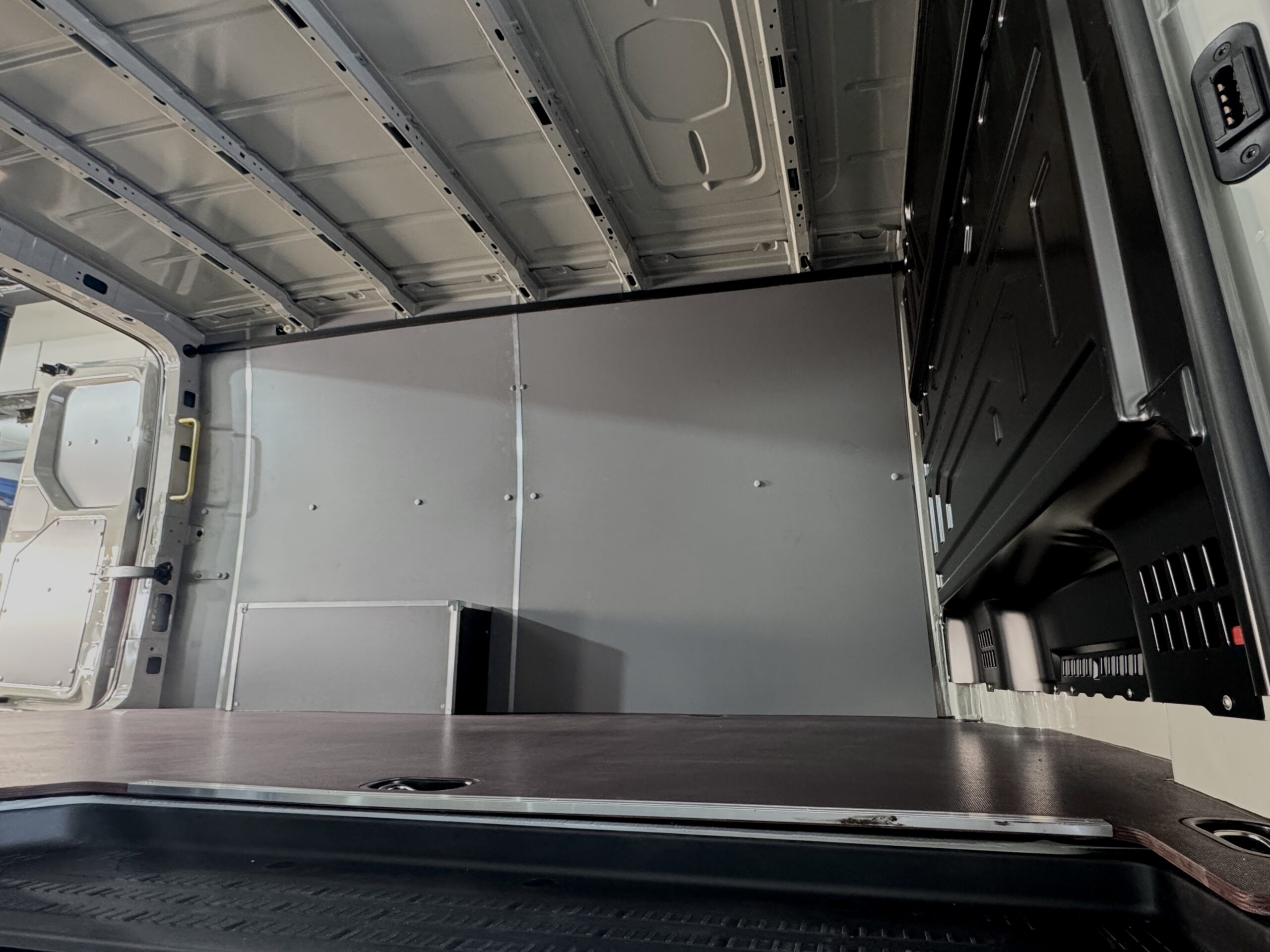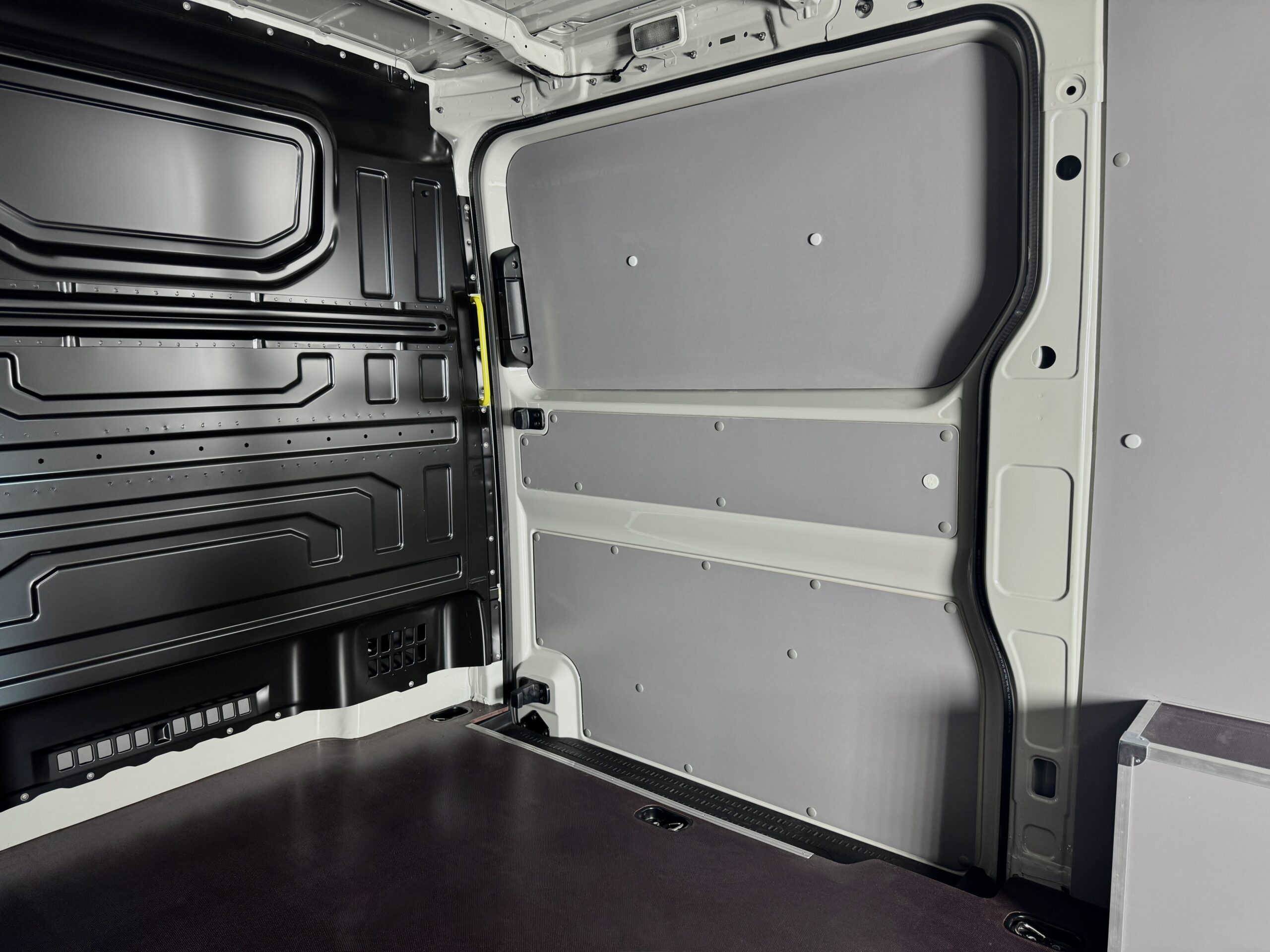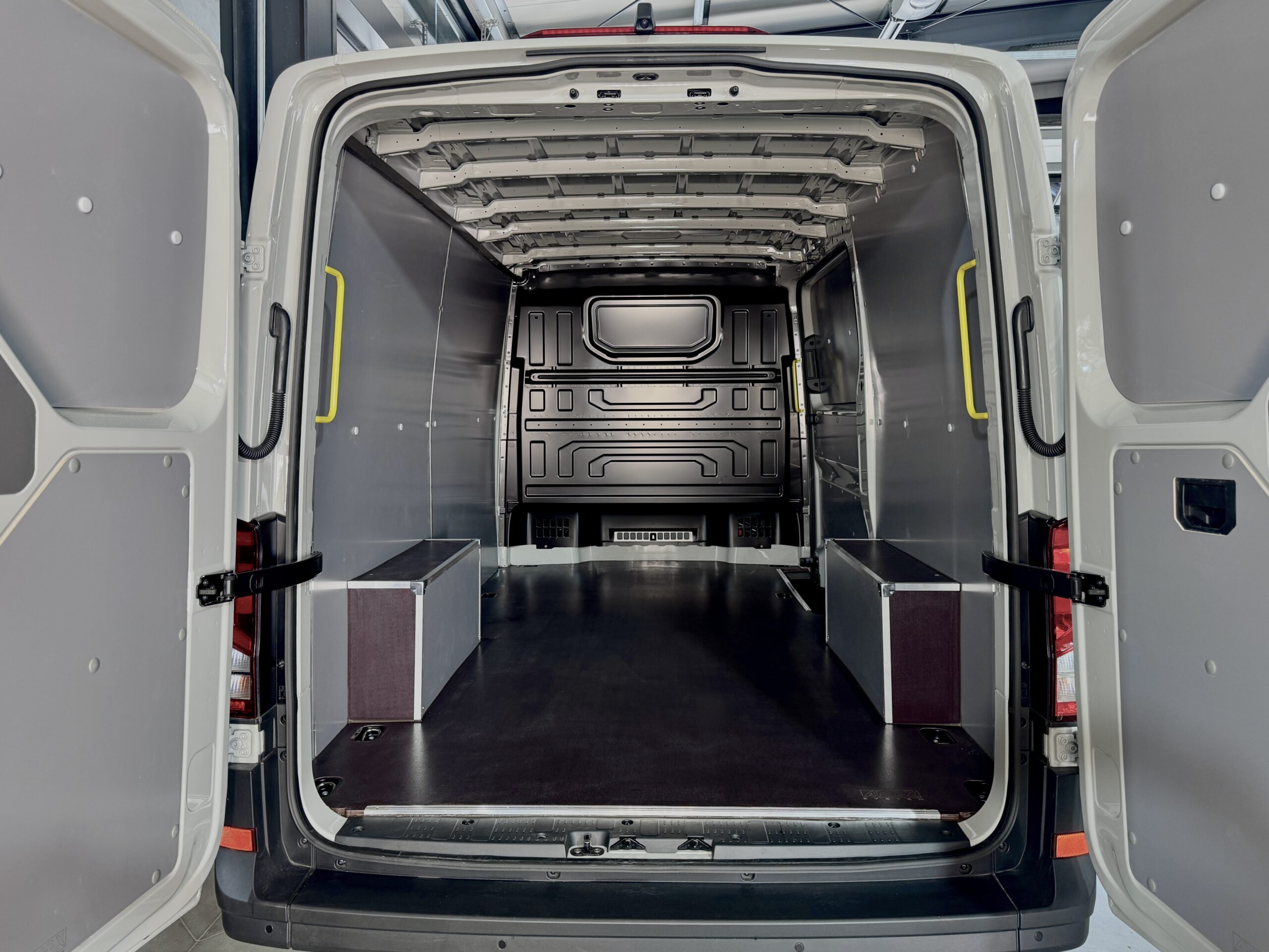 Wykonaliśmy zabudowę przestrzeni ładunkowej w Volkswagenie Crafterze L2H1, łącząc dwa typy sklejek: premium i standard. Na ściany boczne oraz drzwi zastosowaliśmy wodoodporną, obustronnie laminowaną sklejkę o grubości 6,5 mm – materiał z kategorii premium, który wyróżnia się łatwością utrzymania czystości oraz wysoką trwałością. Poszczególne panele zostały połączone aluminiowymi listwami, które zapewniają zarówno solidność konstrukcji, jak i estetyczne wykończenie.