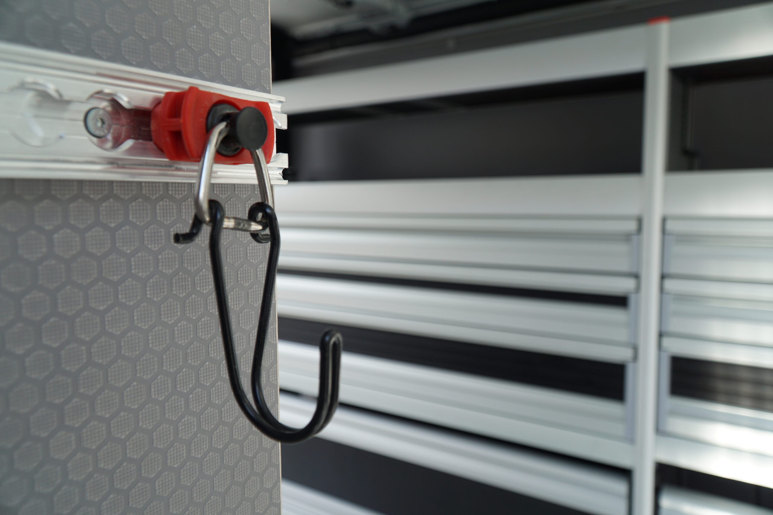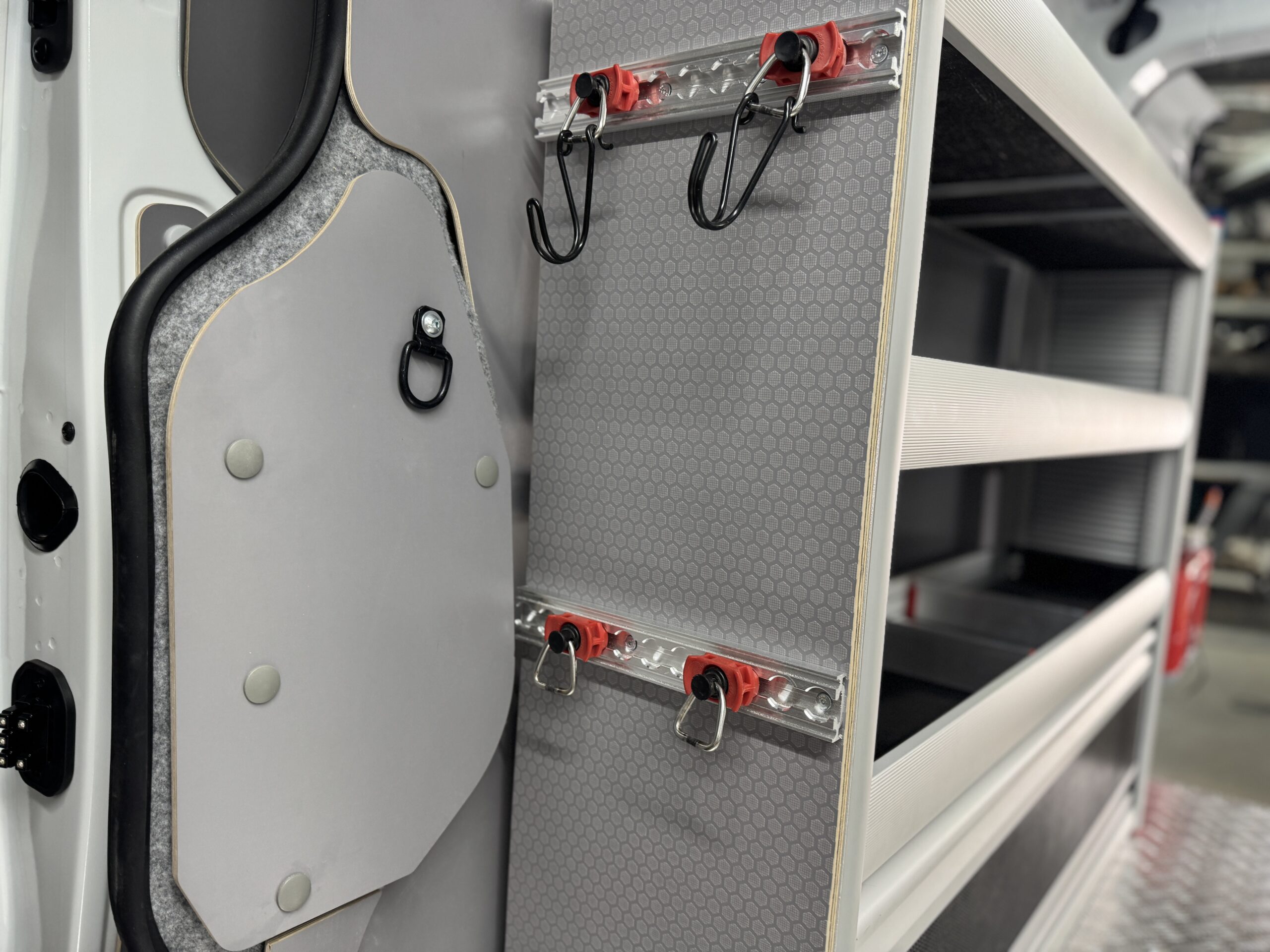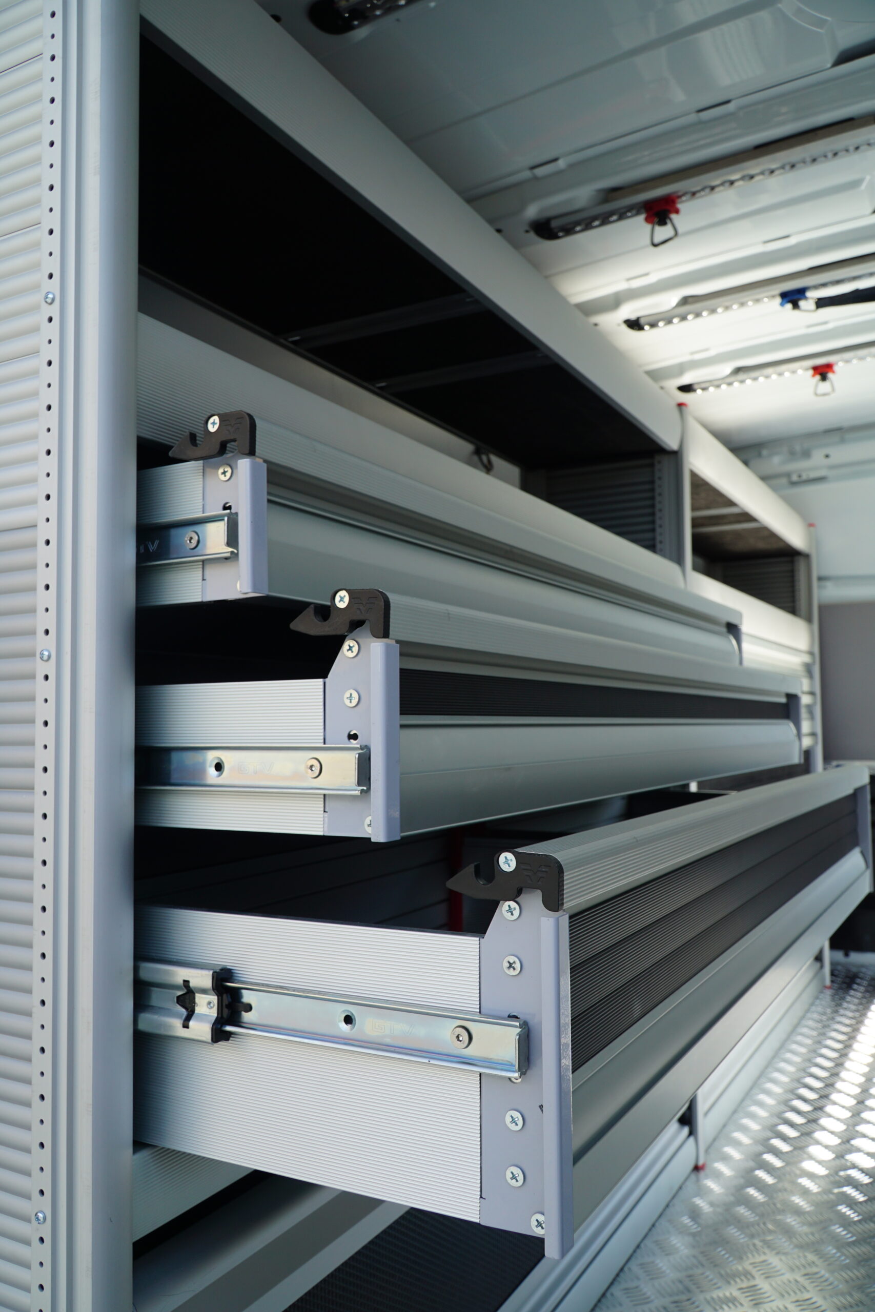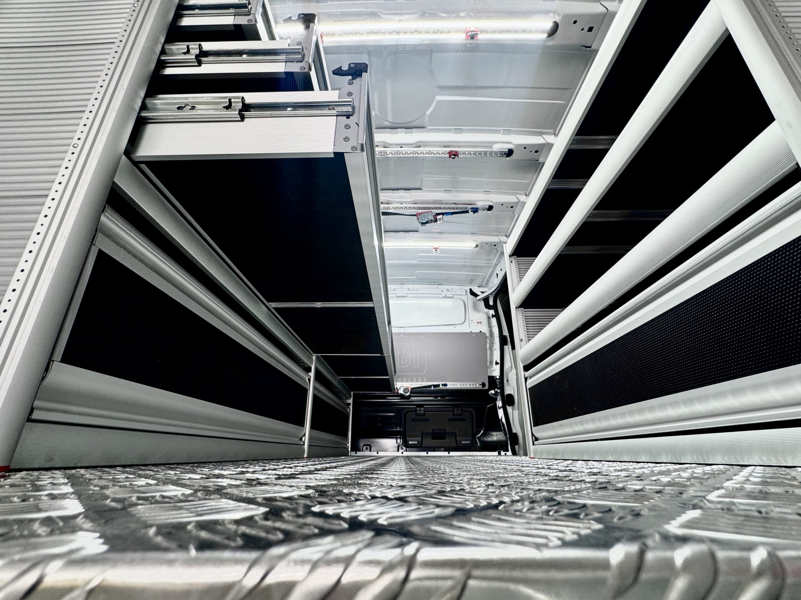 Zamontowaliśmy regały renomowanej włoskiej firmy GEMA, znanej z solidnych i modułowych rozwiązań. Zastosowany system pozwala elastycznie dopasować przestrzeń ładunkową do indywidualnych potrzeb, zapewniając optymalną organizację narzędzi i sprzętu.