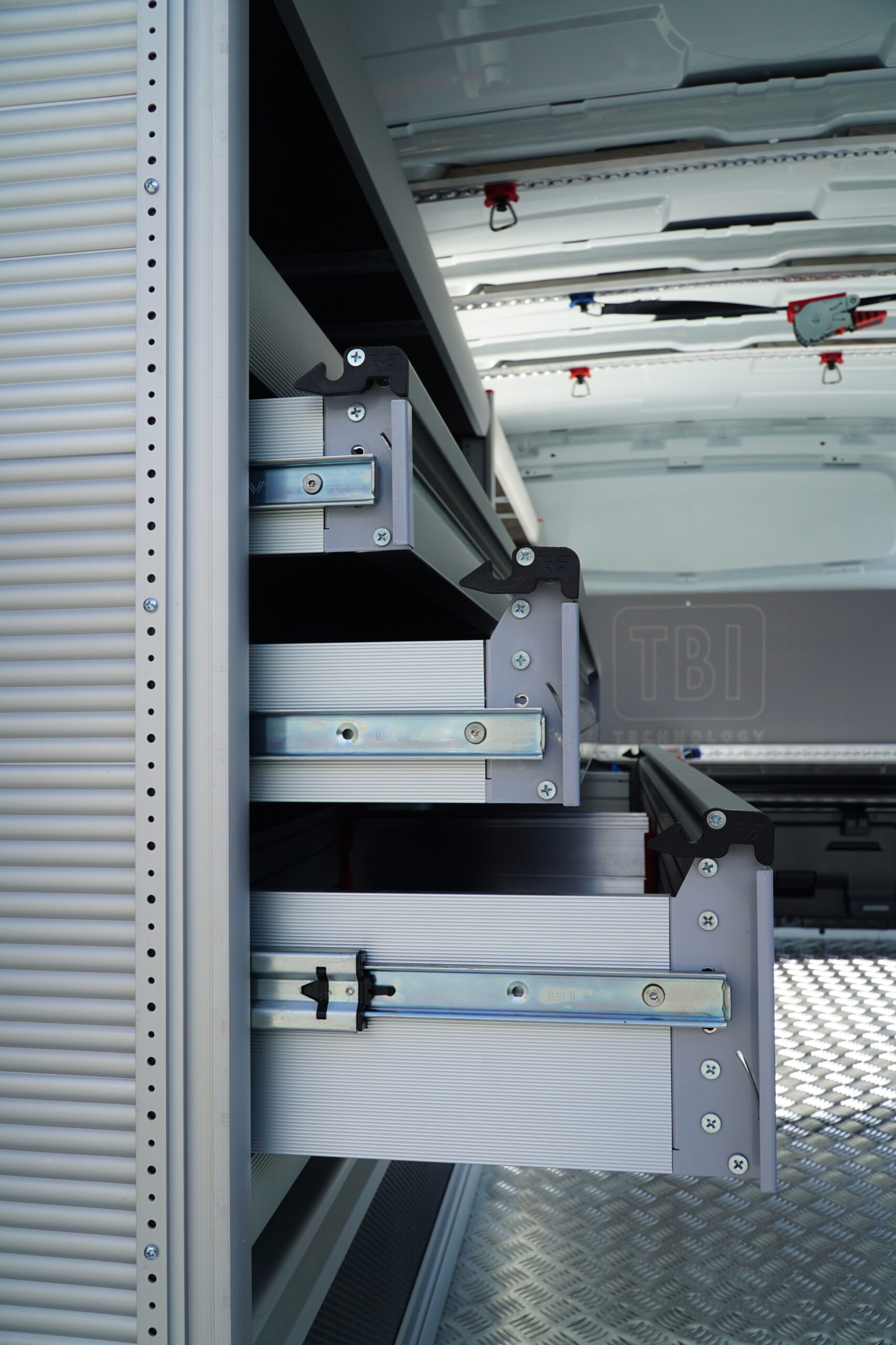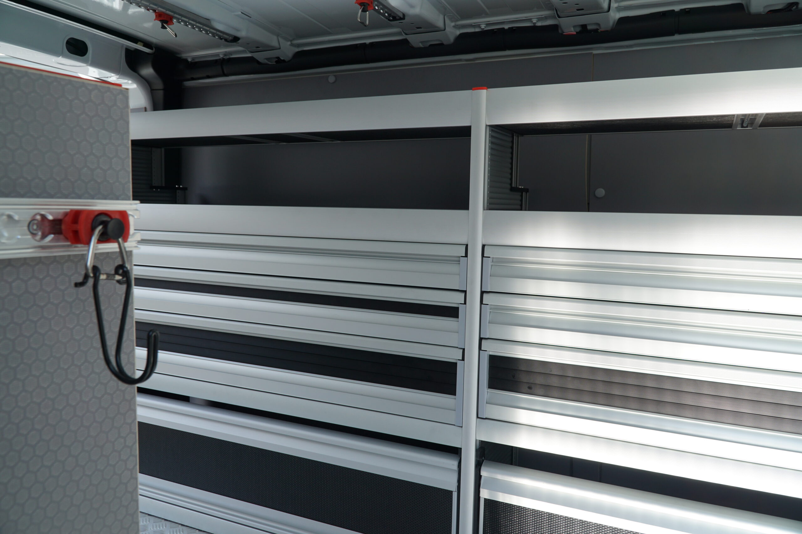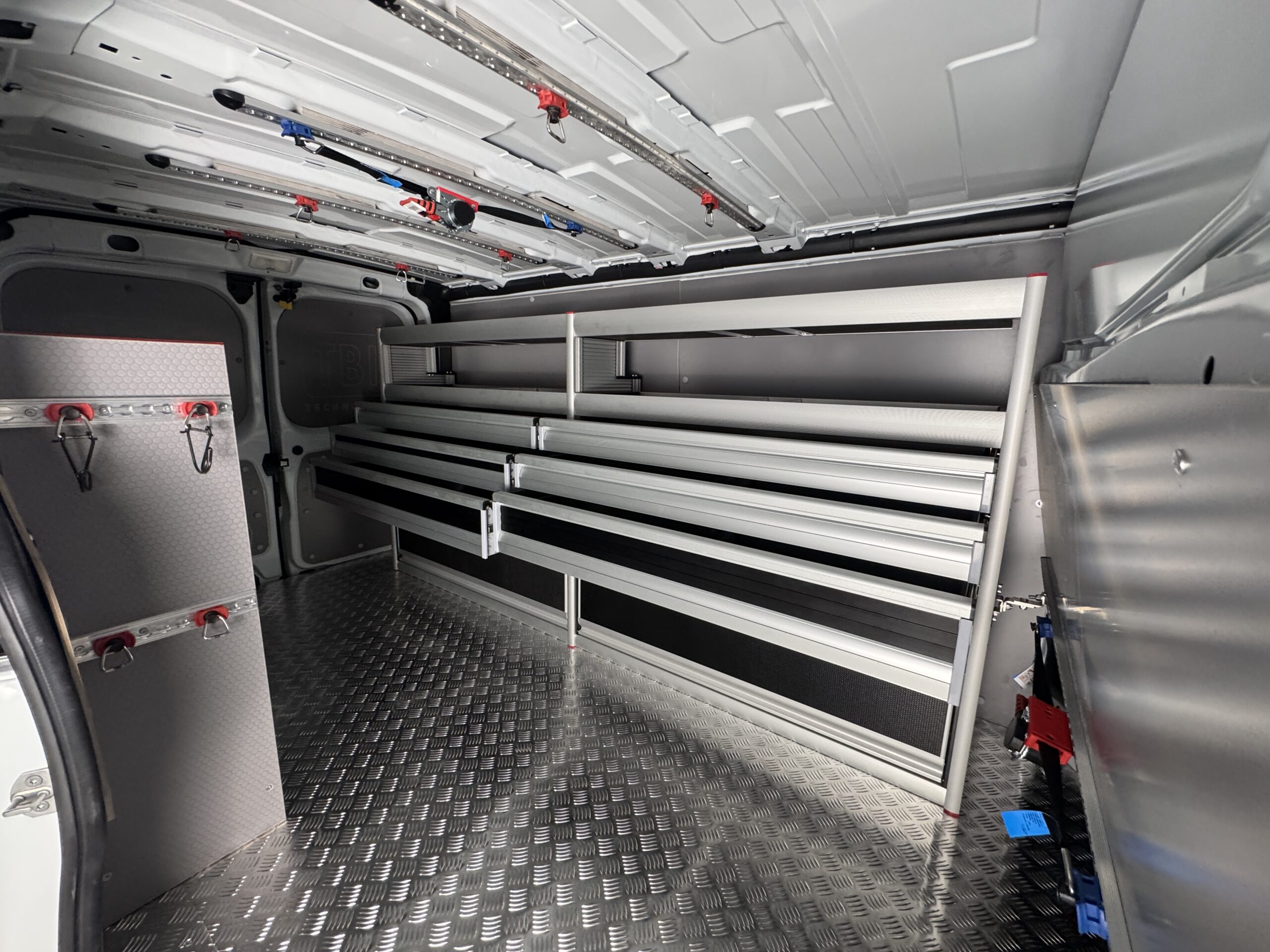 Zamontowaliśmy regały renomowanej włoskiej firmy GEMA, znanej z solidnych i modułowych rozwiązań. Zastosowany system pozwala elastycznie dopasować przestrzeń ładunkową do indywidualnych potrzeb, zapewniając optymalną organizację narzędzi i sprzętu.