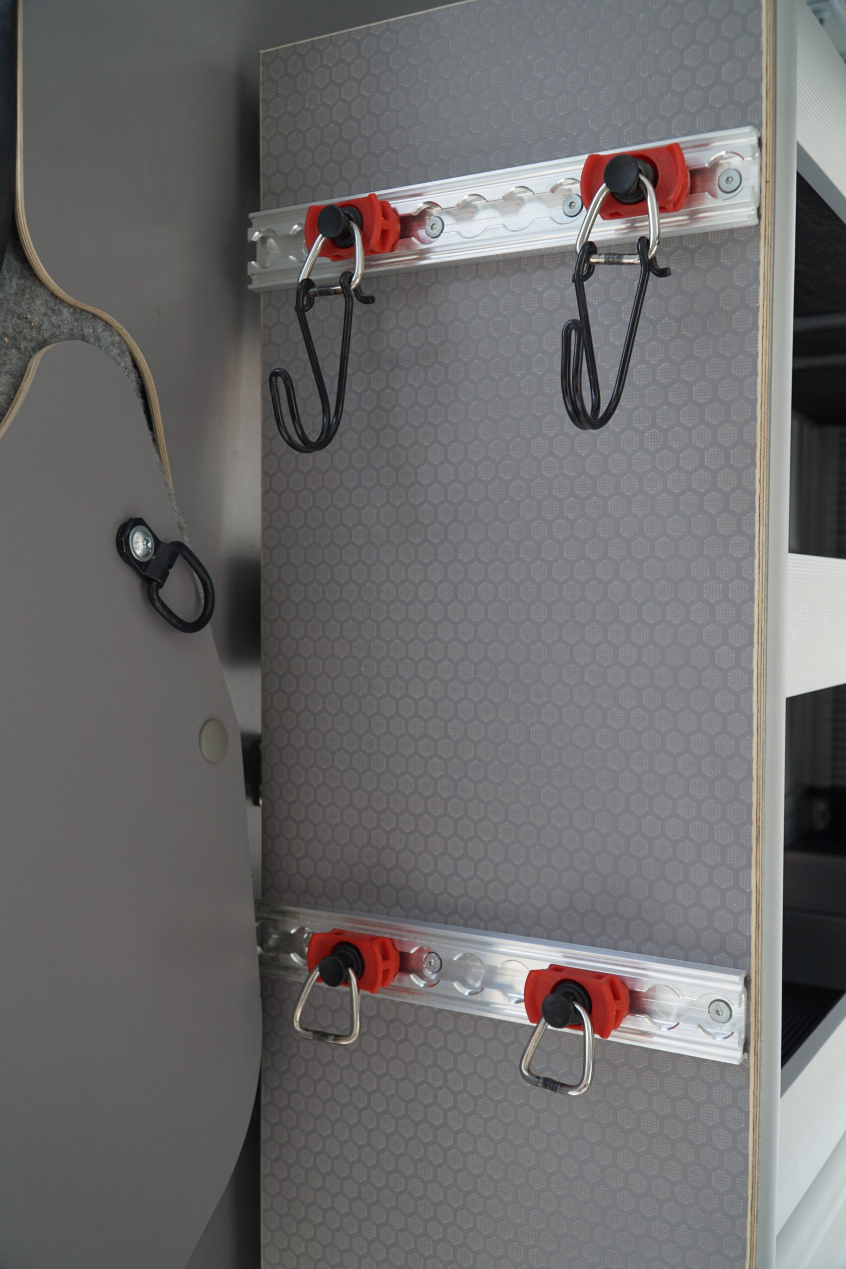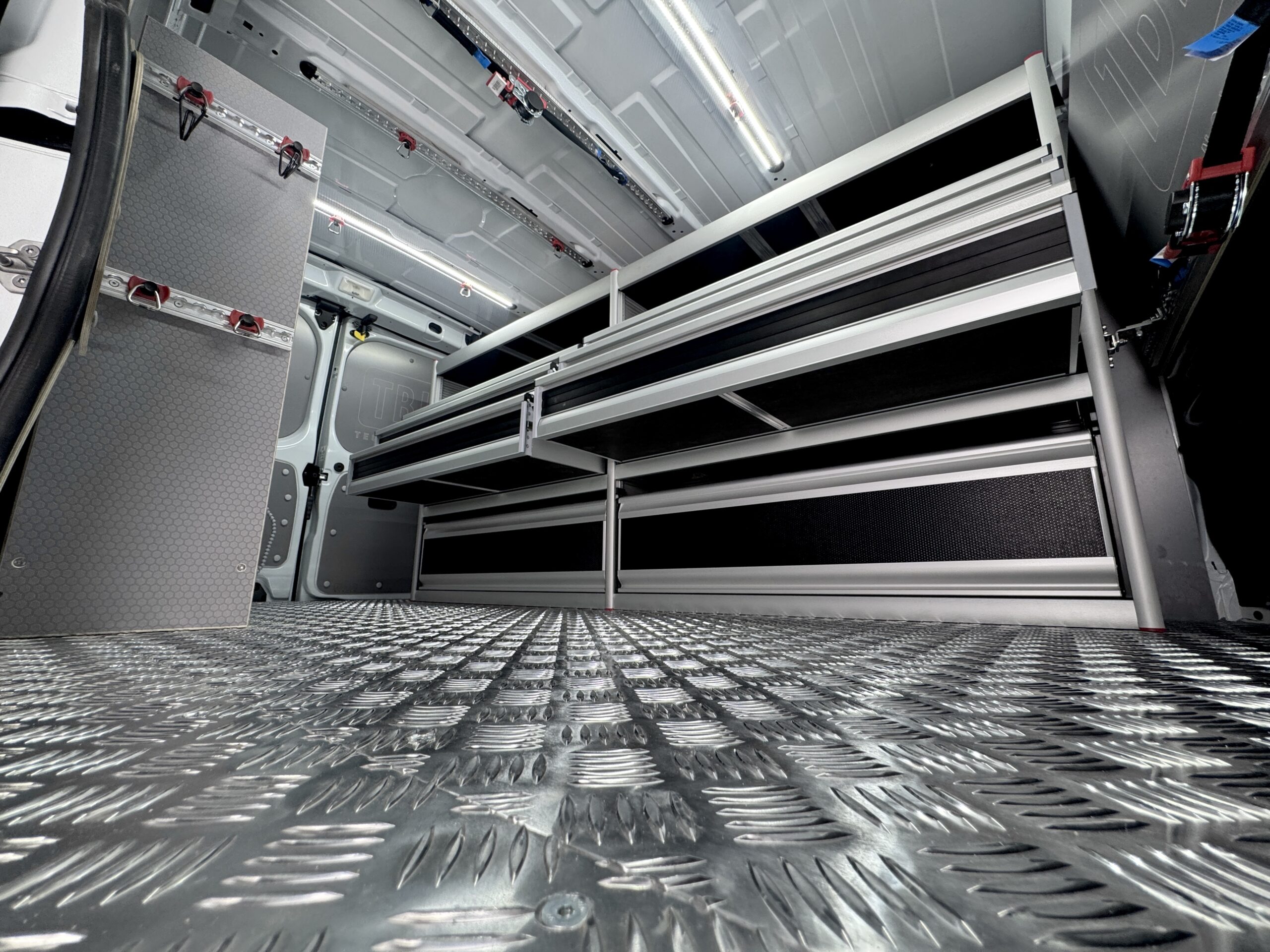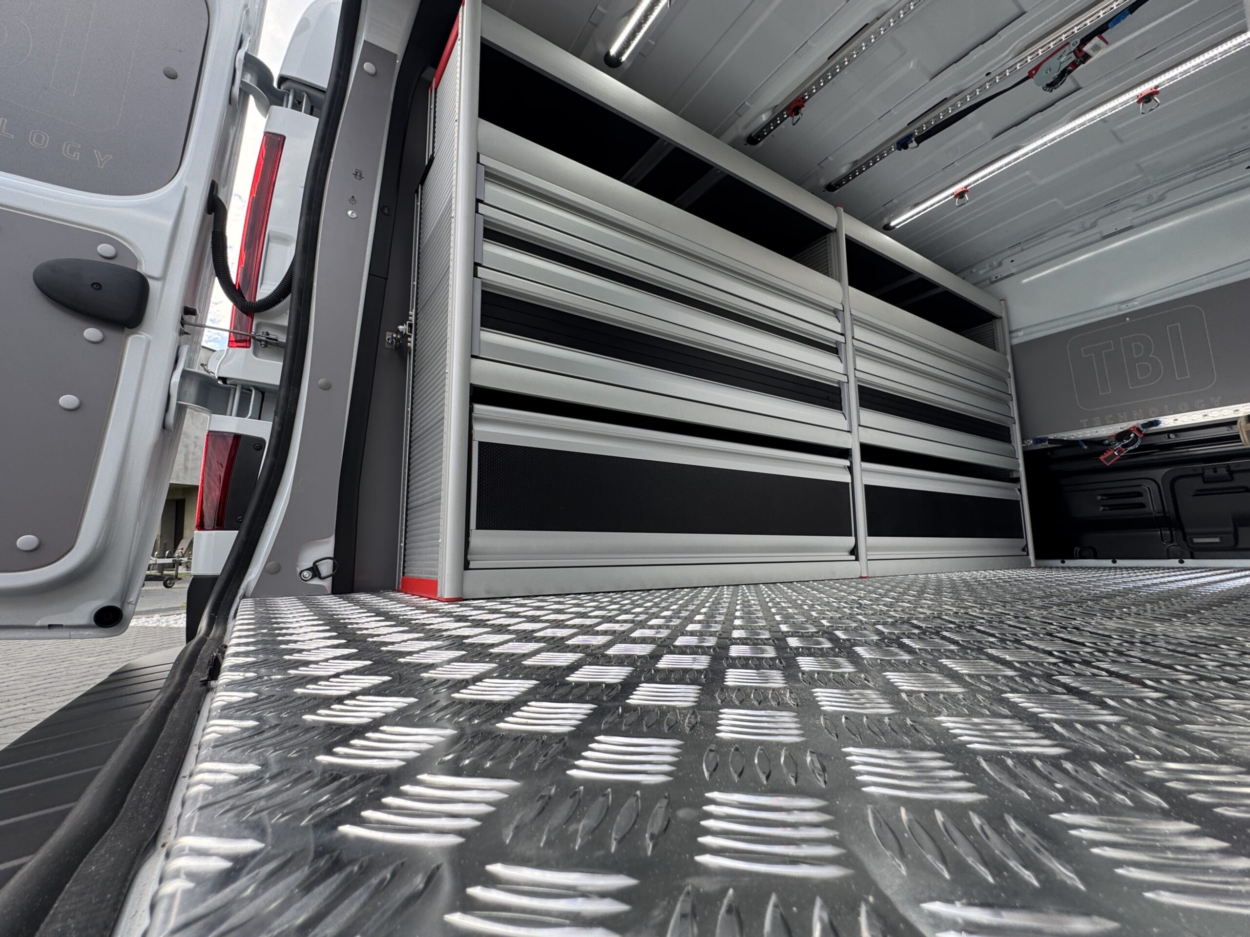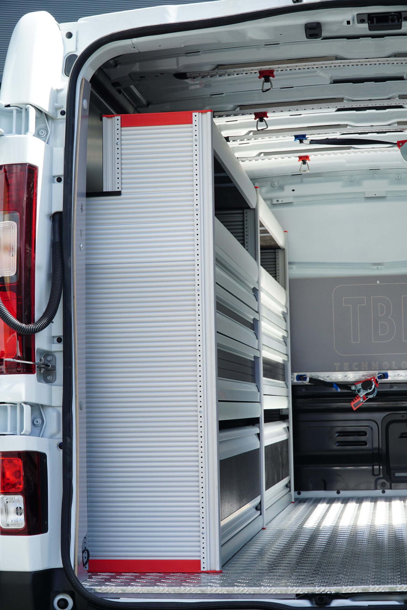 Zamontowaliśmy regały renomowanej włoskiej firmy GEMA, znanej z solidnych i modułowych rozwiązań. Zastosowany system pozwala elastycznie dopasować przestrzeń ładunkową do indywidualnych potrzeb, zapewniając optymalną organizację narzędzi i sprzętu.
