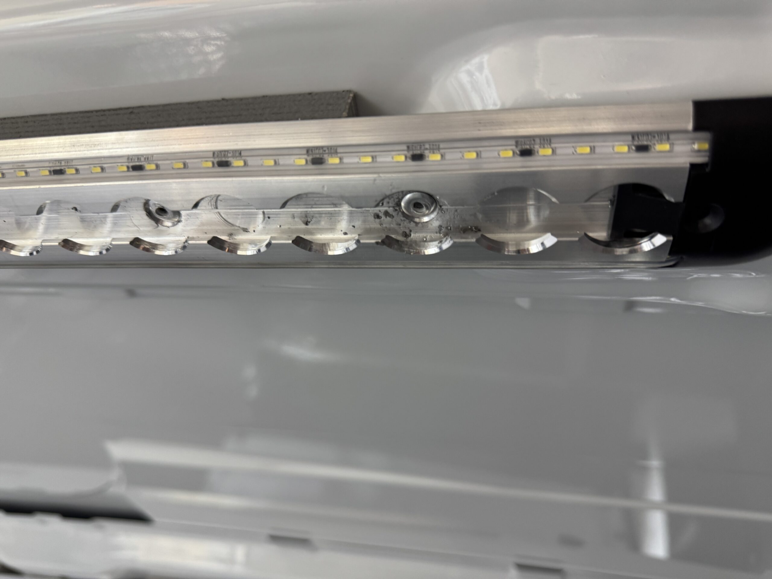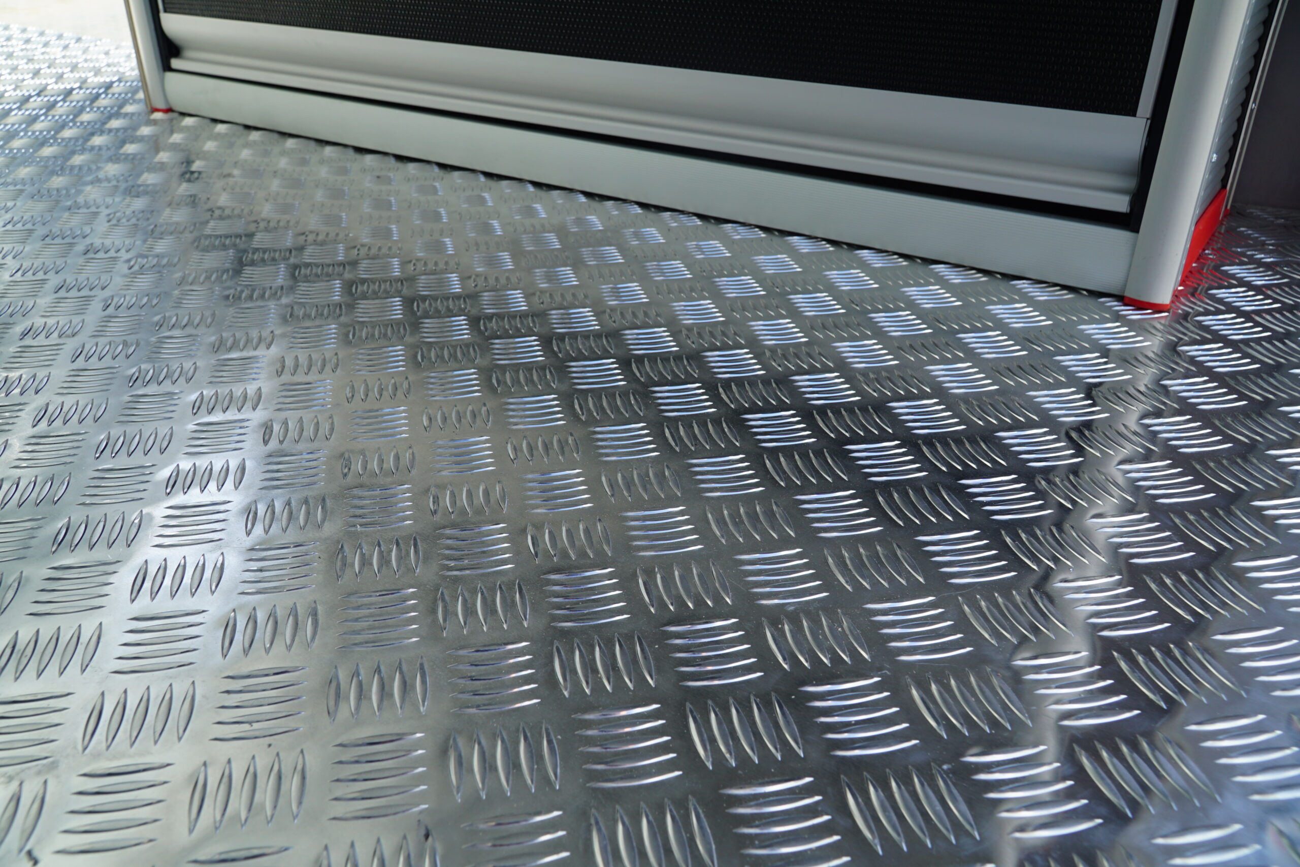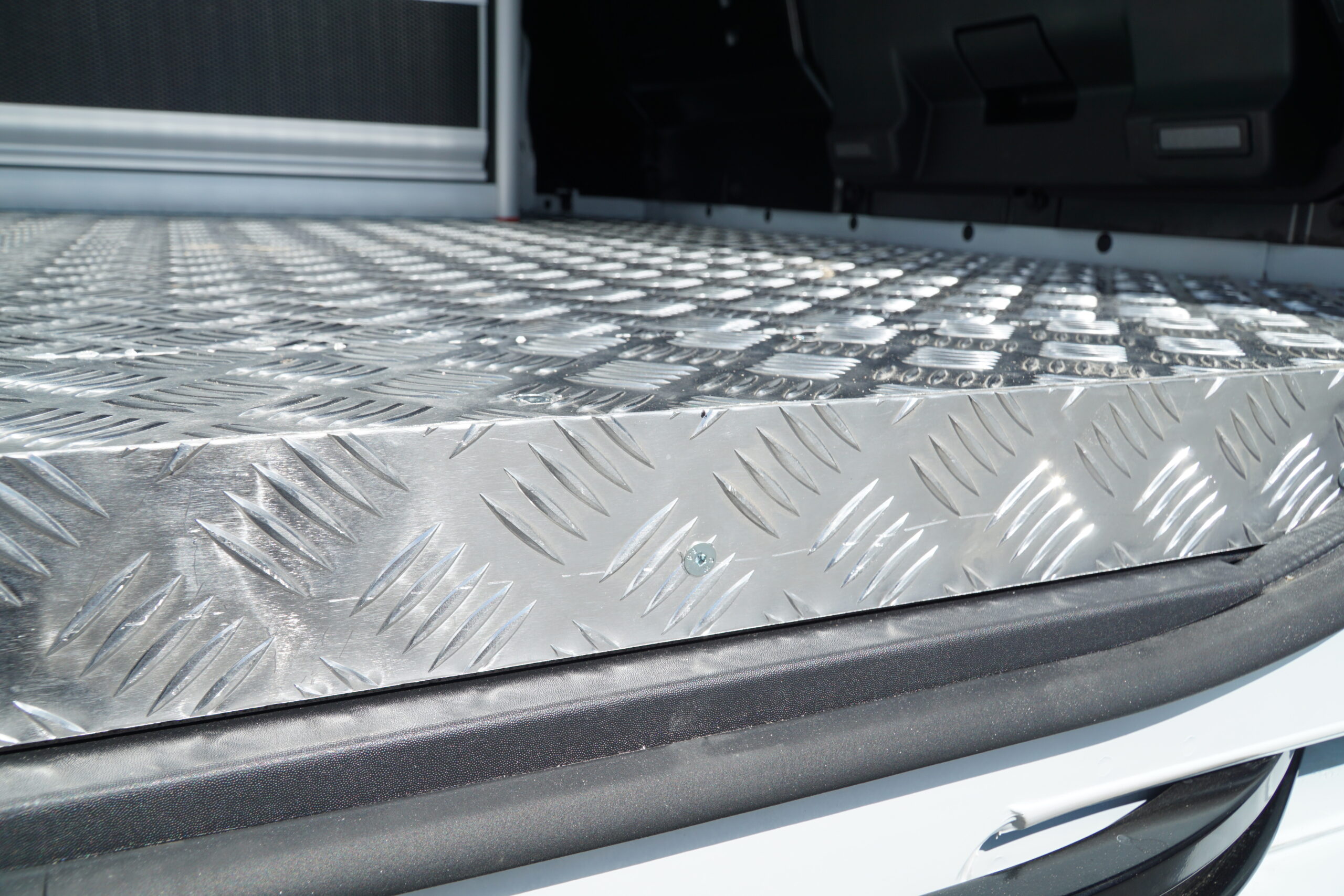 Na podłodze zamontowaliśmy blachę ryflowaną, odporną na intensywną eksploatację, osadzoną na 12 mm sklejce. Uzupełnieniem zabudowy jest zabudowanie i wykończenie progu drzwi bocznych, które poprawia zarówno estetykę, jak i funkcjonalność wnętrza.
