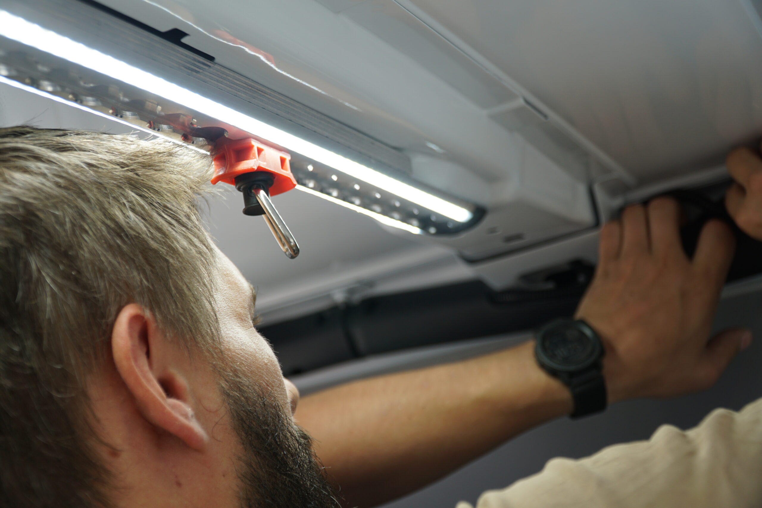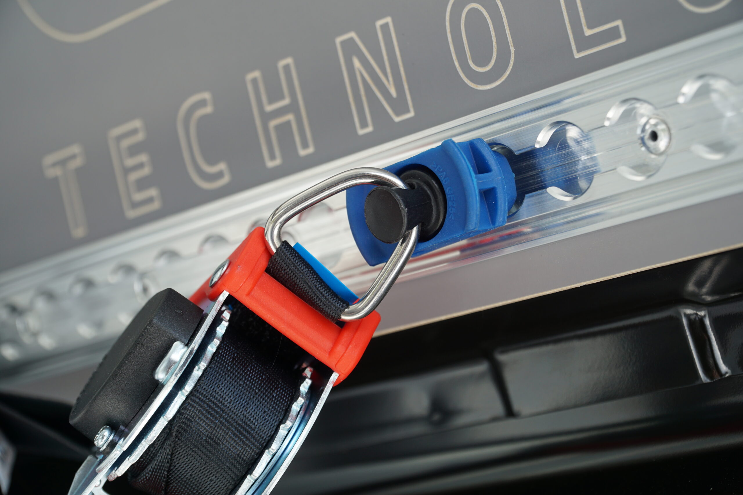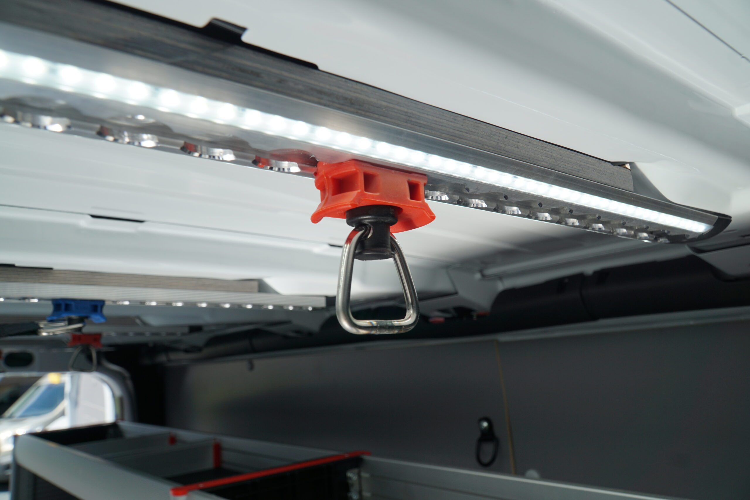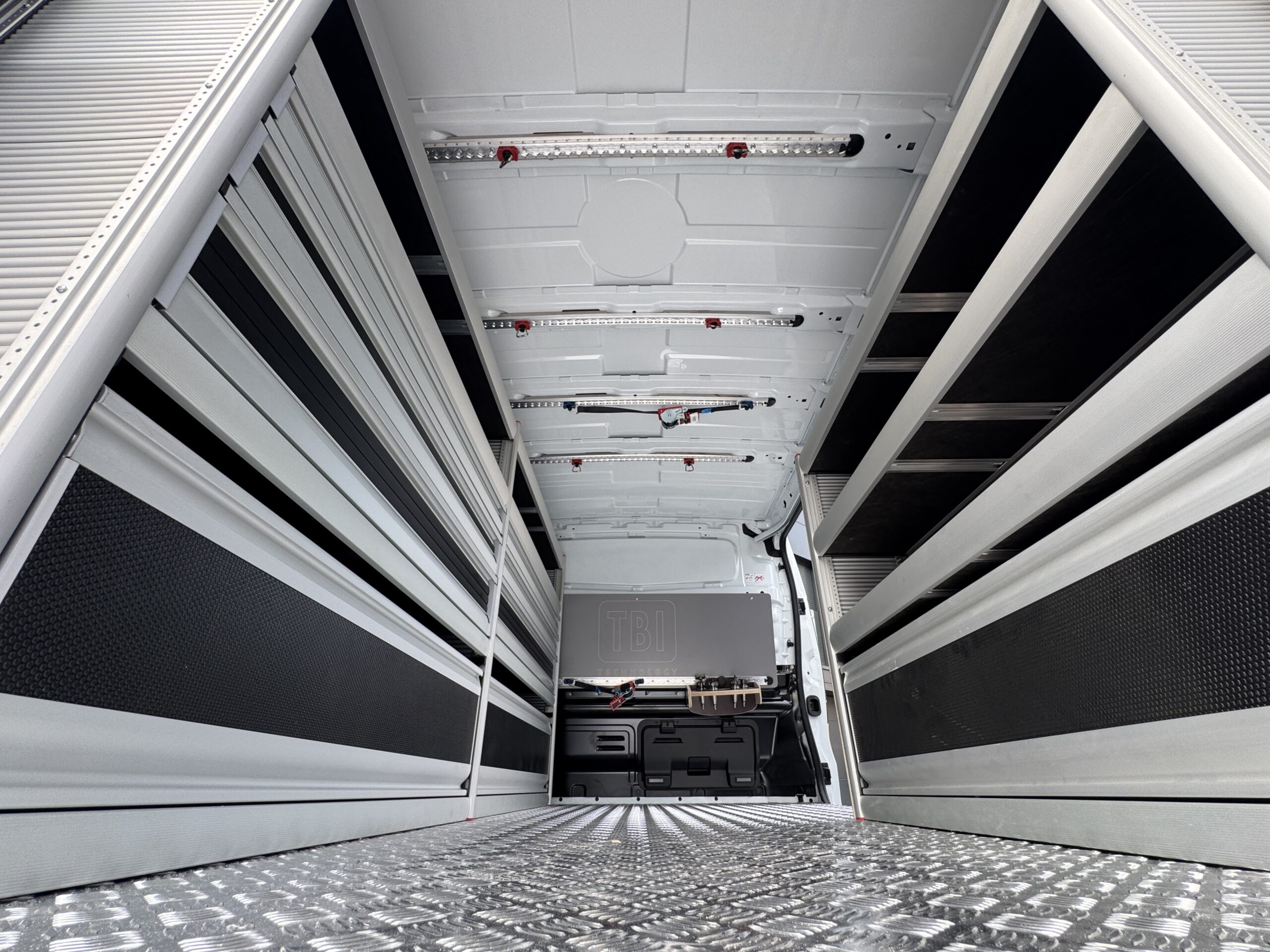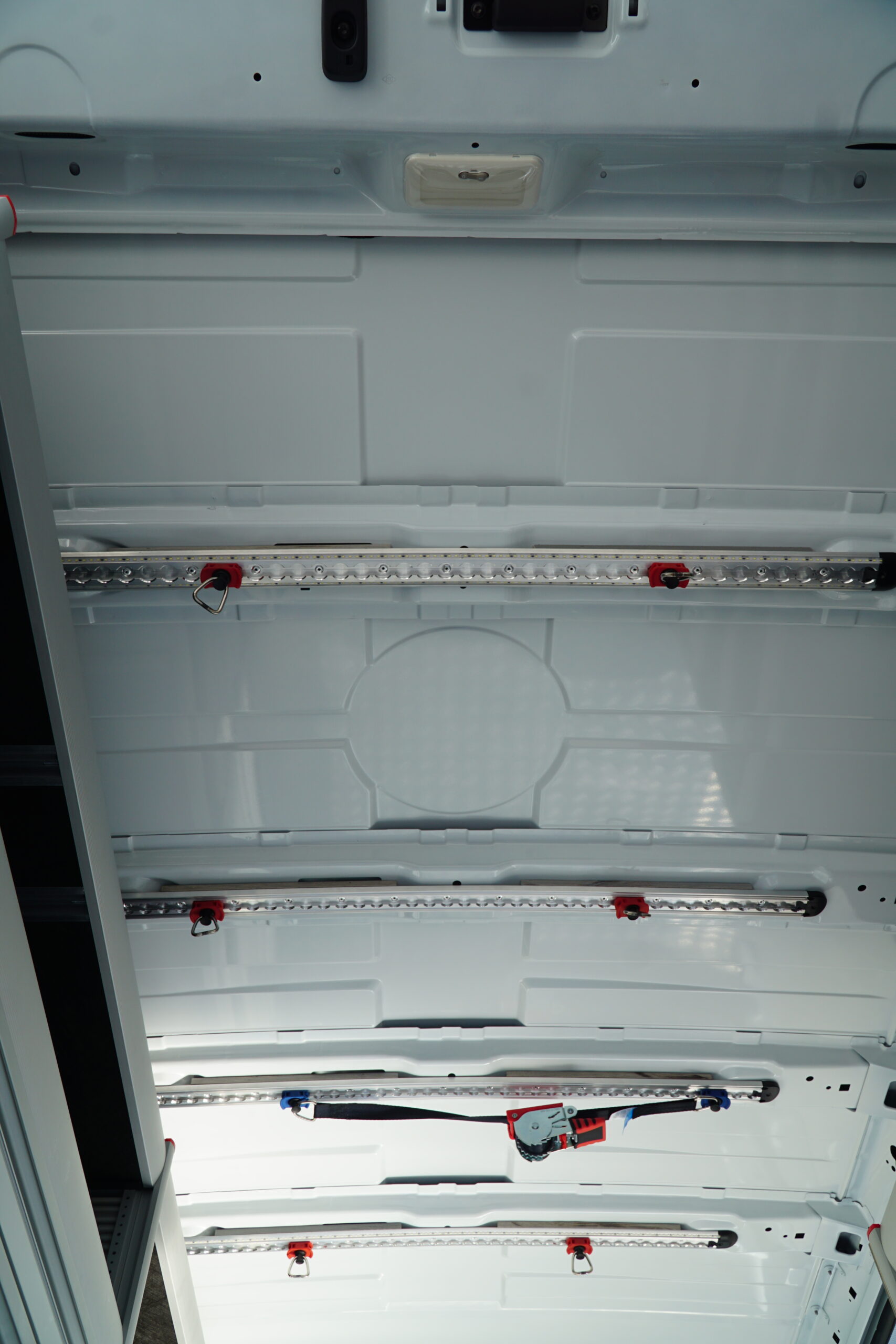Na suficie, przy drzwiach bocznych oraz na ścianie grodziowej zamontowaliśmy listwy mocujące Airline marki WISTRA. Listwy sufitowe zostały wyposażone w oświetlenie LED, które poprawia komfort pracy. Całość uzupełniliśmy o uchwyty mocujące, haki oraz pasy, umożliwiające bezpieczny transport ładunku.