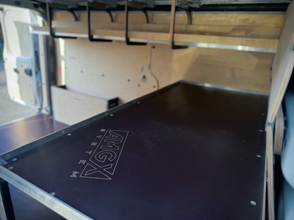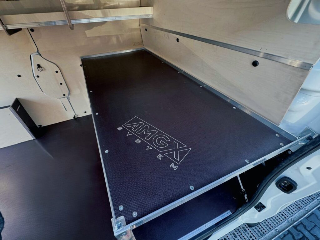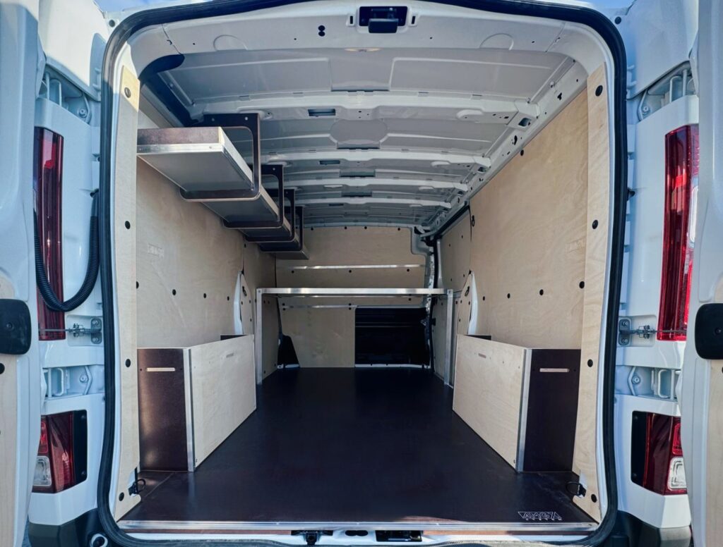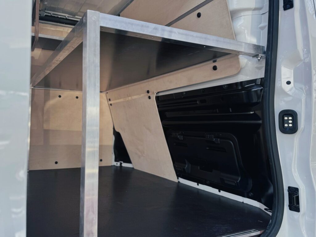 Powiększone nadkola, wzbogacone o praktyczne schowki, oferują doskonałą przestrzeń do przechowywania mniejszych przedmiotów, jednocześnie pomagając utrzymać porządek we wnętrzu pojazdu. Zabezpieczone sklejką boki oraz grodziowa ściana z dostępem do otwieranego schowka zapewniają stabilność i bezpieczeństwo przewożonego sprzętu, a sama konstrukcja samochodu jest skutecznie chroniona przed uszkodzeniami. Dodatkowo, zamontowana po lewej stronie pojazdu podwieszana półka zwiększa przestronność, umożliwiając przechowywanie długich przedmiotów lub sprzętu. To kompleksowe rozwiązanie łączy funkcjonalność z optymalnym wykorzystaniem przestrzeni, sprawiając, że organizacja bagażu staje się bardziej wygodna i efektywna.