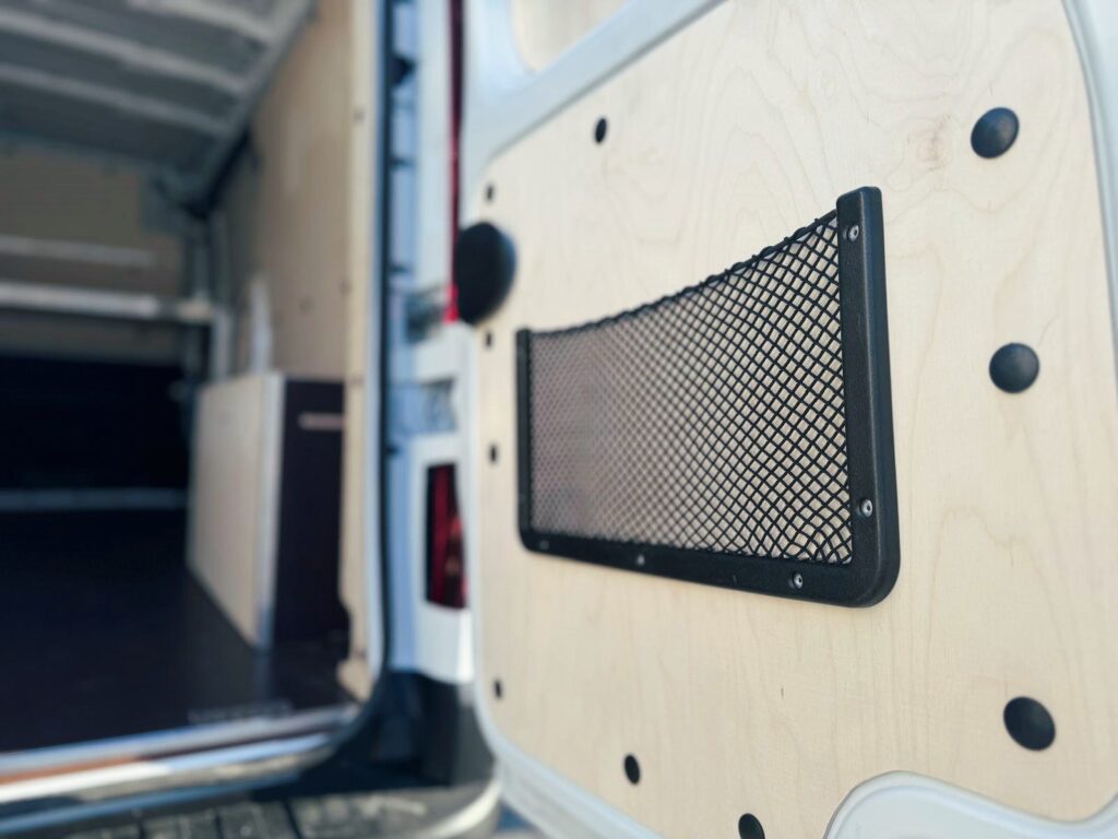 Zabudowa została zaprojektowana z myślą o codziennych potrzebach branży elektrycznej. Kieszeń elastyczna na drzwiach jest idealnym miejscem na przechowywanie akcesoriów, takich jak spreje czy drobne narzędzia, zapewniając szybki dostęp do niezbędnych przedmiotów. Uchwyty mocowania ładunku umożliwiają zabezpieczenie większych przedmiotów w trakcie transportu.