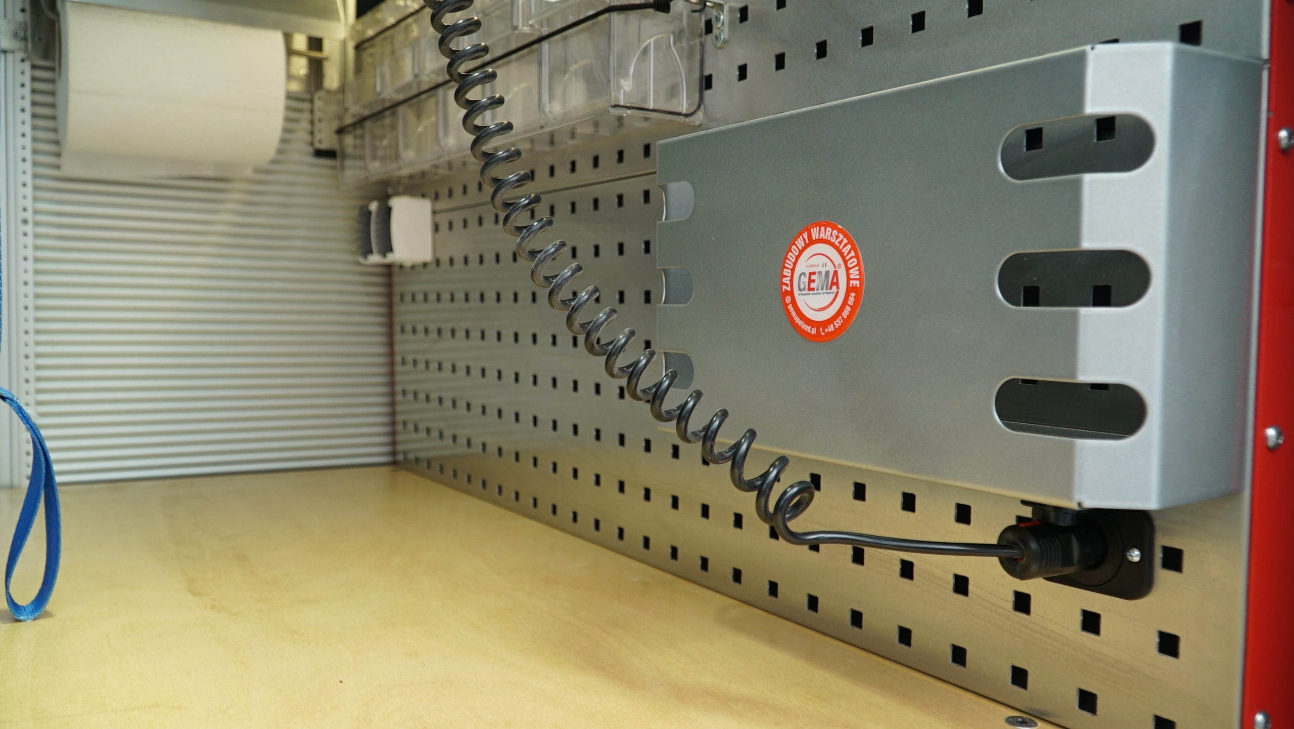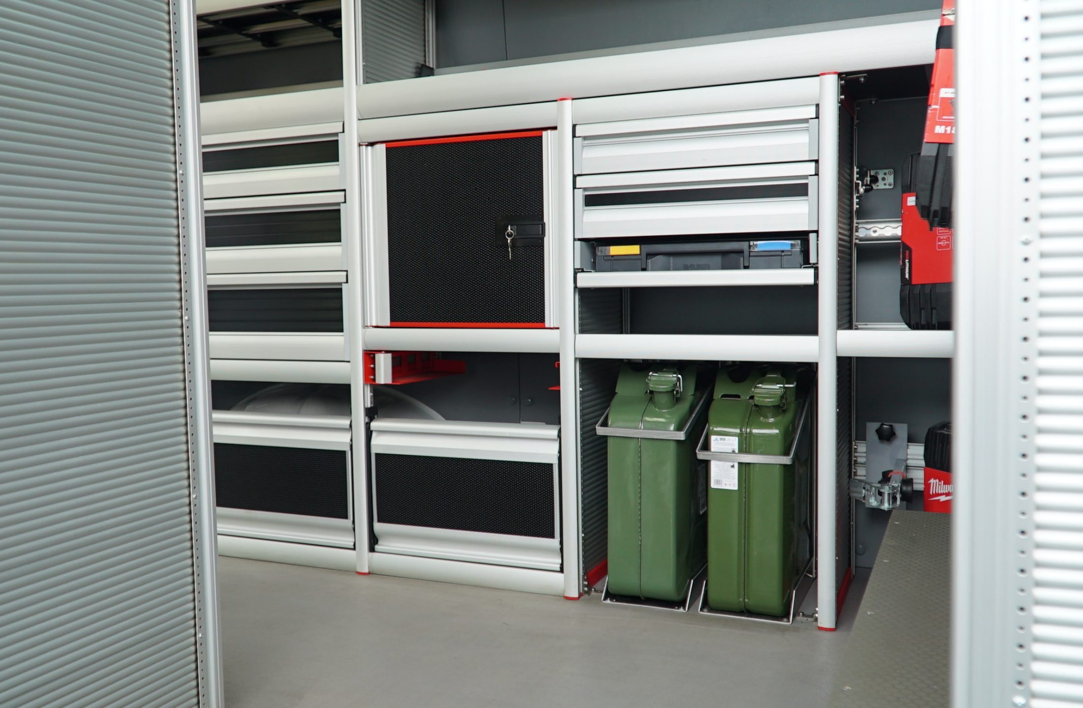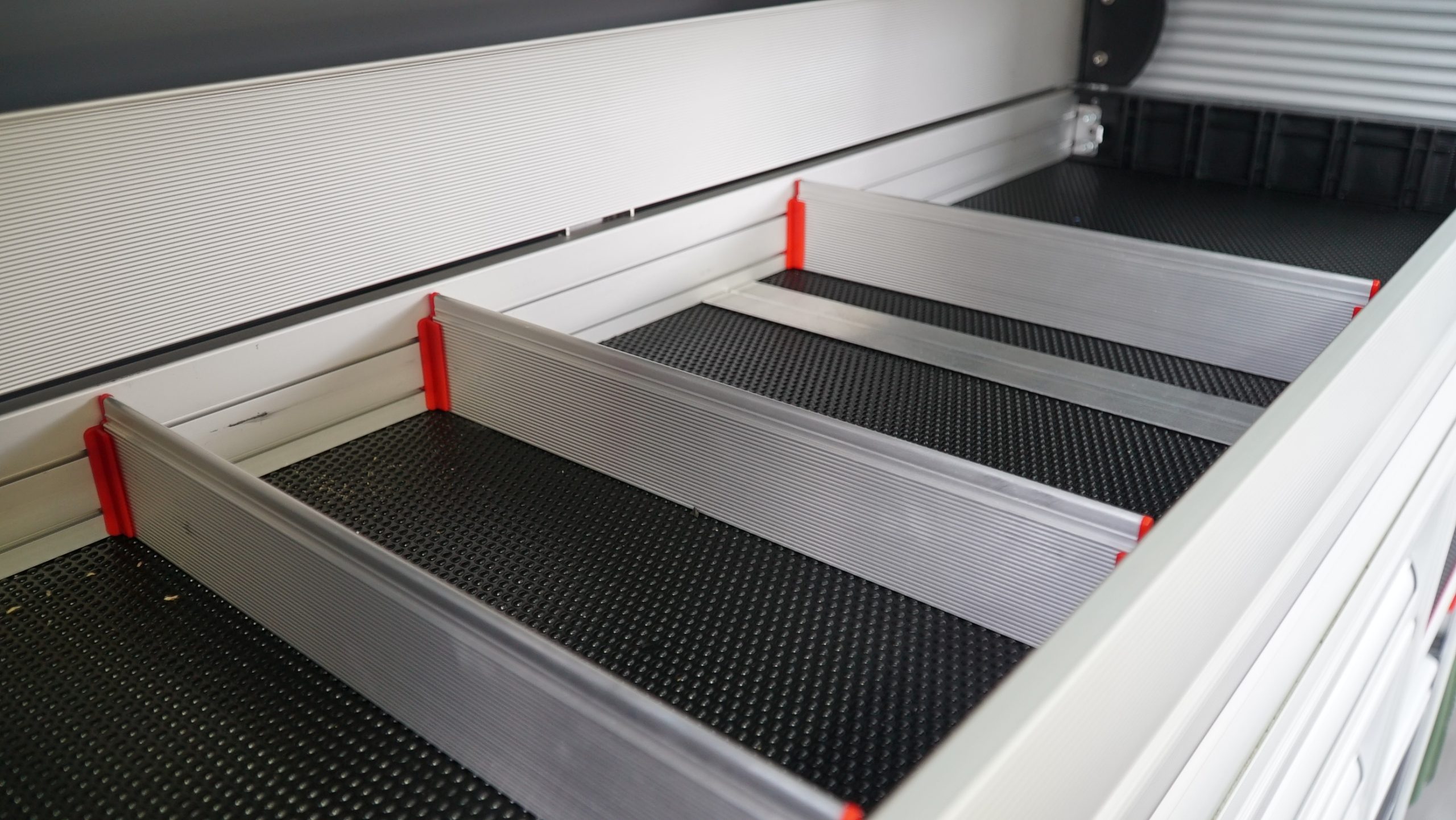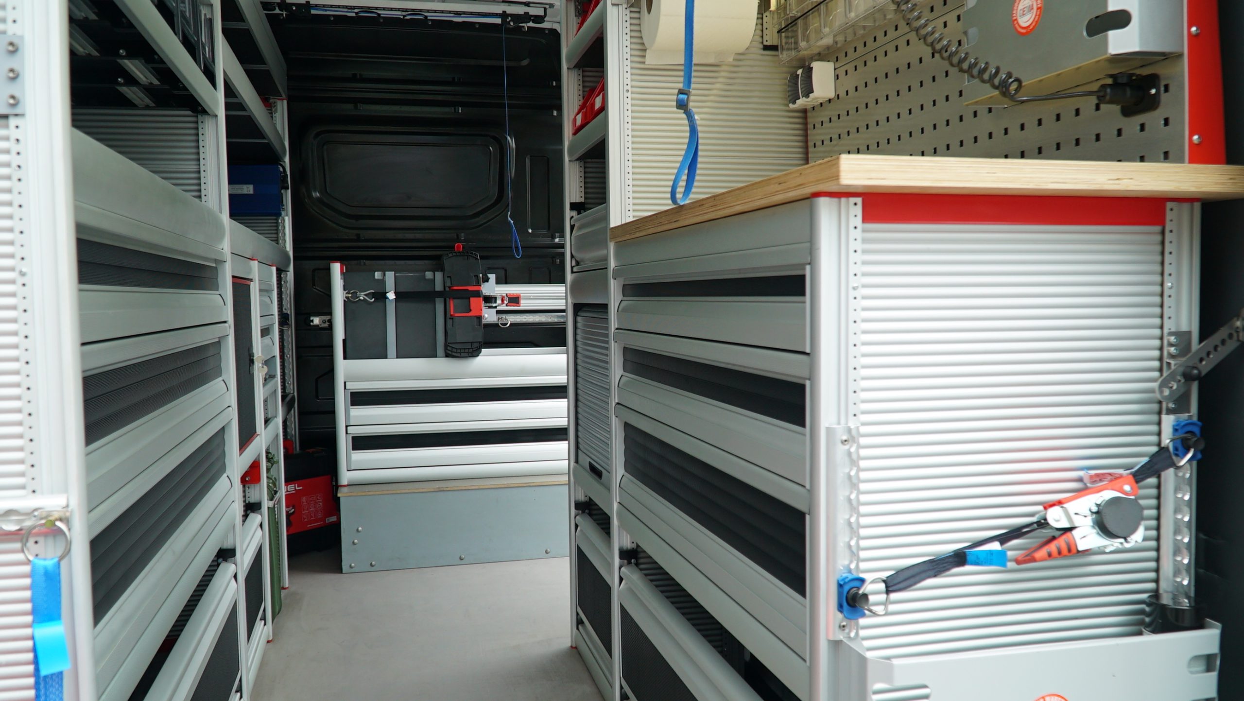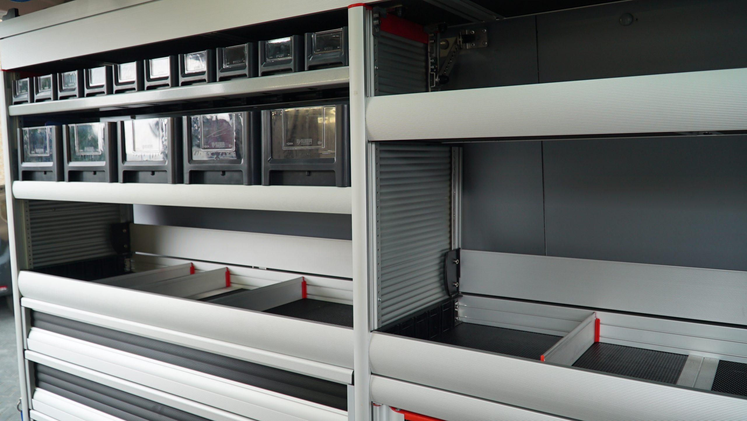 Zabudowa GEMA® została zaprojektowana tak, aby w pełni wykorzystać przestrzeń wewnątrz pojazdu. Regulowane półki i szuflady pozwalają na dowolne konfigurowanie wnętrza, a solidne separatory chronią narzędzia przed uszkodzeniem podczas transportu.